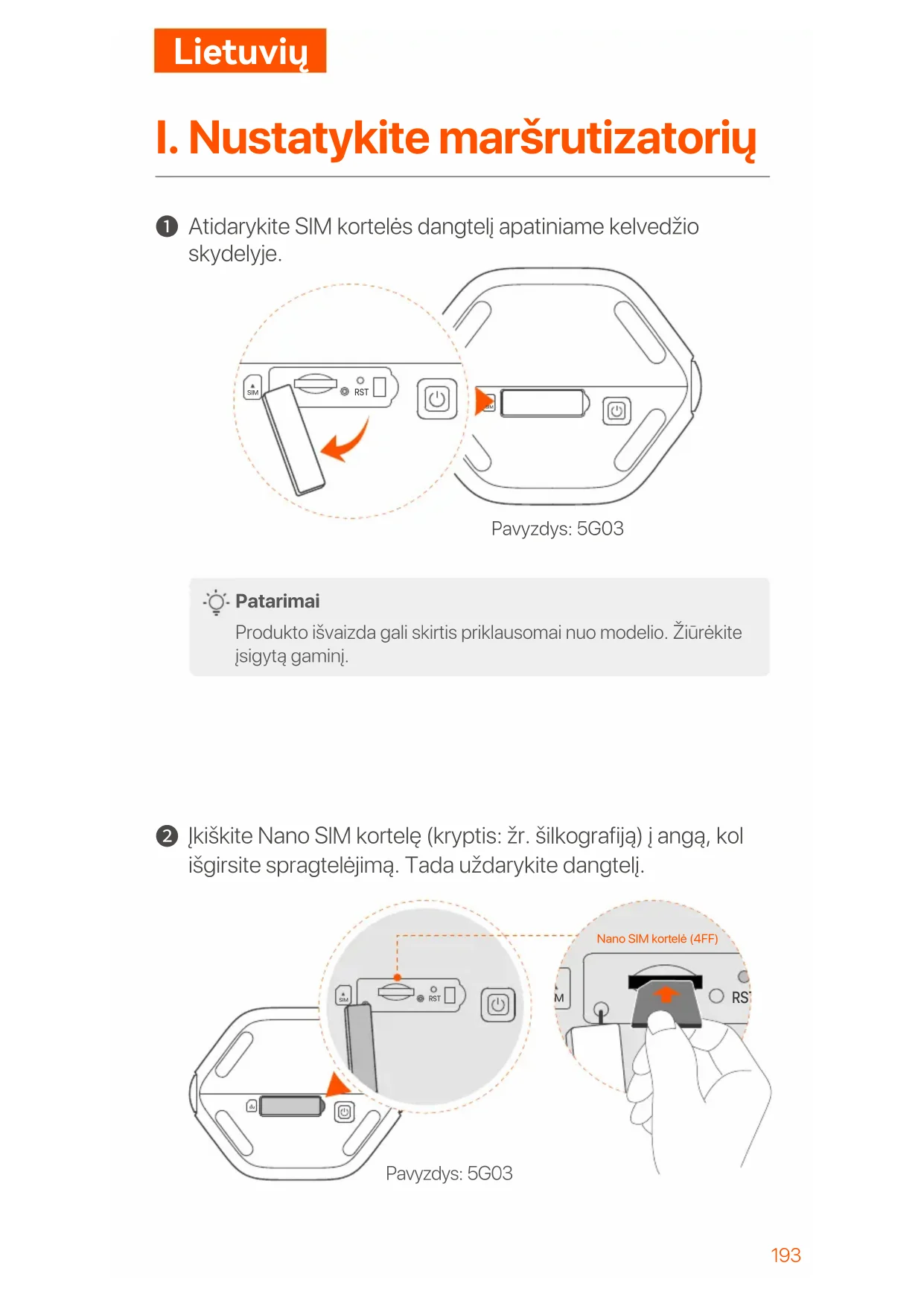 Įkiškite Nano SlM kortelę (kryptis: žr. šilkografiją) į angą, kol išgirsite spragtelėjimą. Tada uždarykite dangtelį. SIM SIM RST Pavyzdys: 5G03 SIM SIM RST SIM RST Nano SIM kortelė (4FF) Pavyzdys: 5G03194 Patarimai Produkto išvaizda gali skirtis atsižvelgiant į modelius. Žiūrėkite įsigytą gaminį. Kad užtikrintumėte veikimą ir išvengtumėte SIM kortelės sugadinimo, neįdėkite ir neišimkite SIM kortelės, kai maršruto parinktuvas veikia. Norėdami išimti SIM kortelę, švelniai spauskite SIM kortelę, kol ji spragtels. SIM kortelė automatiškai iššoks.