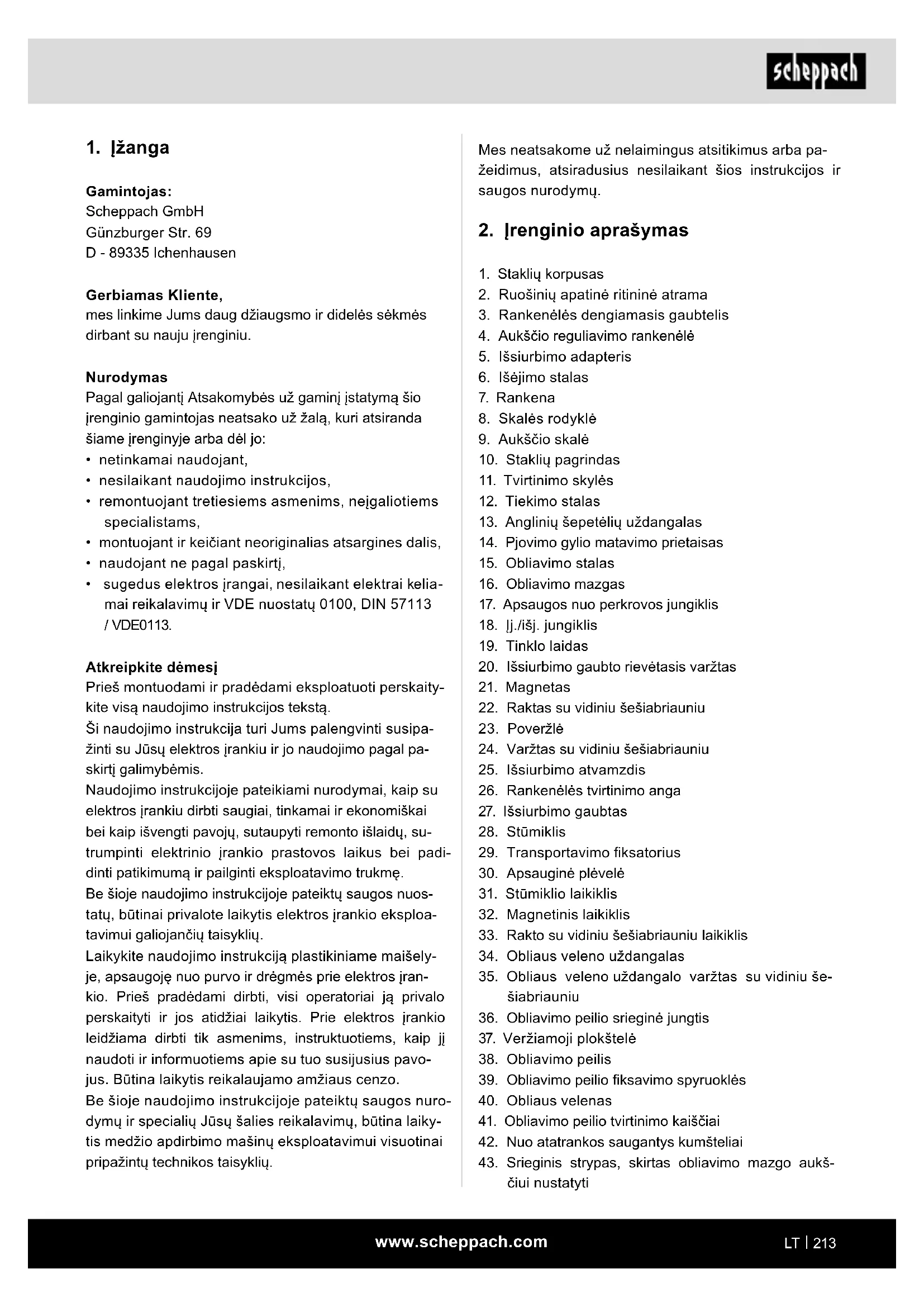 Gamintojas: Scheppach GmbH Günzburger Str. 69 D - 89335 Ichenhausen Gerbiamas Kliente, mes linkime Jums daug džiaugsmo ir didelės sėkmės dirbant su nauju įrenginiu. Nurodymas Pagal galiojantį Atsakomybės už gaminį įstatymą šio įrenginio gamintojas neatsako už žalą, kuri atsiranda šiame įrenginyje arba dėl jo:
