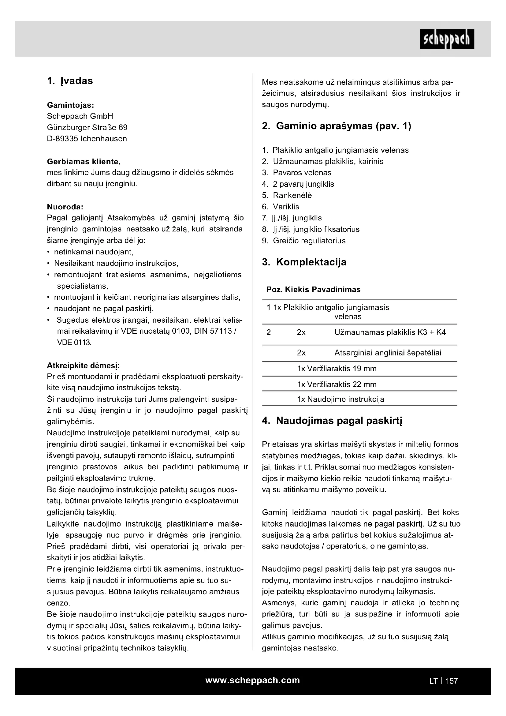 Prietaisas yra skirtas maišyti skystas ir miltelių formos statybines medžiagas, tokias kaip dažai, skiedinys, kli- jai, tinkas ir t.t. Priklausomai nuo medžiagos konsisten- cijos ir maišymo kiekio reikia naudoti tinkamą maišytu- vą su atitinkamu maišymo poveikiu. Gaminį leidžiama naudoti tik pagal paskirtį. Bet koks kitoks naudojimas laikomas ne pagal paskirtį. Už su tuo susijusią žalą arba patirtus bet kokius sužalojimus at- sako naudotojas / operatorius, o ne gamintojas. Naudojimo pagal paskirtį dalis taip pat yra saugos nu- rodymų, montavimo instrukcijos ir naudojimo instrukci- joje pateiktų eksploatavimo nurodymų laikymasis. Asmenys, kurie gaminį naudoja ir atlieka jo techninę priežiūrą, turi būti su ja susipažinę ir informuoti apie galimus pavojus. Atlikus gaminio modikacijas, už su tuo susijusią žalą gamintojas neatsako.www.scheppach.com