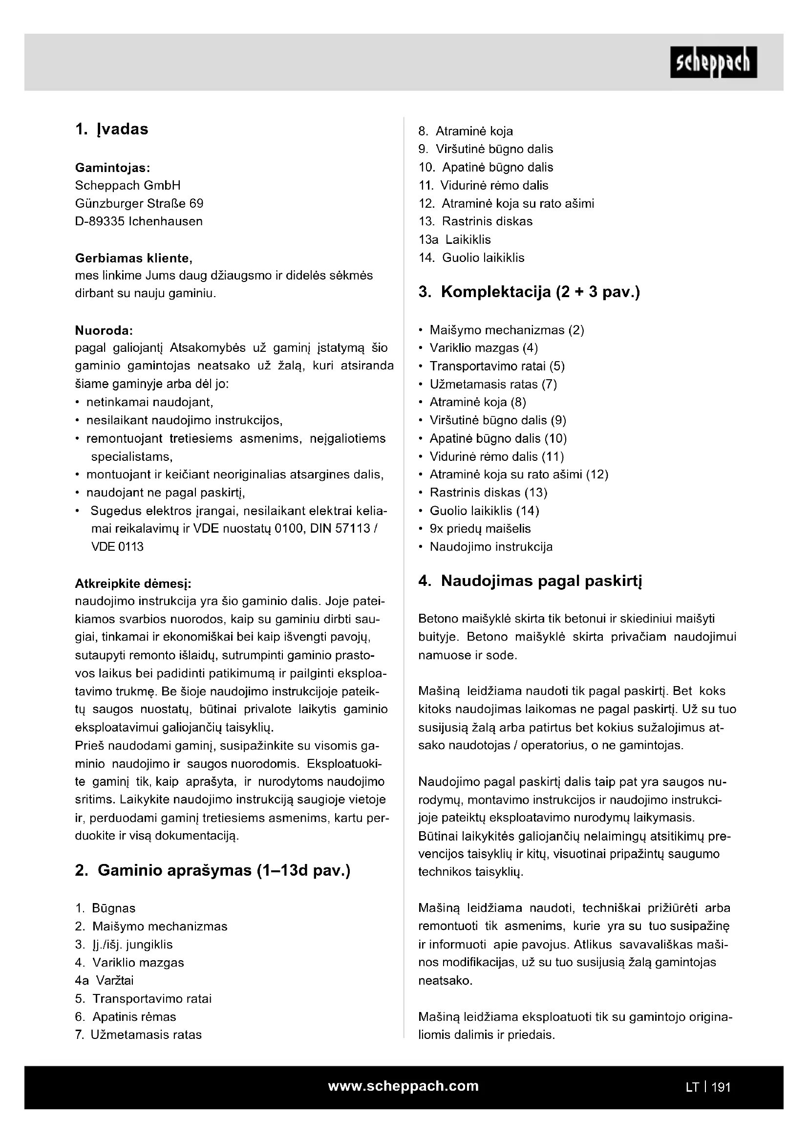 Gamintojas: Scheppach GmbH Günzburger Straße 69 D-89335 Ichenhausen Gerbiamas kliente, mes linkime Jums daug džiaugsmo ir didelės sėkmės dirbant su nauju gaminiu. Nuoroda: pagal galiojantį Atsakomybės už gaminį įstatymą šio gaminio gamintojas neatsako už žalą, kuri atsiranda šiame gaminyje arba dėl jo: