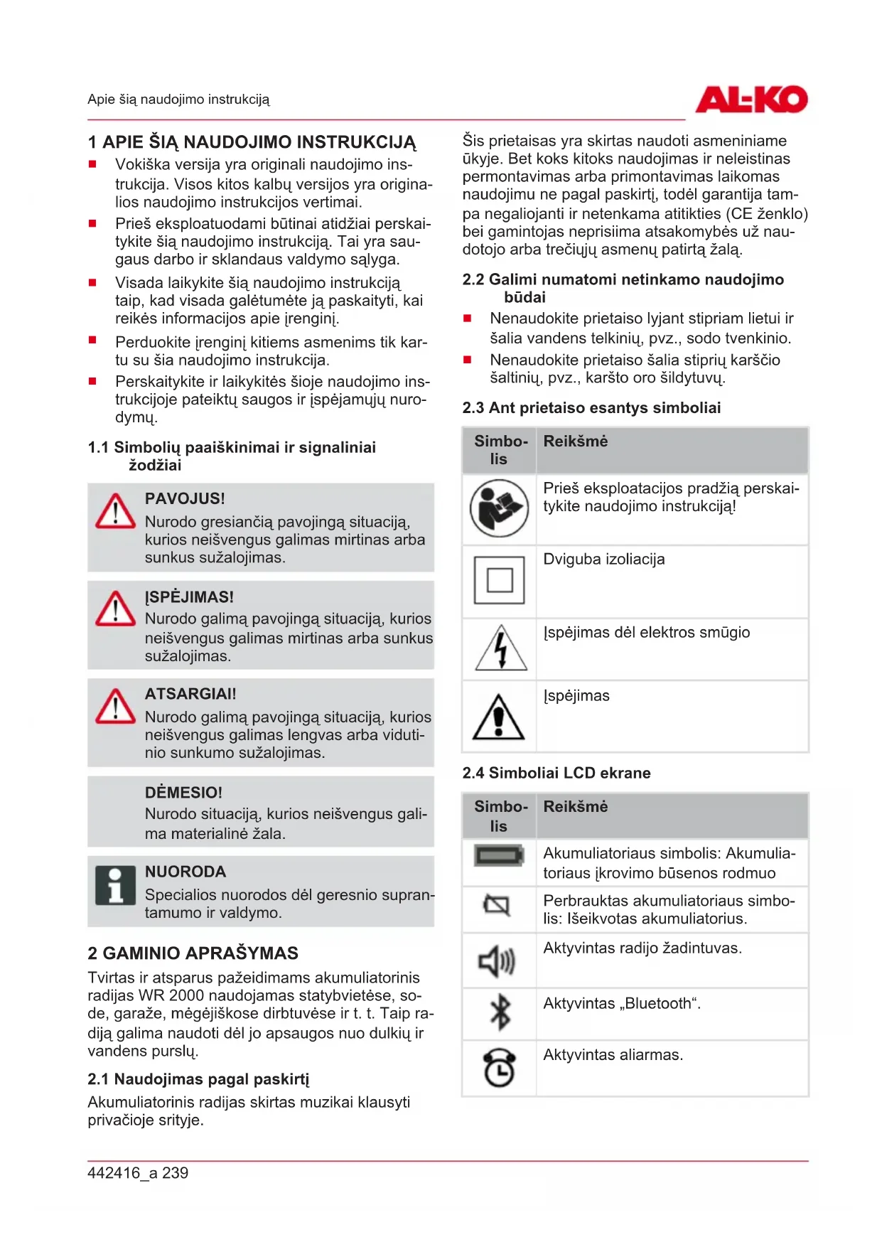 Simbo- lis Reikšmė Akumuliatoriaus simbolis: Akumulia- toriaus įkrovimo būsenos rodmuo Perbrauktas akumuliatoriaus simbo- lis: Išeikvotas akumuliatorius. Aktyvintas radijo žadintuvas. Aktyvintas „Bluetooth“. Aktyvintas aliarmas.LT 240 WR 2000 Saugos nuorodos