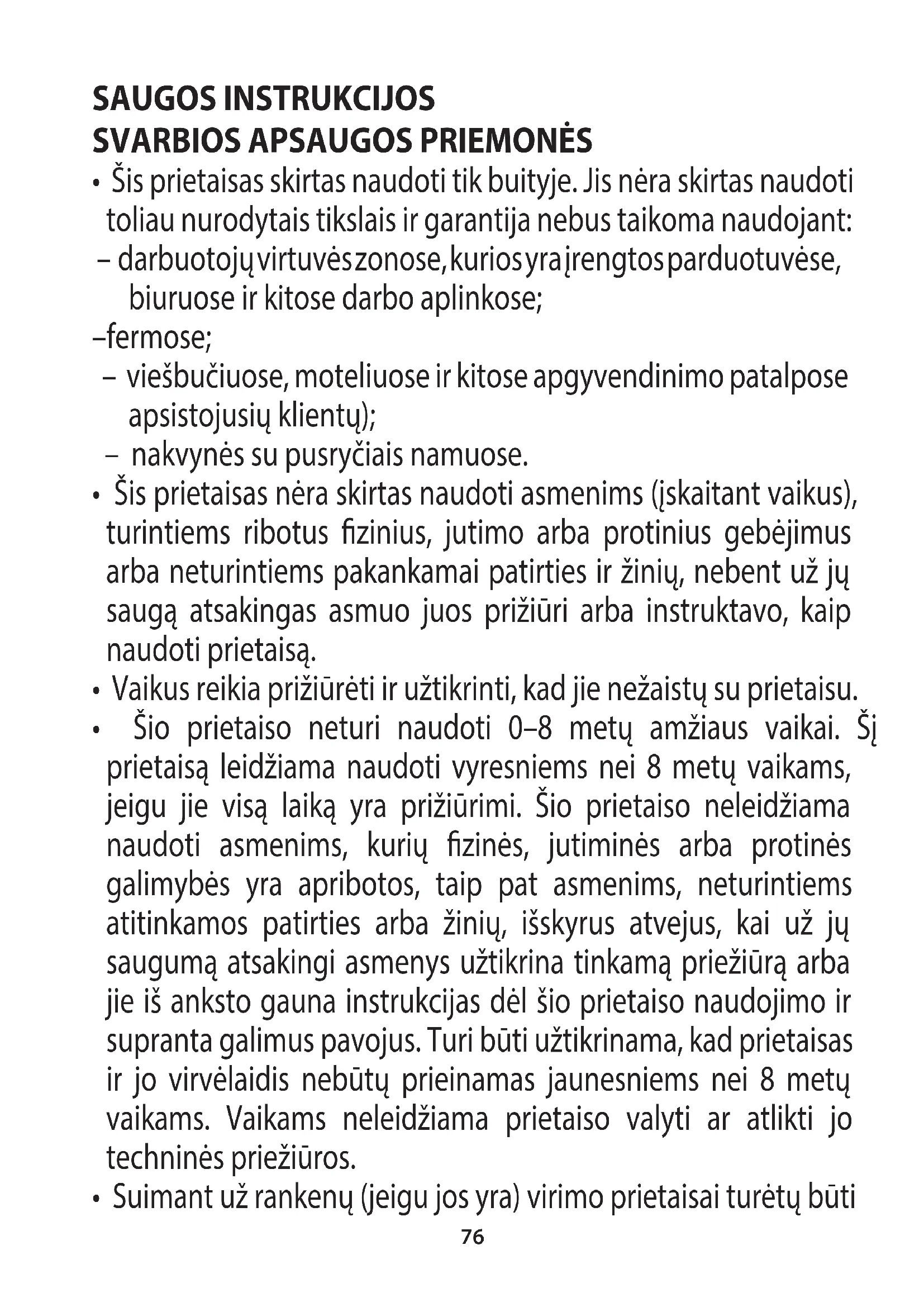 Sio prietaiso neturi naudoti 0-8 metu amziaus vaikai. Šj prietaisā leidžiama naudoti vyresniems nei 8 metu vaikams, jeigu jie visa laika yra prižiūrimi. Sio prietaiso neleidžiama naudoti asmenims, kuriu fizines, jutiminès arba protinès galimybès yra apribotos, taip pat asmenims, neturintiems atitinkamos patirties arbaŽiniu, išskyrus atvejus, kai už ju saugumā atsakingo asmenys užtikrina tinkamā priežiūrā arba jie iš anksto gauna instrukcijas del šio prietaiso naudojimo ir supranta galimus pavojus. Turi buti užtikrinama, kad prietaisas ir jo virvëlaeidis nebuteu prieinamas jaunesniems nei 8 metu vaikams. Vaikams neleidžiama prietaiso valyti ar atlikti jo techninès priežiūros.