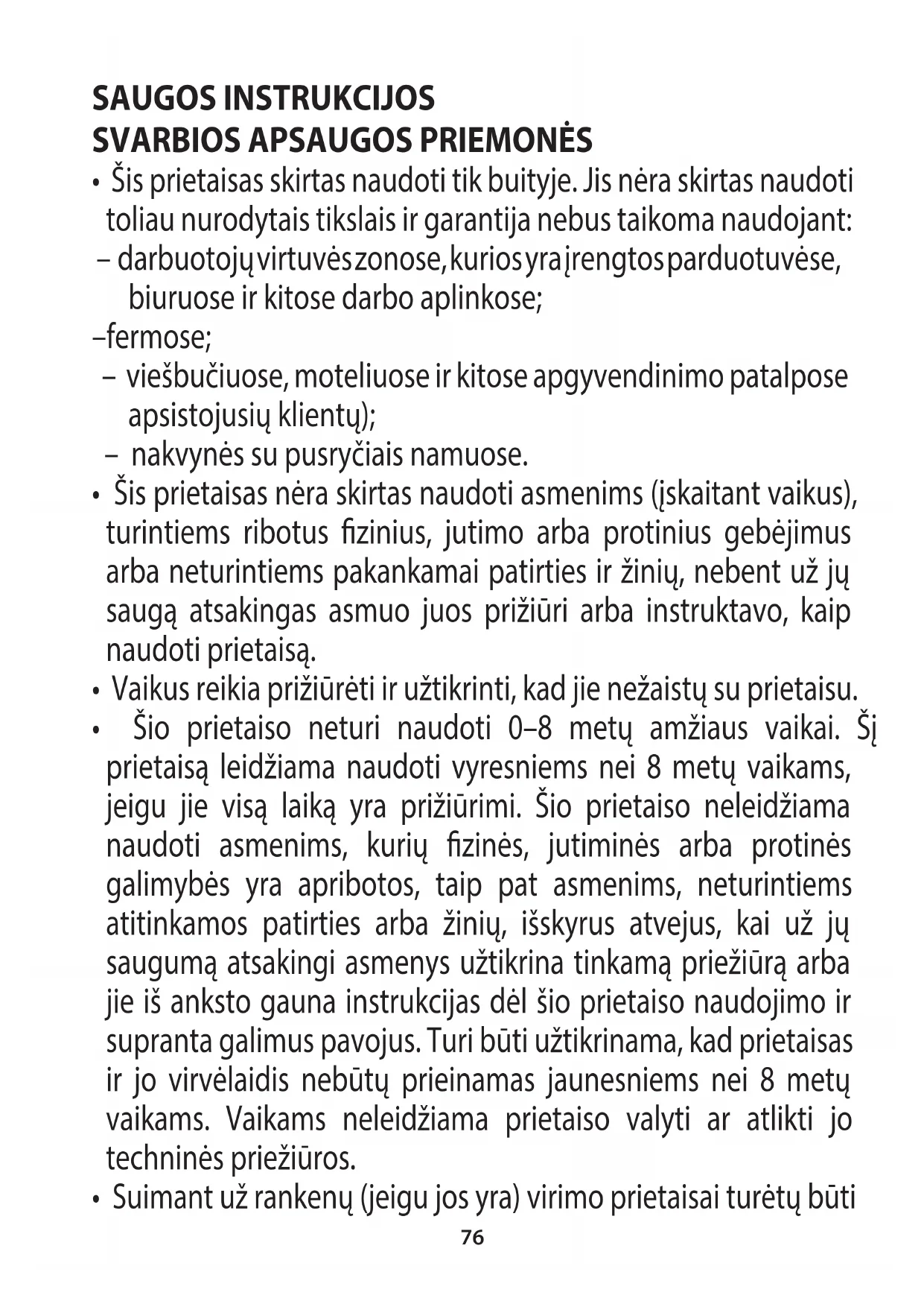 - Šio prietaiso neturi naudoti 0–8 metų amžiaus vaikai. Šį prietaisą leidžiama naudoti vyresniems nei 8 metų vaikams, jeigu jie visą laiką yra prižiūrimi. Šio prietaiso neleidžiama naudoti asmenims, kurių zinės, jutiminės arba protinės galimybės yra apribotos, taip pat asmenims, neturintiems atitinkamos patirties arba žinių, išskyrus atvejus, kai už jų saugumą atsakingi asmenys užtikrina tinkamą priežiūrą arba jie iš anksto gauna instrukcijas dėl šio prietaiso naudojimo ir supranta galimus pavojus. Turi būti užtikrinama, kad prietaisas ir jo virvėlaidis nebūtų prieinamas jaunesniems nei 8 metų vaikams. Vaikams neleidžiama prietaiso valyti ar atlikti jo techninės priežiūros.