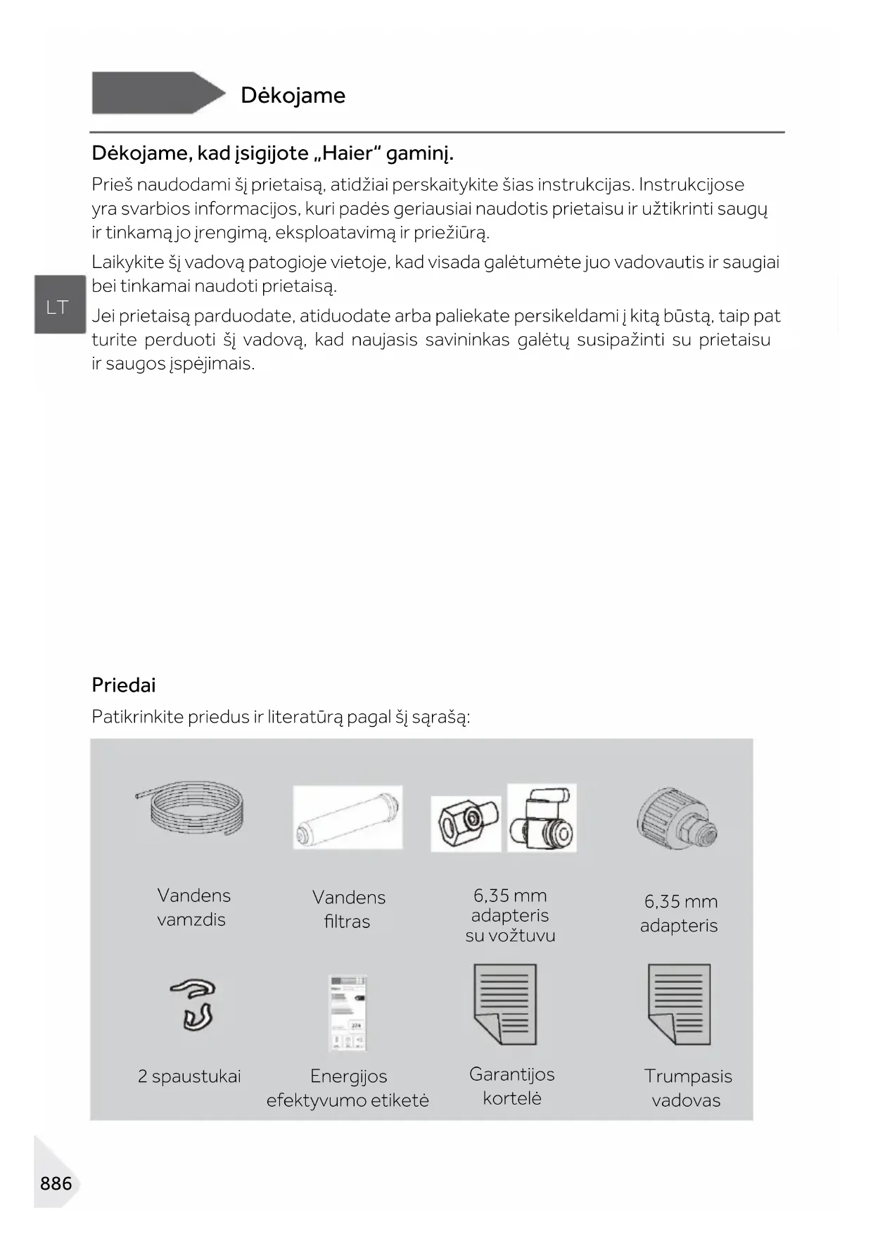 Dėkojame, kad įsigijote „Haier“ gaminį. Prieš naudodami šį prietaisą, atidžiai perskaitykite šias instrukcijas. Instrukcijose yra svarbios informacijos, kuri padės geriausiai naudotis prietaisu ir užtikrinti saugų ir tinkamą jo įrengimą, eksploatavimą ir priežiūrą. Laikykite šį vadovą patogioje vietoje, kad visada galėtumėte juo vadovautis ir saugiai bei tinkamai naudoti prietaisą. Jei prietaisą parduodate, atiduodate arba paliekate persikeldami į kitą būstą, taip pat turite perduoti šį vadovą, kad naujasis savininkas galėtų susipažinti su prietaisu ir saugos įspėjimais. Priedai Patikrinkite priedus ir literatūrą pagal šį sąrašą: Vandens vamzdis Vandens ltras 6,35 mm adapteris su vožtuvu 6,35 mm adapteris 2 spaustukai Energijos efektyvumo etiketė Garantijos kortelė Trumpasis vadovasSaugos informacija