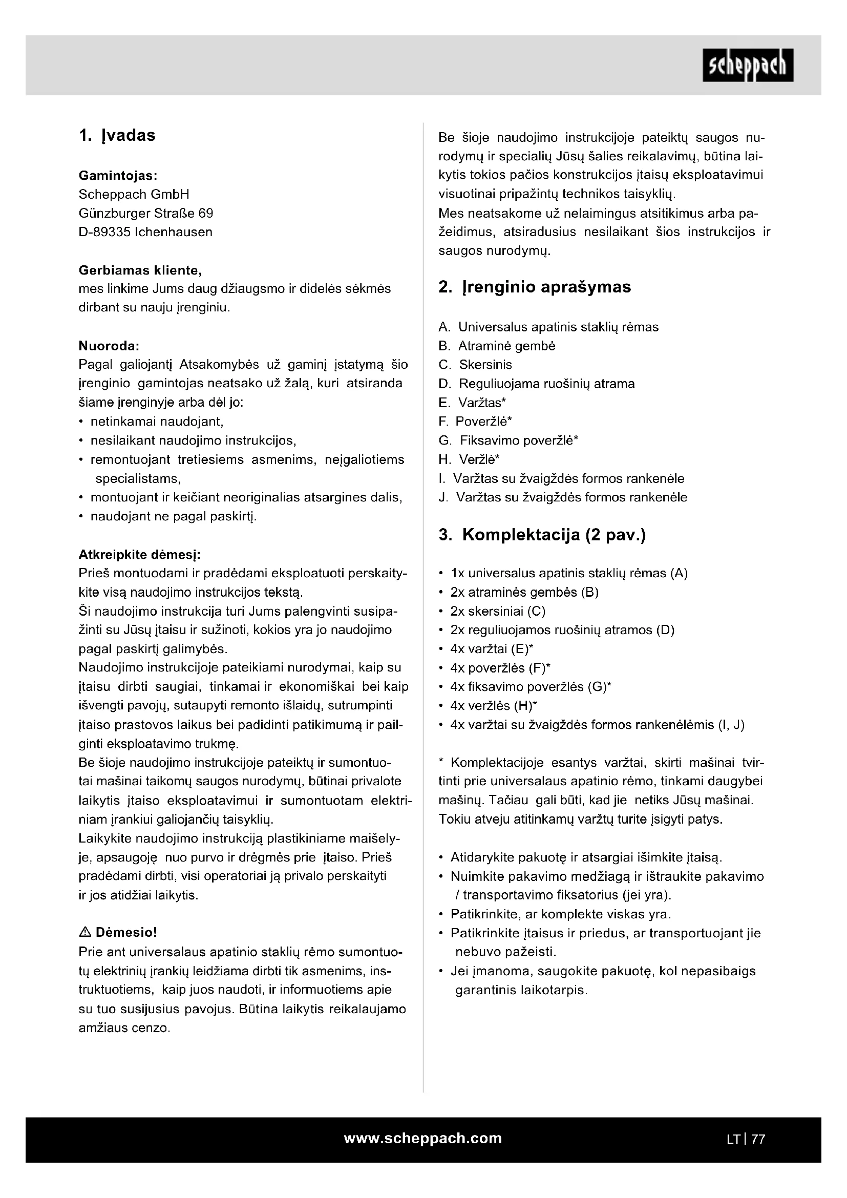 Gamintojas: Scheppach GmbH Günzburger Straße 69 D-89335 Ichenhausen Gerbiamas kliente, mes linkime Jums daug džiaugsmo ir didelės sėkmės dirbant su nauju įrenginiu. Nuoroda: Pagal galiojantį Atsakomybės už gaminį įstatymą šio įrenginio gamintojas neatsako už žalą, kuri atsiranda šiame įrenginyje arba dėl jo: