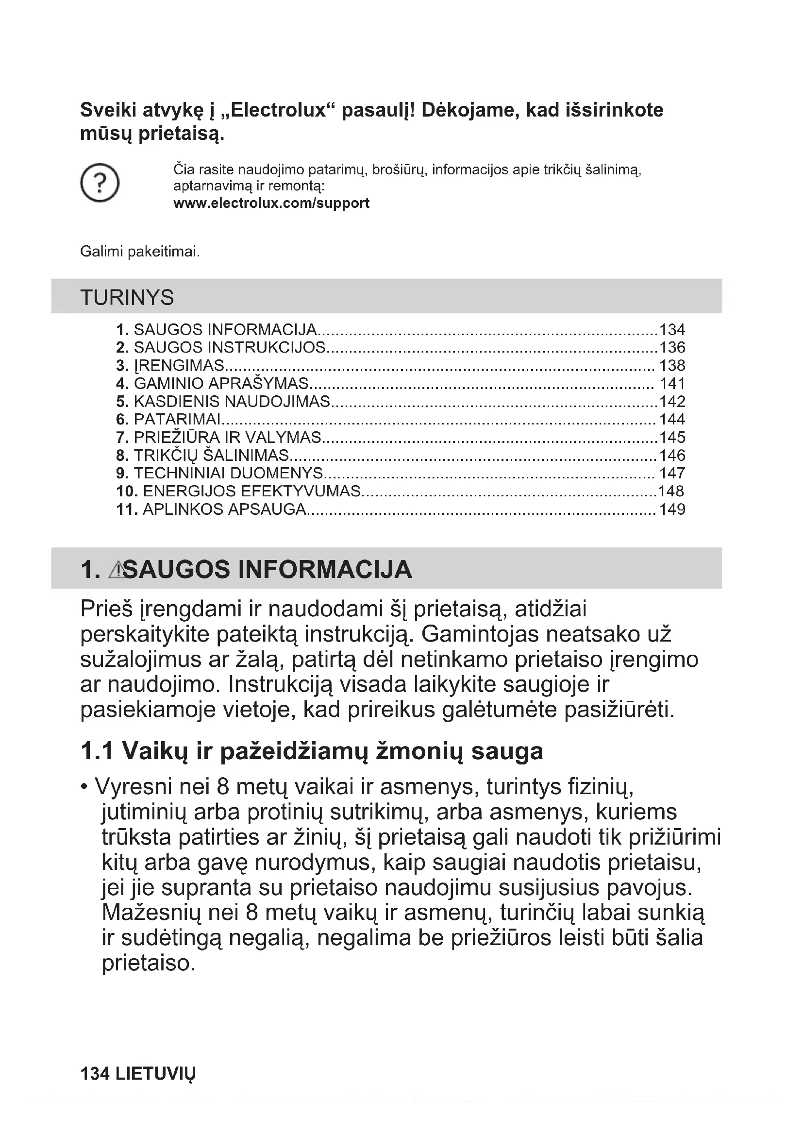 - Vyresni nei 8 metų vaikai ir asmenys, turintys fizinių, jutiminių arba protinių sutrikimų, arba asmenys, kuriems trūksta patirties ar žinių, šį prietaisą gali naudoti tik prižiūrimi kitų arba gavę nurodymus, kaip saugiai naudotis prietaisu, jei jie supranta su prietaiso naudojimu susijusius pavojus. Mažesnių nei 8 metų vaikų ir asmenų, turinčių labai sunkią ir sudėtingą negalią, negalima be priežiūros leisti būti šalia prietaiso. 134 LIETUVIŲ• Nuolat prižiūrėkite vaikus ir pasirūpinkite, kad jie nežaistų su šiuo buitiniu prietaisu.