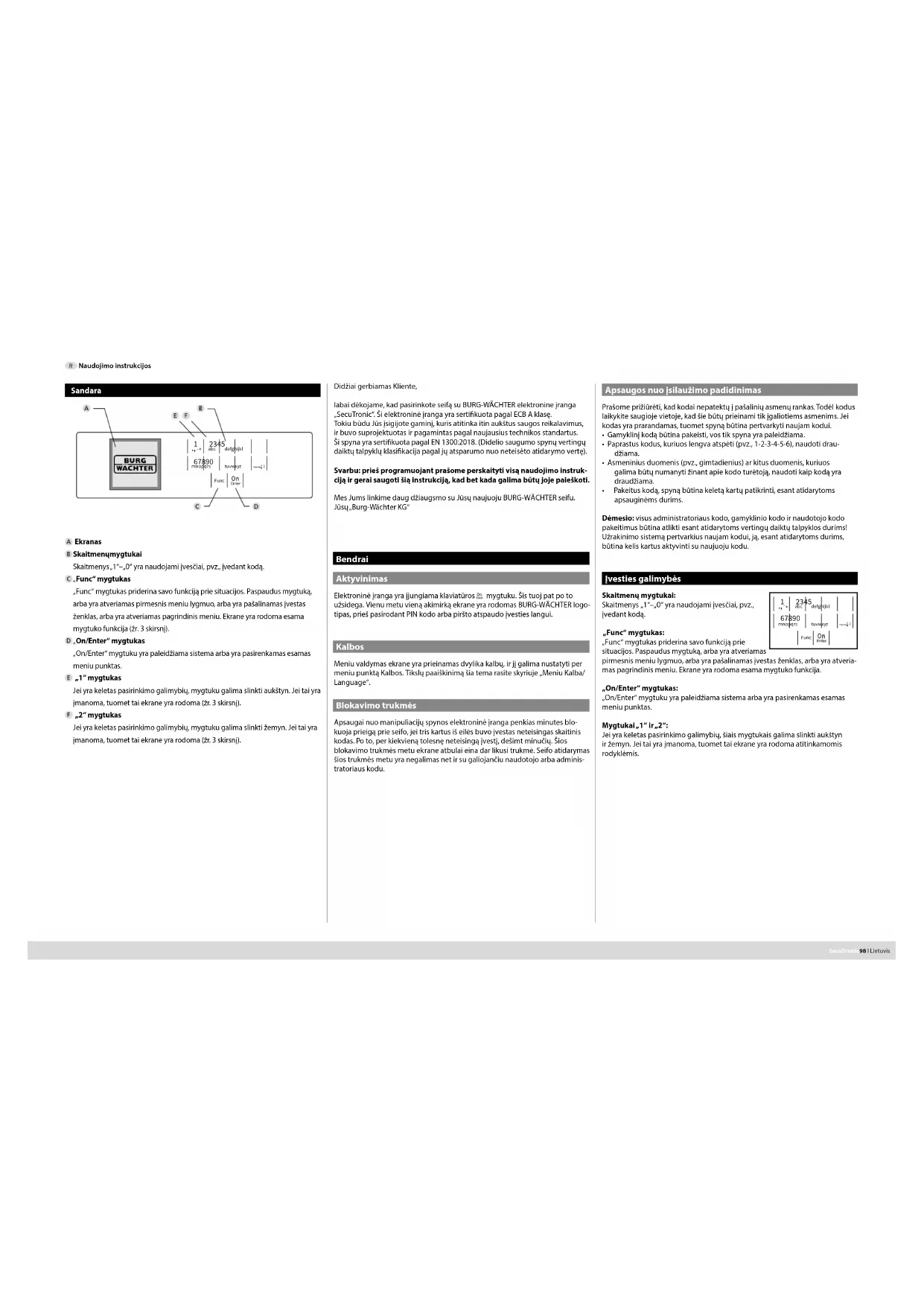 Naudojimo instrukcijos Ekranas Skaitmenų mygtukai Skaitmenys „1“–„0“ yra naudojami įvesčiai, pvz., įvedant kodą. „Func“ mygtukas „Func“ mygtukas priderina savo funkciją prie situacijos. Paspaudus mygtuką, arba yra atveriamas pirmesnis meniu lygmuo, arba yra pašalinamas įvestas ženklas, arba yra atveriamas pagrindinis meniu. Ekrane yra rodoma esama mygtuko funkcija (žr. 3 skirsnį). „On/Enter“ mygtukas „On/Enter“ mygtuku yra paleidžiama sistema arba yra pasirenkamas esamas meniu punktas. „1“ mygtukas Jei yra keletas pasirinkimo galimybių, mygtuku galima slinkti aukštyn. Jei tai yra įmanoma, tuomet tai ekrane yra rodoma (žr. 3 skirsnį). „2“ mygtukas Jei yra keletas pasirinkimo galimybių, mygtuku galima slinkti žemyn. Jei tai yra įmanoma, tuomet tai ekrane yra rodoma (žr. 3 skirsnį). Sandara Didžiai gerbiamas Kliente, labai dėkojame, kad pasirinkote seifą su BURG-WÄCHTER elektronine įranga „SecuTronic“. Ši elektroninė įranga yra sertikuota pagal ECB A klasę. Tokiu būdu Jūs įsigijote gaminį, kuris atitinka itin aukštus saugos reikalavimus, ir buvo suprojektuotas ir pagamintas pagal naujausius technikos standartus. Ši spyna yra sertikuota pagal EN 1300:2018. (Didelio saugumo spynų vertingų daiktų talpyklų klasikacija pagal jų atsparumo nuo neteisėto atidarymo vertę). Svarbu: prieš programuojant prašome perskaityti visą naudojimo instruk- ciją ir gerai saugoti šią instrukciją, kad bet kada galima būtų joje paieškoti. Mes Jums linkime daug džiaugsmo su Jūsų naujuoju BURG-WÄCHTER seifu. Jūsų „Burg-Wächter KG“ Aktyvinimas Kalbos Elektroninė įranga yra įjungiama klaviatūros