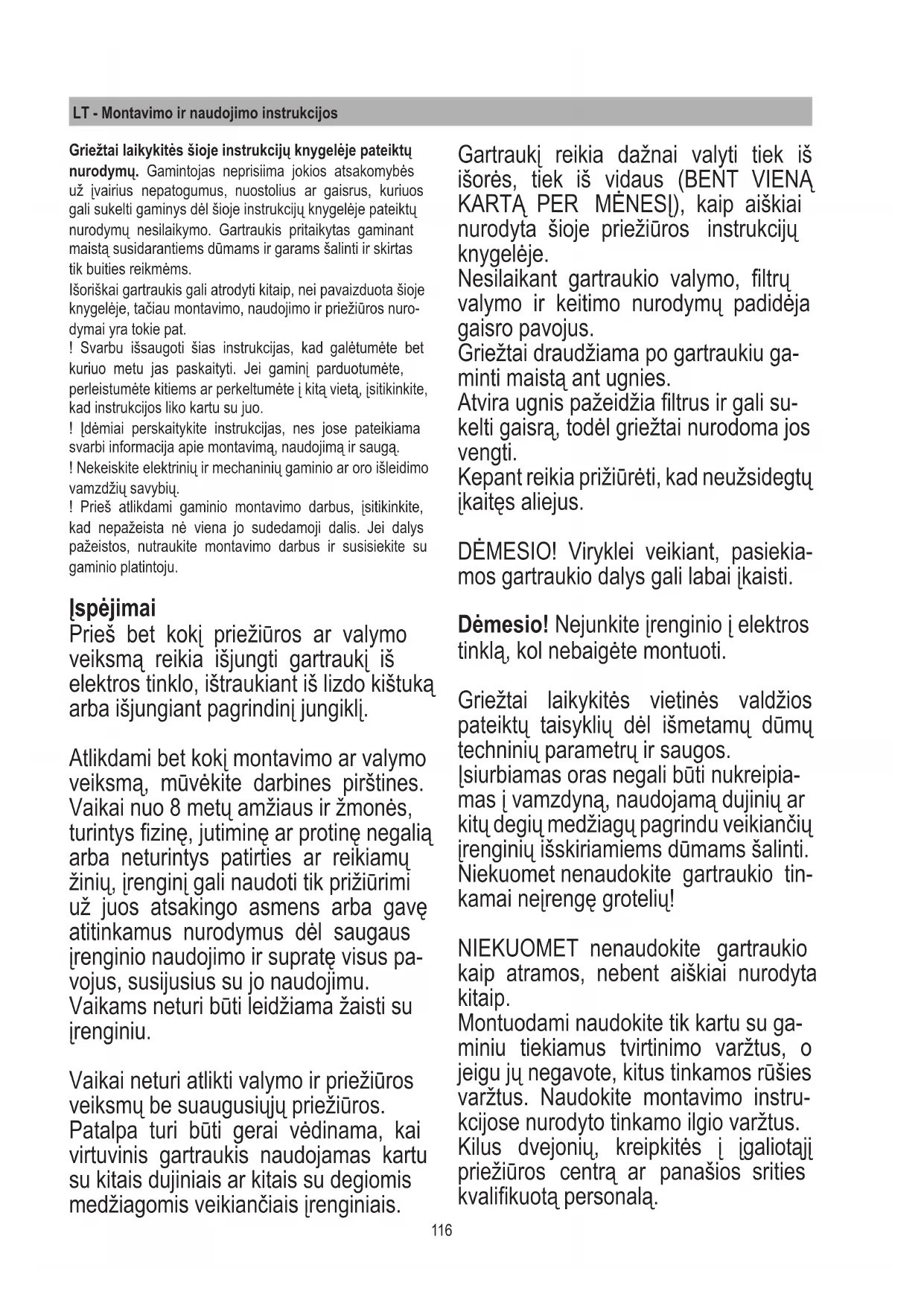 - Kinnitage õhupuhasti kapi sisemusse, kasutades komplektis olevaid kinnitu- stugesid (joonis 3). Kinnitage toed õhu- puhasti alaossa (joonis 4). Enne kruvi- de kinnitamist kapi külge kontrollige, et toode oleks tööpinnaga täpselt risti.115 Filtrite küllastumise näidik Õhupuhasti annab märku, kui on vaja ltreid hooldada. Rasvalter (u iga 40 kasutustunni järel): kõik sinised LED-tuled. Aktiivsöega lõhnalter (u iga 160 kasutustunni järel): kõik sinised LED-tuled, tuled L2 ja L3 vilguvad. Filtrite küllastumise näidiku nullimine Pärast ltrite hooldamist vajutage pikalt nuppe T1 ja T3. Tu- led L1, L2 ja L3 vilguvad lühikest aega siniselt ja seejärel kustuvad. Aktiivsöega lõhnaltri küllastumise näidiku aktiveeri- mine See näidik on tavaliselt deaktiveeritud. Näidiku aktiveerimi- seks toimige järgmiselt. Kui õhupuhasti on välja lülitatud, vajutage pikalt ja samaa- egselt nuppe T1 ja T2. Kõigepealt süttib tuli L1 ning seejärel ka L2 ja L3. Pärast vajutamise lõpetamist vilguvad L2 ja L3 lühikest aega, näidates, et aktiveerumine on toimunud. Söeltri küllastumise näidiku deaktiveerimine: korrake eespool kirjeldatud toimingut. Kõigepealt süttivad sama- aegselt tuled L1, L2 ja L3; pärast vajutamise lõpetamist tuled L2 ja L3 kustuvad, näidates, et deaktiveerumine on toimunud. HOOLDUS Rasvalter Eemaldab toiduvalmistamisel tekkivad rasvaosakesed. Puhastada kord kuus (või kui ltrite küllastumise näidik – juhul kui see on mudelil olemas – selleks märku annab) pehmetoimelise puhastusvahendiga kas käsitsi või madalal temperatuuril ja lühikese tsükliga nõudepesumasinas. Nõudepesumasinas pesemisel võib metallist rasvaltri värv tuhmuda, kuid selle ltreerimisomadused jäävad täielikult muutumatuks. Aktiivsöega lter (üksnes ltreerimisrežiimi korral) Eemaldab toiduvalmistamisel tekkiva ebameeldiva lõhna. Söeltri küllastumise aeg sõltub toiduvalmistamise viisist ja rasvaltri puhastamise korrapärasusest. Igal juhul tuleb ltrikassett asendada maksimaalselt iga nelja kuu tagant. Söeltrite paigaldamiseks tuleb rasvaltrid välja võtta (joo- nis 8). Kasutamine Toote normaalseks toimimiseks tuleb avada väljatõmmatav paneel, toimides järgmiselt. Vajutage klaasi allapoole, nagu on näi- datud joonisel 12. Klaas tuleb lahti ja tekib ava. Pärast väljatõmmatava paneeli avamist käivitage mootor, kasutades lülituspa- neeli allpool kirjeldatud viisil. Paneeli sulgemiseks toimige samamo- odi: vajutage klaasile, kuni paneel sul- gub täielikult. T1. T2. T3. Sisse- ja väljalülitamine ja taimer: vajutage ja valige automaatse väljalülitumise aeg: Võimsus 1: 20 minutit Võimsus 2: 15 minutit Võimsus 3: 10 minutit Intensiivne võimsus: 5 minutit Tõmbevõimsuse vähendamine OFF 1: vajutage korduvalt, et vähendada tõmbe- võimsust kuni õhupuhasti väljalülitumiseni OFF 2: vajutage pikalt mistahes võimsusel Tõmbevõimsuse suurendamine (1-2-3-Intensiivne) Intensiivne võimsus kestab u 5 minutit, misjärel lüli- tub automaatselt sisse võimsus 2.116 LT - Montavimo ir naudojimo instrukcijos Griežtai laikykitės šioje instrukcijų knygelėje pateiktų nurodymų. Gamintojas neprisiima jokios atsakomybės už įvairius nepatogumus, nuostolius ar gaisrus, kuriuos gali sukelti gaminys dėl šioje instrukcijų knygelėje pateiktų nurodymų nesilaikymo. Gartraukis pritaikytas gaminant maistą susidarantiems dūmams ir garams šalinti ir skirtas tik buities reikmėms. Išoriškai gartraukis gali atrodyti kitaip, nei pavaizduota šioje knygelėje, tačiau montavimo, naudojimo ir priežiūros nuro- dymai yra tokie pat. ! Svarbu išsaugoti šias instrukcijas, kad galėtumėte bet kuriuo metu jas paskaityti. Jei gaminį parduotumėte, perleistumėte kitiems ar perkeltumėte į kitą vietą, įsitikinkite, kad instrukcijos liko kartu su juo. ! Įdėmiai perskaitykite instrukcijas, nes jose pateikiama svarbi informacija apie montavimą, naudojimą ir saugą. ! Nekeiskite elektrinių ir mechaninių gaminio ar oro išleidimo vamzdžių savybių. ! Prieš atlikdami gaminio montavimo darbus, įsitikinkite, kad nepažeista nė viena jo sudedamoji dalis. Jei dalys pažeistos, nutraukite montavimo darbus ir susisiekite su gaminio platintoju. Įspėjimai Prieš bet kokį priežiūros ar valymo veiksmą reikia išjungti gartraukį iš elektros tinklo, ištraukiant iš lizdo kištuką arba išjungiant pagrindinį jungiklį. Atlikdami bet kokį montavimo ar valymo veiksmą, mūvėkite darbines pirštines. Vaikai nuo 8 metų amžiaus ir žmonės, turintys zinę, jutiminę ar protinę negalią arba neturintys patirties ar reikiamų žinių, įrenginį gali naudoti tik prižiūrimi už juos atsakingo asmens arba gavę atitinkamus nurodymus dėl saugaus įrenginio naudojimo ir supratę visus pa- vojus, susijusius su jo naudojimu. Vaikams neturi būti leidžiama žaisti su įrenginiu. Vaikai neturi atlikti valymo ir priežiūros veiksmų be suaugusiųjų priežiūros. Patalpa turi būti gerai vėdinama, kai virtuvinis gartraukis naudojamas kartu su kitais dujiniais ar kitais su degiomis medžiagomis veikiančiais įrenginiais. Gartraukį reikia dažnai valyti tiek iš išorės, tiek iš vidaus (BENT VIENĄ KARTĄ PER MĖNESĮ), kaip aiškiai nurodyta šioje priežiūros instrukcijų knygelėje. Nesilaikant gartraukio valymo, ltrų valymo ir keitimo nurodymų padidėja gaisro pavojus. Griežtai draudžiama po gartraukiu ga- minti maistą ant ugnies. Atvira ugnis pažeidžia ltrus ir gali su- kelti gaisrą, todėl griežtai nurodoma jos vengti. Kepant reikia prižiūrėti, kad neužsidegtų įkaitęs aliejus. DĖMESIO! Viryklei veikiant, pasiekia- mos gartraukio dalys gali labai įkaisti. Dėmesio! Nejunkite įrenginio į elektros tinklą, kol nebaigėte montuoti. Griežtai laikykitės vietinės valdžios pateiktų taisyklių dėl išmetamų dūmų techninių parametrų ir saugos. Įsiurbiamas oras negali būti nukreipia- mas į vamzdyną, naudojamą dujinių ar kitų degių 