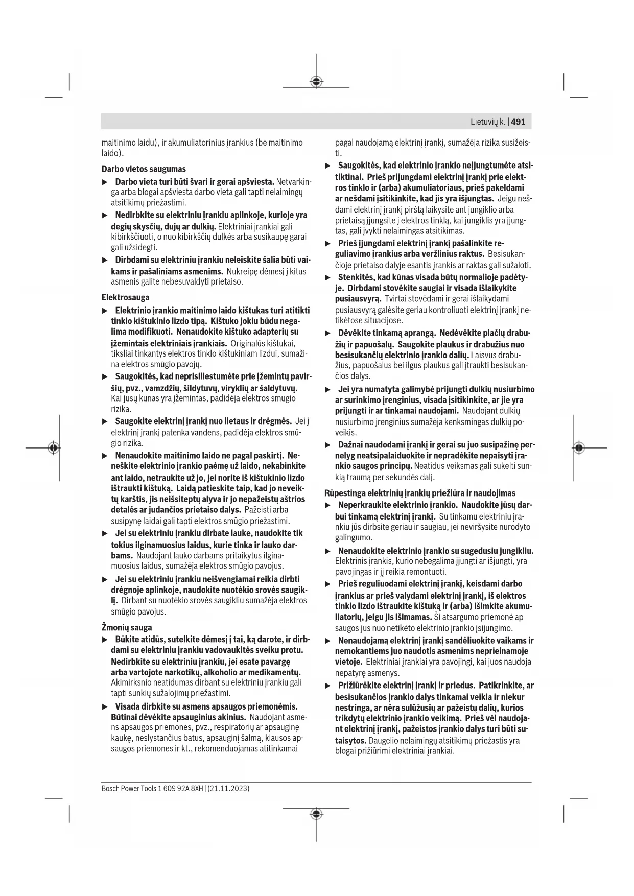Bluetooth® Low Energy ModuleGCY42 nav iekļauts standarta piegādes komplektā Savienojamības funkcijas (GWS18V-15 C / GWS18V-15 SC/ GWS18V-15 PSC) Savienojumā ar Bluetooth® Low Energy ModuleGCY42 (nav iekļauts standarta piegādes komplektā) elektroinstrumentam nodrošina šādu savienojamības funkciju pieejamību: – Reģistrācija un personalizēšana – Statusa pārbaude, brīdinājuma ziņojumu saņemšana Bosch Power Tools 1 609 92A 8XH | (21.11.2023)490 | Lietuvių k. – Vispārējas informācijas saņemšana un iestatījumi – Pārvaldība Lai iegūtu informāciju parBluetooth® Low Energy ModuleGCY42 (nav iekļauts standarta piegādes komplektā), lasiet atbilstošo apkalpošanas pamācību. Elektroinstrumentiem savienojuma izveidošanās ar lietotni ir jāapstiprina, nospiežot taustiņu griešanās ātruma priekšizvēlei (39) lietotāja interfeisā (4). Pie tam savienojumu pieprasa lietotne. Apkalpošana un apkope Apkalpošana un tīrīšana u Veicot jebkurus darbus ar elektroinstrumentu (piemēram, apkalpošanu, darbinstrumentu nomaiņu utt.), kā arī pirms tā transportēšanas vai uzglabāšanas vienmēr izņemiet no elektroinstrumenta akumulatoru. Ieslēdzēja nejauša nospiešana var izraisīt savainojumu. u Lai elektroinstruments darbotos droši un bez atteikumiem, regulāri tīriet tā korpusu un ventilācijas atveres. Rūpīgi glabājiet un uzmanīgi lietojiet elektroinstrumenta piederumus. Klientu apkalpošanas dienests un konsultācijas par lietošanu Klientu apkalpošanas dienests atbildēs uz Jūsu jautājumiem par izstrādājumu remontu un apkalpošanu, kā arī par to rezerves daļām. Kopsalikuma attēlus un informāciju par rezerves daļām Jūs varat atrast interneta vietnē: www.bosch-pt.com Bosch konsultantu grupa palīdzēs Jums vislabākajā veidā rast atbildes uz jautājumiem par mūsu izstrādājumiem un to piederumiem. Pieprasot konsultācijas un pasūtot rezerves daļas, noteikti paziņojiet 10zīmju izstrādājuma numuru, kas norādīts uz izstrādājuma marķējuma plāksnītes. Latvijas Republika Robert Bosch SIA Bosch elektroinstrumentu servisa centrs Mūkusalas ielā 97 LV-1004 Rīga Tālr.: 67146262 Telefakss: 67146263 E-pasts: service-pt@lv.bosch.com Papildu klientu apkalpošanas dienesta adreses skatiet šeit: www.bosch-pt.com/serviceaddresses Transportēšana Ieteicamajiem litija jonu akumulatoriem ir piemērojami Bīstamo kravu aprites likuma noteikumi. Lietotājs var transportēt akumulatorus ielu transporta plūsmā bez papildu nosacījumiem. Pārsūtot tos ar trešo personu starpniecību (piemēram, ar gaisa transporta vai citu transporta aģentūru starpniecību), jāievēro īpaši sūtījuma iesaiņošanas un marķēšanas noteikumi. Tāpēc sūtījumu sagatavošanas laikā jāpieaicina bīstamo kravu pārvadāšanas speciālists. Pārsūtiet akumulatoru tikai tad, ja tā korpuss nav bojāts. Aizlīmējiet vaļējos akumulatora kontaktus un iesaiņojiet akumulatoru tā, lai tas iesaiņojumā nepārvietotos. Lūdzam ievērot arī ar akumulatoru pārsūtīšanu saistītos nacionālos noteikumus, ja tādi pastāv. Atbrīvošanās no nolietotajiem izstrādājumiem Nolietotie elektroinstrumenti, akumulatori, piederumi un iesaiņojuma materiāli jāpakļauj otrreizējai pārstrādei apkārtējai videi nekaitīgā veidā. Neizmetiet nolietotos elektroinstrumentus, akumulatorus un baterijas sadzīves atkritumu tvertnē! Tikai EK valstīm. Saskaņā ar Eiropas Savienības direktīvu 2012/19/ES par nolietotajām elektriskajām un elektroniskajām ierīcēm un šīs direktīvas atspoguļojumiem nacionālajā likumdošanā, lietošanai nederīgi elektroinstrumenti un saskaņā ar Eiropas Savienības direktīvu 2006/66/EK, bojāti vai izlietoti akumulatori/baterijas ir jāsavāc atsevišķi un jānogādā otrreizējai pārstrādei apkārtējai videi nekaitīgā veidā. Ja elektriskās un elektroniskās ierīces netiek atbilstoši utilizētas, tās var kaitēt videi un cilvēku veselībai iespējamās bīstamo vielu klātbūtnes dēļ. Akumulatori/baterijas: Litija-jonu: Lūdzam ievērot sadaļā "Transportēšana" sniegtos norādījumus (skatīt „Transportēšana“, Lappuse490). Lietuvių k. Saugos nuorodos Bendrosios saugos nuorodos dirbantiems su elektriniais įrankiais ĮSPĖJIMAS Perskaitykite visus su šiuo elektri- niu įrankiu pateikiamus saugos įspėjimus, instrukcijas, peržiūrėkite iliustracijas ir speci- fikacijas. Jei nepaisysite visų žemiau pateiktų instrukcijų, galite patirti elektros smūgį, sukelti gaisrą ir sunkiai susižaloti arba sužaloti kitus asmenis. Išsaugokite šias saugos nuorodas ir reikalavimus, kad ir ateityje galėtumėte jais pasinaudoti. Toliau pateiktame tekste vartojama sąvoka „Elektrinis įra- nkis“ apibūdina įrankius, maitinamus iš elektros tinklo (su 1 609 92A 8XH | (21.11.2023) Bosch Power ToolsLietuvių k. | 491 maitinimo laidu), ir akumuliatorinius įrankius (be maitinimo laido). Darbo vietos saugumas u Darbo vieta turi būti švari ir gerai apšviesta. Netvarkin- ga arba blogai apšviesta darbo vieta gali tapti nelaimingų atsitikimų priežastimi. u Nedirbkite su elektriniu įrankiu aplinkoje, kurioje yra degių skysčių, dujų ar dulkių. Elektriniai įrankiai gali kibirkščiuoti, o nuo kibirkščių dulkės arba susikaupę garai gali užsidegti. u Dirbdami su elektriniu įrankiu neleiskite šalia būti vai- kams ir pašaliniams asmenims. Nukreipę dėmesį į kitus asmenis galite nebesuvaldyti prietaiso. Elektrosauga u Elektrinio įrankio maitinimo laido kištukas turi atitikti tinklo kištukinio lizdo tipą. Kištuko jokiu būdu nega- lima modifikuoti. Nenaudokite kištuko adapterių su įžemintais elektriniais įrankiais. Originalūs kištukai, tiksliai tinkantys elektros tinklo kištukiniam lizdui, sumaži- na elektros smūgio pavojų. u Saugokitės, kad neprisiliestumėte prie įžemintų pavir- šių, pvz., vamzdžių, šildytuvų, viryklių ar šaldytuvų. Kai jū
