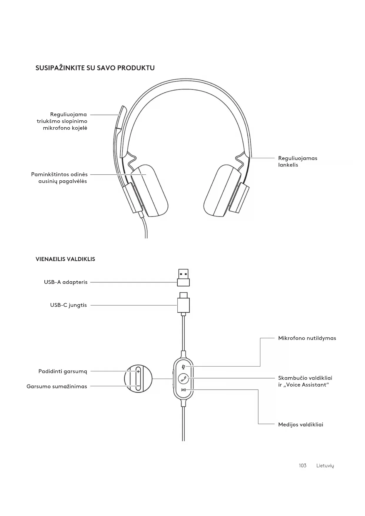 Ievades pretestība: 32omi Jutība (austiņas): 99 dB SPL/1 mW/1K Hz (“driver” līmenis) Jutība (mikrofons): primārais mikrofons: -48 dBV/Pa, sekundārais mikrofons: -40 dBV/Pa Frekvences diapazons (austiņu): 20–16kHz Frekvences diapazons (mikrofona): 100–16 kHz (“mic component” līmenis) Vada garums: 1,9mSUSIPAŽINKITE SU SAVO PRODUKTU Reguliuojamas lankelis Paminkštintos odinės ausinių pagalvėlės Reguliuojama triukšmo slopinimo mikrofono kojelė VIENAEILIS VALDIKLIS Mikrofono nutildymas Skambučio valdikliai ir„Voice Assistant“ Padidinti garsumą Garsumo sumažinimas USB-C jungtis USB-A adapteris Medijos valdikliai 103 LietuviųUSB-A USB-C