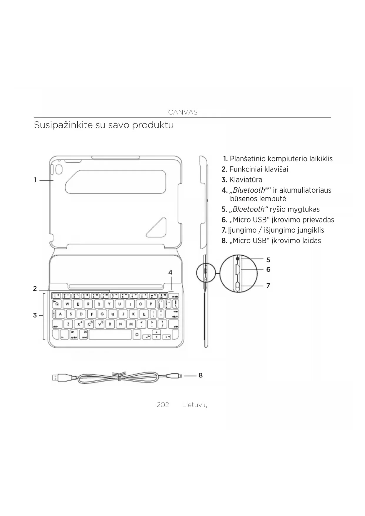 207 Lietuvių Būsenos ryšio indikatoriai Jūsų klaviatūros dėklo būsenos lemputė rodo informaciją apie klaviatūros baterijos įkrovąir„Bluetooth“ ryšį. Lemputė Aprašymas Žalia Baterija pakankamai įkrauta. Raudona Akumuliatorius išsikrauna (mažiau nei 10%). Įkraukiteakumuliatorių. Mirksi mėlyna Greitai: Klaviatūra veikia aptikimo režimu, pasiruošusi būti suporuota. Lėtai: Klaviatūra bando vėl prisijungti prie jūsų „iPad“ prietaiso. Mėlyna „Bluetooth“ suporavimas arba pakartotinis prijungimas buvo sėkmingas.CANVAS 208 Lietuvių Funkciniai klavišai Fn + 1 = užrakinti ekraną Užrakina arba atrakina „iPadmini“ ekraną Fn + 2 = „Siri“ Naudokite savo balso komandas norėdami siųsti pranešimus, suplanuoti susitikimus, skambinti ir kt. Fn + 3 = paieška Paleidžia „iPad mini“ paieškosfunkciją Fn + 4 = perjungti kalbą Perjungia klaviatūros kalbą Fn + 5 = virtuali klaviatūra Rodo / slepia virtualią klaviatūrą Fn + 6 = padaryti momentinę vaizdokopiją Fn + 7 = ankstesnis įrašas Fn + 8 = groti / sustabdyti Fn + 9 = kitas įrašas Fn + 0 = išjungti garsą Fn + brūkšnelis = patylinti Fn + pliusas = pagarsinti „Home“ (Pagrindinis) Rodo „iPad Mini“ „Home“ (Pagrindinį) ekraną Rodo „iPad mini“ „Home“ (Pagrindinį) ekraną Fn + X = iškirpti Fn + C = nukopijuoti Fn + V = įdėti Fn + kairysis žymeklis = pasirinktikairėje Pasirenka tekstą kairėje po žodį Fn + dešinysis žymeklis = pasirinktidešinėje Pasirenka tekstą dešinėje po žodį Fn + tarpas = Perjungti programą Pastaba: norėdami pasirinkti funkcijų mygtuką, nuspauskite ir laikykite mygtuką „Fn“, tada paspauskite mygtuką, nurodytą aukščiau.CANVAS 209 Lietuvių Klaviatūros akumuliatoriaus įkrovimas Jei baterijos būsenos lemputė dega raudonai, įkraukite klaviatūros dėklo akumuliatorių.