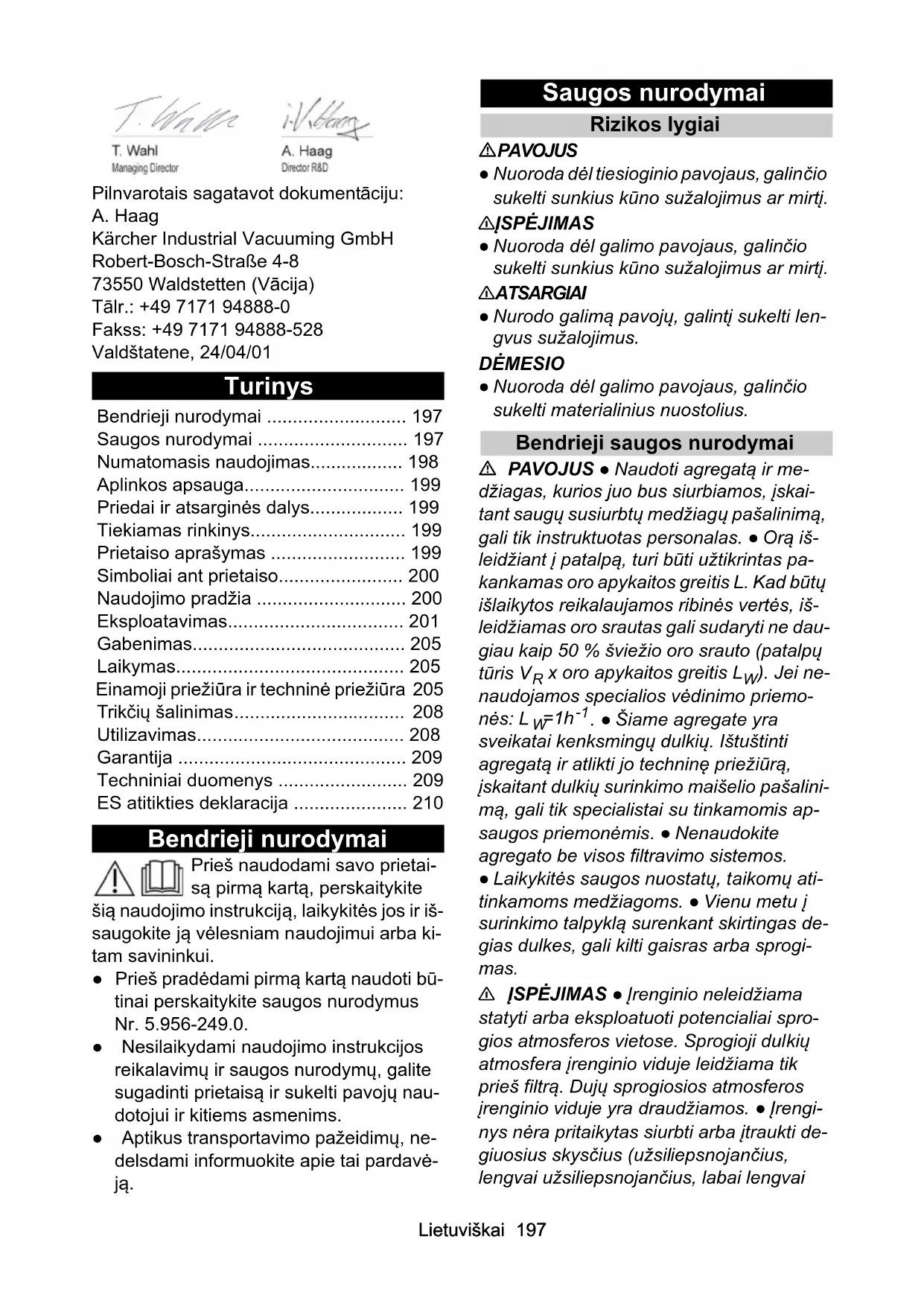 PAVOJUS · Naudoti aggregata ir medziagas, kurios juo bus siurbiamos, jskaitant saugu susiurbtu medziagu pašalinimagali tik instruktuotas personalias. · Ora isleidziant j patalpa, turi buti uztkrintas pa-kankamas oro apykaitos greitis L. Kad butu islaikytos reikalaujamos ribines vertes, isleidziamas oro srautas gali sudaryti ne daugiau kaip 50 % sviezio oro srauto (patalpu turis V_R x oro apykaitos greitis L_W ). Jei nenaudojamos specialios védinimo priemonés: L_W = 1h^-1 . · Siame aggregate yra sveikatai kenksmingu dulkiu. Istustinti aggregata ir atlikti jo technine priežura, jskaitant dulkiu surinkimo maišelio pašalini-ma, gali tik specialistai su tinkamomis ap-saugos priemonémis. · Nenaudokite aggregato be visos filtravimo sistemas.