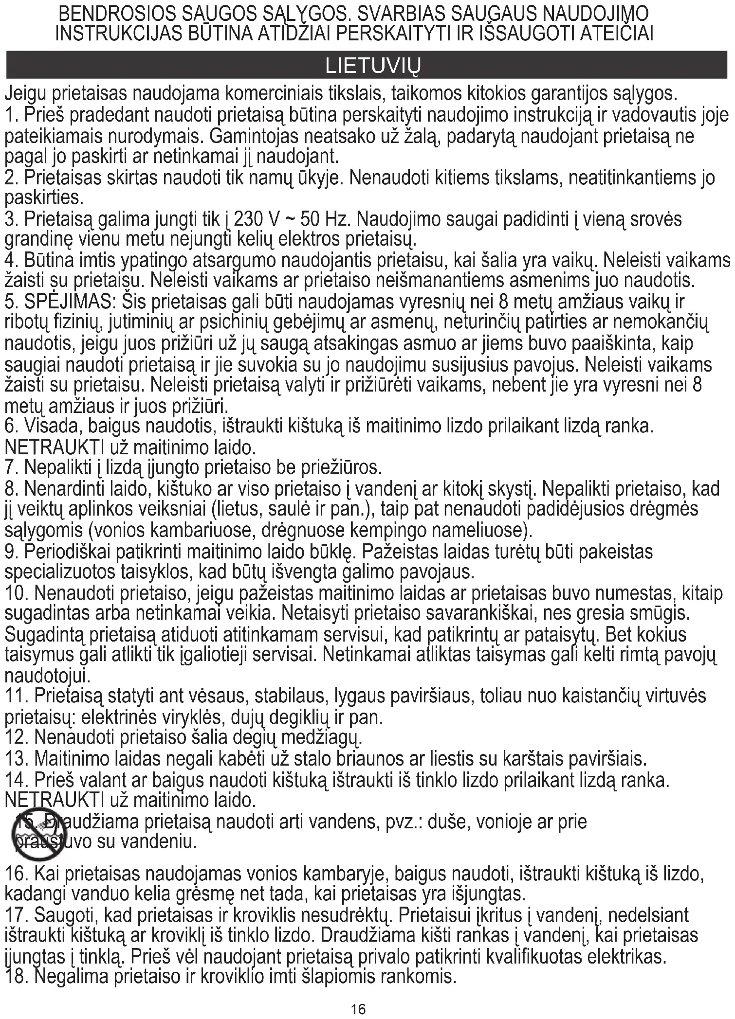 15. Draudžiama prietaisą naudoti arti vandens, pvz.: duše, vonioje ar prie