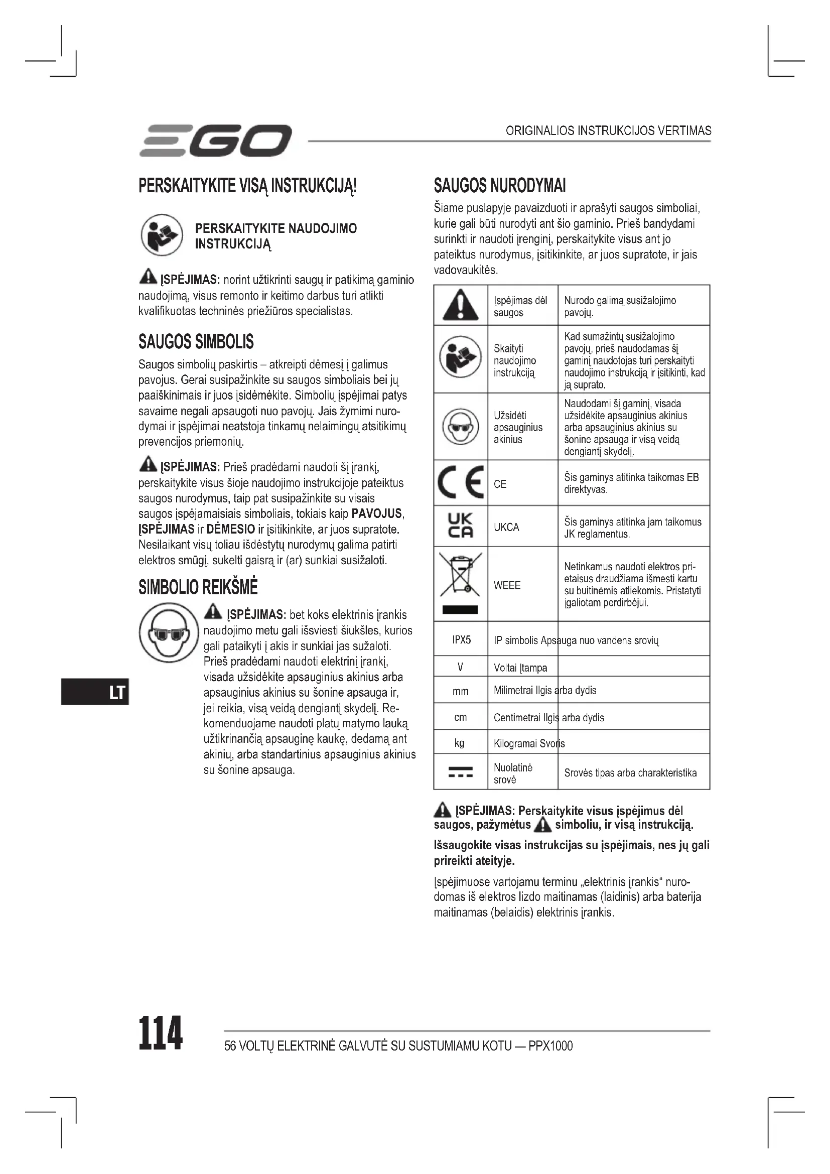 ◾ Rūpinkitės savo elektrinių įrankių būkle. Tikrinkite, ar sukamos jų dalys išcentruotos ir nestringa, ar nėra sulūžusių dalių ir kitų sąlygų, galinčių turėti įtakos elektrinio įrankio veikimui. Jei elektrinis įrankis sugedęs, prieš naudodami jį suremontuokite. Daugelio nelaimingų atsitikimų priežastis yra netinkama elektrinių įrankių priežiūra. ◾ Pjovimo įrenginiai turi būti aštrūs ir švarūs. Tinkamai prižiūrimi pjovimo įrankiai aštriais ašmenimis rečiau stringa ir lengviau valdomi. ◾ Elektrinį įrankį, priedus, antgalius ir kitas dalis naudokite pagal šią instrukciją, atsižvelgdami į darbo sąlygas ir atliekamą darbą. Naudojant elektrinius įrankius ne pagal paskirtį gali susidaryti pavojingos situacijos. ◾ Įrankių rankenos ir sugriebimo paviršiai turi būti sausi, švarūs ir neištepti alyva ar tepalu. Dėl slidžių rankenų ir sugriebimo paviršių įrankį sunku saugiai valdyti ir jis gali išsprūsti netikėtomis aplinkybėmis. ◾ Šią 56 V elektrinę galvutę su sustumiamu kotu PPX1000 galima naudoti tik su toliau lentelėje nurodytais EGO įtaisais arba su kitais įtaisais, kuriuos EGO ateityje išleis ir patvirtins, kad jie tinka naudoti su šia elektrine galvute:ĮTAISO TIPAS MODELIO NUMERISGyvatvorių žirklių įtaisas PTX5100Aukštapjovės įtaisas PSX2500 Bendrieji įspėjimai dėl elektrinio įrankio saugos – akumuliatorinio įrankio naudojimas ir priežiūra. ◾ Kraukite naudodami tik gamintojo nurodytą įkroviklį. Naudojant įkroviklį, skirtą kito tipo sudėtinei baterijai, gali kilti gaisro pavojus. ◾ Elektrinius įrankius naudokite tik su jiems skirtomis sudėtinėmis baterijomis. Naudojant kitokias sudėtines baterijas gali kilti sužalojimų ir gaisro pavojus. ◾ Nenaudojama sudėtinė baterija turi būti laikoma atokiau nuo metalinių objektų, tokių kaip sąvaržėlės, monetos, raktai, vinys, varžtai ar kiti metaliniai daiktai, galintys sujungti abu baterijos gnybtus. Įvykus trumpajam jungimui tarp baterijos gnybtų galima nusideginti ar gali kilti gaisras. ◾ Dėl netinkamų sąlygų iš baterijos gali ištekėti skystis – nelieskite jo. Skysčiui atsitiktinai patekus ant odos, nedelsiant nuplaukite vandeniu. Jeigu skysčio pateko į akis, kreipkitės ir į gydytojus. Iš baterijos ištekėjęs skystis gali dirginti arba nudeginti. ◾ Nenaudokite pažeistos ar modikuotos sudėtinės baterijos ar įrankio. Tokios netinkamos sudėtinės baterijos gali kelti gaisro, sprogimo ar sužalojimo pavojų. ◾ Sudėtinės baterijos ar įrankio negalima deginti ar kaitinti. Bateriją deginant ar įkaitinus virš 130 °C ji gali sprogti. ◾ Laikykitės įrankio ar sudėtinės baterijos įkrovimo instrukcijų ir įkrovimą vykdykite nurodytame temperatūrų diapazone. Priešingu atveju galite sugadinti sudėtinę bateriją ar net sukelti gaisrą. Bendrieji įspėjimai dėl elektrinio įrankio saugos – techninė priežiūra. ◾ Jūsų elektrinio įrankio techninės priežiūros darbus gali vykdyti tik kvalikuotas remonto meistras, naudodamas tik identiškas atsargines dalis. Tokiu būdu elektrinis įrankis išliks saugus. ◾ Niekada neremontuokite sugadintos sudėtinės baterijos. Tokias baterijas remontuoti gali tik gamintojas arba įgalioto techninės priežiūros centro specialistai. ◾ Susidarius šioje instrukcijoje neaprašytai situacijai, būkite atsargūs ir vadovaukitės sveika nuovoka. Pagalbos kreipkitės į EGO techninės priežiūros centrą.