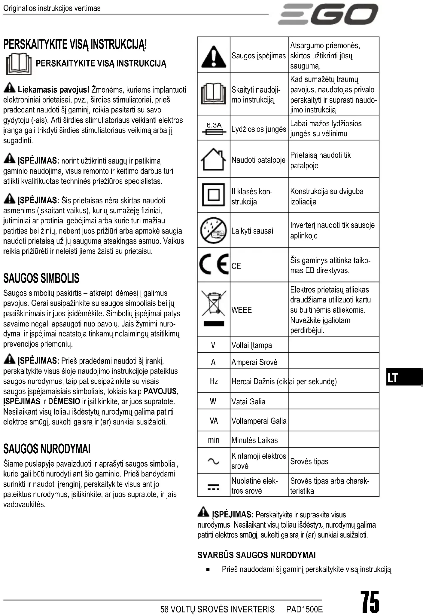 Liekamasis pavojus! Žmonėms, kuriems implantuoti elektroniniai prietaisai, pvz., širdies stimuliatoriai, prieš pradedant naudoti šį gaminį, reikia pasitarti su savo gydytoju (-ais). Arti širdies stimuliatoriaus veikianti elektros įranga gali trikdyti širdies stimuliatoriaus veikimą arba jį sugadinti. ĮSPĖJIMAS: norint užtikrinti saugų ir patikimą gaminio naudojimą, visus remonto ir keitimo darbus turi atlikti kvalikuotas techninės priežiūros specialistas. ĮSPĖJIMAS: Šis prietaisas nėra skirtas naudoti asmenims (įskaitant vaikus), kurių sumažėję ziniai, jutiminiai ar protiniai gebėjimai arba kurie turi mažiau patirties bei žinių, nebent juos prižiūri arba apmokė saugiai naudoti prietaisą už jų saugumą atsakingas asmuo. Vaikus reikia prižiūrėti ir neleisti jiems žaisti su prietaisu. SAUGOS SIMBOLIS Saugos simbolių paskirtis – atkreipti dėmesį į galimus pavojus. Gerai susipažinkite su saugos simboliais bei jų paaiškinimais ir juos įsidėmėkite. Simbolių įspėjimai patys savaime negali apsaugoti nuo pavojų. Jais žymimi nuro-dymai ir įspėjimai neatstoja tinkamų nelaimingų atsitikimų prevencijos priemonių. ĮSPĖJIMAS: Prieš pradėdami naudoti šį įrankį, perskaitykite visus šioje naudojimo instrukcijoje pateiktus saugos nurodymus, taip pat susipažinkite su visais saugos įspėjamaisiais simboliais, tokiais kaip PAVOJUS, ĮSPĖJIMAS ir DĖMESIO ir įsitikinkite, ar juos supratote. Nesilaikant visų toliau išdėstytų nurodymų galima patirti elektros smūgį, sukelti gaisrą ir (ar) sunkiai susižaloti. SAUGOS NURODYMAI Šiame puslapyje pavaizduoti ir aprašyti saugos simboliai, kurie gali būti nurodyti ant šio gaminio. Prieš bandydami surinkti ir naudoti įrenginį, perskaitykite visus ant jo pateiktus nurodymus, įsitikinkite, ar juos supratote, ir jais vadovaukitės.Saugos įspėjimasAtsargumo priemonės, skirtos užtikrinti jūsų saugumą.Skaityti naudoji-mo instrukcijąKad sumažėtų traumų pavojus, naudotojas privalo perskaityti ir suprasti naudo-jimo instrukciją 6.3A Lydžiosios jungėsLabai mažos lydžiosios jungės su vėlinimuNaudoti patalpojePrietaisą naudoti tik patalpojeII klasės kon-strukcijaKonstrukcija su dviguba izoliacijaLaikyti sausaiInverterį naudoti tik sausoje aplinkoje Šis gaminys atitinka taiko-mas EB direktyvas.WEEE Elektros prietaisų atliekas draudžiama utilizuoti kartu su buitinėmis atliekomis. Nuvežkite įgaliotam perdirbėjui. Voltai Įtampa Amperai Srovė Hercai Dažnis (ciklai per sekundę) Vatai Galia Voltamperai Galia min Minutės LaikasKintamoji elektros srovėSrovės tipasNuolatinė elek-tros srovėSrovės tipas arba charak-teristika ĮSPĖJIMAS: Perskaitykite ir supraskite visus nurodymus. Nesilaikant visų toliau išdėstytų nurodymų galima patirti elektros smūgį, sukelti gaisrą ir (ar) sunkiai susižaloti.