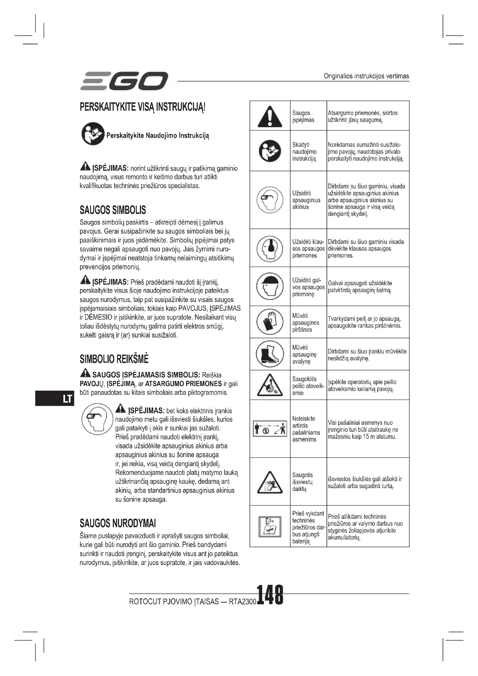 SAUGOS ĮSPĖJAMASIS SIMBOLIS: Reiškia PAVOJŲ, ĮSPĖJIMĄ, ar ATSARGUMO PRIEMONES ir gali būti panaudotas su kitais simboliais arba piktogramomis. ĮSPĖJIMAS: bet koks elektrinis įrankis naudojimo metu gali išsviesti šiukšles, kurios gali pataikyti į akis ir sunkiai jas sužaloti. Prieš pradėdami naudoti elektrinį įrankį, visada užsidėkite apsauginius akinius arba apsauginius akinius su šonine apsauga ir, jei reikia, visą veidą dengiantį skydelį. Rekomenduojame naudoti platų matymo lauką užtikrinančią apsauginę kaukę, dedamą ant akinių, arba standartinius apsauginius akinius su šonine apsauga. SAUGOS NURODYMAI Šiame puslapyje pavaizduoti ir aprašyti saugos simboliai, kurie gali būti nurodyti ant šio gaminio. Prieš bandydami surinkti ir naudoti įrenginį, perskaitykite visus ant jo pateiktus nurodymus, įsitikinkite, ar juos supratote, ir jais vadovaukitės. Saugos įspėjimasAtsargumo priemonės, skirtos užtikrinti jūsų saugumą.Skaityti naudojimo instrukcijąNorėdamas sumažinti susižalo-jimo pavojų, naudotojas privalo perskaityti naudojimo instrukciją.Užsidėti apsauginius akiniusDirbdami su šiuo gaminiu, visada užsidėkite apsauginius akinius arba apsauginius akinius su šonine apsauga ir visą veidą dengiantį skydelį.Užsidėti klau-sos apsaugos priemonesDirbdami su šiuo gaminiu visada dėvėkite klausos apsaugos priemones.Užsidėti gal-vos apsaugos priemonęGalvai apsaugoti užsidėkite patvirtintą apsauginį šalmą.Mūvėti apsaugines pirštinesTvarkydami peilį ar jo apsaugą, apsaugokite rankas pirštinėmis.Mūvėti apsauginę avalynęDirbdami su šiuo įrankiu mūvėkite neslidžią avalynę.Saugokitis peilio atoveik- smio Įspėkite operatorių apie peilio atoveiksmio keliamą pavojų.Neleiskite artintis pašaliniams asmenimsVisi pašaliniai asmenys nuo įrenginio turi būti atsitraukę ne mažesniu kaip 15 m atstumu.Saugotis išsviestų daiktųišsviestos šiukšlės gali atšokti ir sužaloti arba sugadinti turtą.Prieš vykdant techninės priežiūros dar-bus atjungti baterijąPrieš atlikdami techninės priežiūros ar valymo darbus nuo styginės žoliapjovės atjunkite akumuliatorių. Originalios instrukcijos vertimasROTOCUT PJOVIMO ĮTAISAS — RTA2300 149