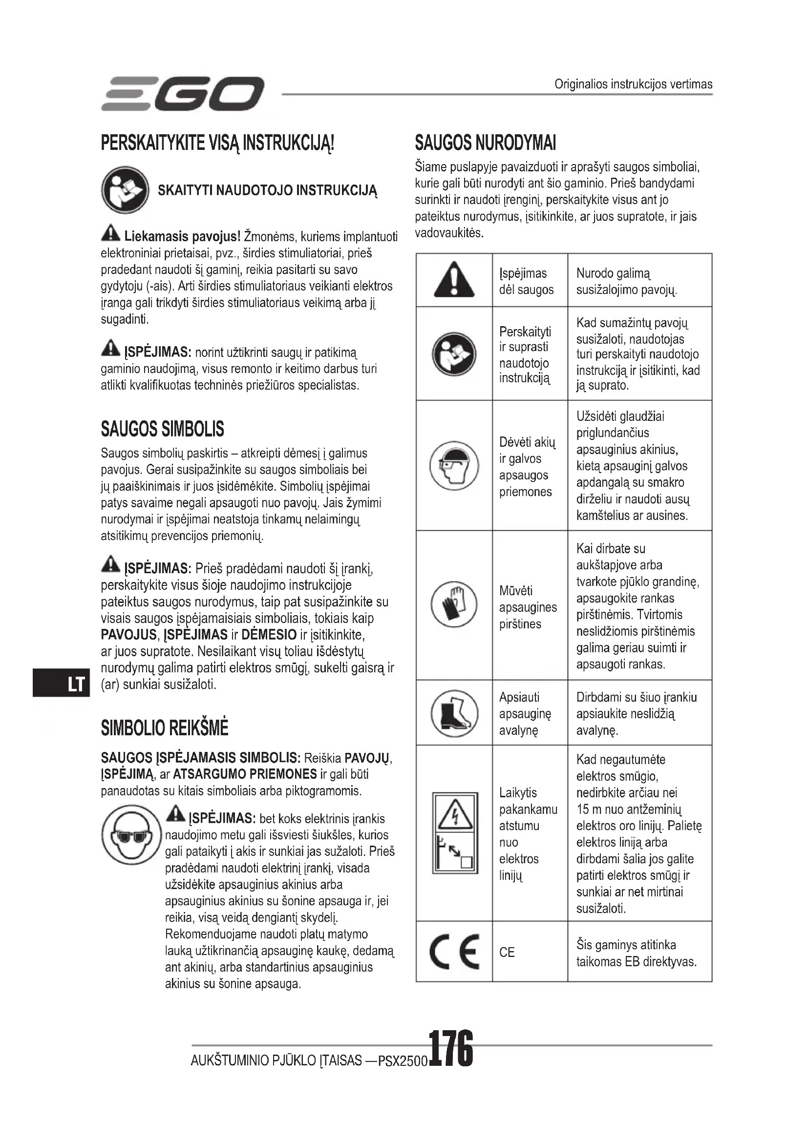 Šis gaminys atitinka taikomas EB direktyvas. Originalios instrukcijos vertimasAUKŠTUMINIO PJŪKLO ĮTAISAS — PSX2500