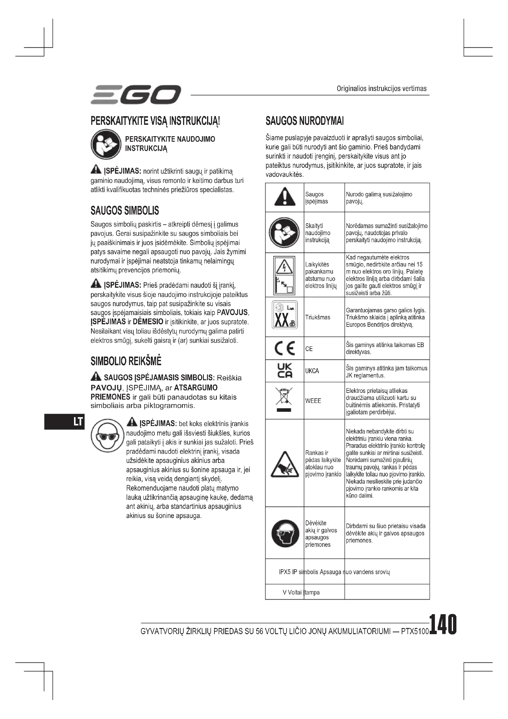 WEEE Elektros prietaisų atliekas draudžiama utilizuoti kartu su buitinėmis atliekomis. Pristatyti įgaliotam perdirbėjui.Rankas ir pėdas laikykite atokiau nuo pjovimo įrankioNiekada nebandykite dirbti su elektriniu įrankiu viena ranka. Praradus elektrinio įrankio kontrolę galite sunkiai ar mirtinai susižeisti. Norėdami sumažinti pjautinių traumų pavojų, rankas ir pėdas laikykite toliau nuo pjovimo įrankio. Niekada nesilieskite prie judančio pjovimo įrankio rankomis ar kita kūno dalimi.Dėvėkite akių ir galvos apsaugos priemonesDirbdami su šiuo prietaisu visada dėvėkite akių ir galvos apsaugos priemones.IPX5 IP simbolis Apsauga nuo vandens sroviųV Voltai ĮtampaOriginalios instrukcijos vertimasGYVATVORIŲ ŽIRKLIŲ PRIEDAS SU 56 VOLTŲ LIČIO JONŲ AKUMULIATORIUMI — PTX5100 141