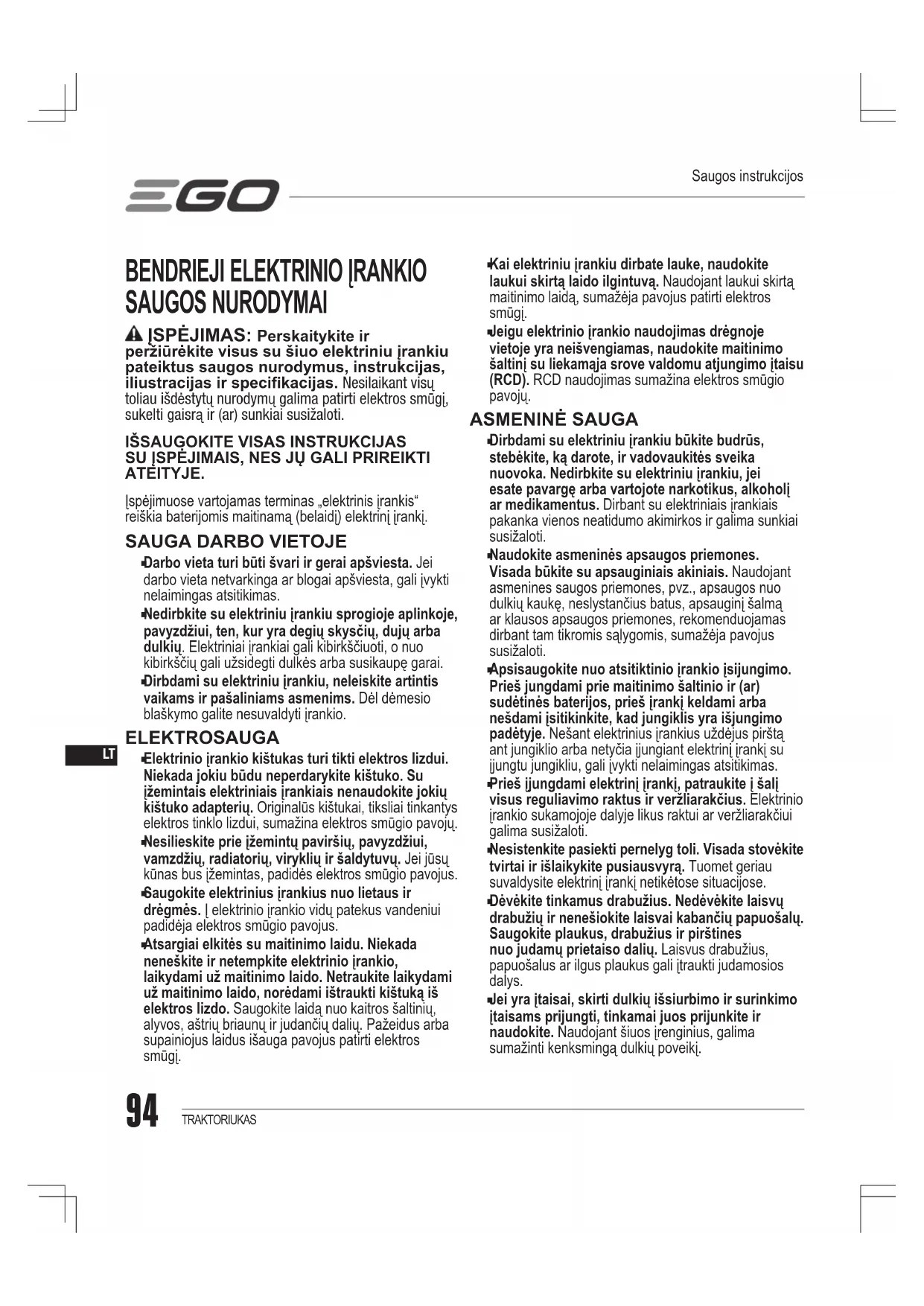 Atsisiųskite instrukciją savo žoliapjovė PDF formatu nemokamai! Raskite savo instrukciją ZT4201EL - EGO ir vėl perimkite savo elektroninį įrenginį. Šiame puslapyje skelbiami visi dokumentai, reikalingi jūsų įrenginio naudojimui. ZT4201EL prekės ženklo EGO.
