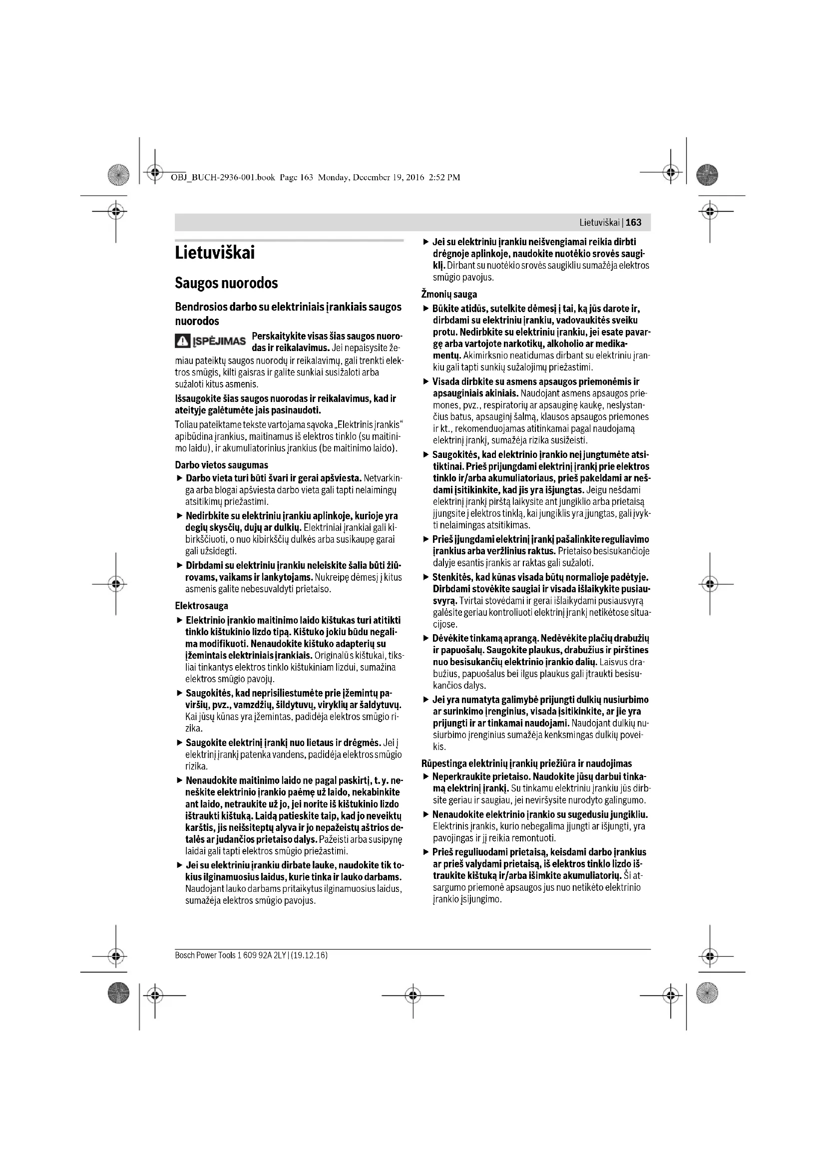 Tiesības uz izmaiņām tiek saglabātas. OBJ_BUCH-2936-001.book Page 162 Monday, December 19, 2016 2:52 PMLietuviškai | 163 Bosch Power Tools 1 609 92A 2LY | (19.12.16) Lietuviškai Saugos nuorodos Bendrosios darbo su elektriniais įrankiais saugos nuorodos Perskaitykite visas šias saugos nuoro- das ir reikalavimus. Jei nepaisysite že- miau pateiktų saugos nuorodų ir reikalavimų, gali trenkti elek- tros smūgis, kilti gaisras ir galite sunkiai susižaloti arba sužaloti kitus asmenis. Išsaugokite šias saugos nuorodas ir reikalavimus, kad ir ateityje galėtumėte jais pasinaudoti. Toliau pateiktame tekste vartojama sąvoka „Elektrinis įrankis“ apibūdina įrankius, maitinamus iš elektros tinklo (su maitini- mo laidu), ir akumuliatorinius įrankius (be maitinimo laido). Darbo vietos saugumas Darbo vieta turi būti švari ir gerai apšviesta. Netvarkin- ga arba blogai apšviesta darbo vieta gali tapti nelaimingų atsitikimų priežastimi. Nedirbkite su elektriniu įrankiu aplinkoje, kurioje yra degių skysčių, dujų ar dulkių. Elektriniai įrankiai gali ki- birkščiuoti, o nuo kibirkščių dulkės arba susikaupę garai gali užsidegti. Dirbdami su elektriniu įrankiu neleiskite šalia būti žiū- rovams, vaikams ir lankytojams. Nukreipę dėmesį į kitus asmenis galite nebesuvaldyti prietaiso. Elektrosauga Elektrinio įrankio maitinimo laido kištukas turi atitikti tinklo kištukinio lizdo tipą. Kištuko jokiu būdu negali- ma modifikuoti. Nenaudokite kištuko adapterių su įžemintais elektriniais įrankiais. Originalū s kištukai, tiks- liai tinkantys elektros tinklo kištukiniam lizdui, sumažina elektros smūgio pavojų. Saugokitės, kad neprisiliestumėte prie įžemintų pa- viršių, pvz., vamzdžių, šildytuvų, viryklių ar šaldytuvų. Kai jūsų kūnas yra įžemintas, padidėja elektros smūgio ri- zika. Saugokite elektrinį įrankį nuo lietaus ir drėgmės. Jei į elektrinį įrankį patenka vandens, padidėja elektros smūgio rizika. Nenaudokite maitinimo laido ne pagal paskirtį, t.y. ne- neškite elektrinio įrankio paėmę už laido, nekabinkite ant laido, netraukite už jo, jei norite iš kištukinio lizdo ištraukti kištuką. Laidą patieskite taip, kad jo neveiktų karštis, jis neišsiteptų alyva ir jo nepažeistų aštrios de- talės ar judančios prietaiso dalys. Pažeisti arba susipynę laidai gali tapti elektros smūgio priežastimi. Jei su elektriniu įrankiu dirbate lauke, naudokite tik to- kius ilginamuosius laidus, kurie tinka ir lauko darbams. Naudojant lauko darbams pritaikytus ilginamuosius laidus, sumažėja elektros smūgio pavojus. Jei su elektriniu įrankiu neišvengiamai reikia dirbti drėgnoje aplinkoje, naudokite nuotėkio srovės saugi- klį. Dirbant su nuotėkio srovės saugikliu sumažėja elektros smūgio pavojus. Žmonių sauga Būkite atidūs, sutelkite dėmesį į tai, ką jūs darote ir, dirbdami su elektriniu įrankiu, vadovaukitės sveiku protu. Nedirbkite su elektriniu įrankiu, jei esate pavar- gę arba vartojote narkotikų, alkoholio ar medika- mentų. Akimirksnio neatidumas dirbant su elektriniu įran- kiu gali tapti sunkių sužalojimų priežastimi. Visada dirbkite su asmens apsaugos priemonėmis ir apsauginiais akiniais. Naudojant asmens apsaugos prie- mones, pvz., respiratorių ar apsauginę kaukę, neslystan- čius batus, apsauginį šalmą, klausos apsaugos priemones ir kt., rekomenduojamas atitinkamai pagal naudojamą elektrinį įrankį, sumažėja rizika susižeisti. Saugokitės, kad elektrinio įrankio neį jungtumėte atsi- tiktinai. Prieš prijungdami elektrinį įrankį prie elektros tinklo ir/arba akumuliatoriaus, prieš pakeldami ar neš- dami įsitikinkite, kad jis yra išjungtas. Jeigu nešdami elektrinį įrankį pirštą laikysite ant jungiklio arba prietaisą įjungsite į elektros tinklą, kai jungiklis yra įjungtas, gali įvyk- ti nelaimingas atsitikimas. Prieš įjungdami elektrinį įrankį pašalinkite reguliavimo įrankius arba veržlinius raktus. Prietaiso besisukančioje dalyje esantis įrankis ar raktas gali sužaloti. Stenkitės, kad kūnas visada būtų normalioje padėtyje. Dirbdami stovėkite saugiai ir visada išlaikykite pusiau- svyrą. Tvirtai stovėdami ir gerai išlaikydami pusiausvyrą galėsite geriau kontroliuoti elektrinį įrankį netikėtose situa- cijose. Dėvėkite tinkamą aprangą. Nedėvėkite plačių drabužių ir papuošalų. Saugokite plaukus, drabužius ir pirštines nuo besisukančių elektrinio į rankio dalių. Laisvus dra- bužius, papuošalus bei ilgus plaukus gali įtraukti besisu- kančios dalys. Jei yra numatyta galimybė prijungti dulkių nusiurbimo ar surinkimo įrenginius, visada įsitikinkite, ar jie yra prijungti ir ar tinkamai naudojami. Naudojant dulkių nu- siurbimo įrenginius sumažėja kenksmingas dulkių povei- kis. Rūpestinga elektrinių įrankių priežiūra ir naudojimas Neperkraukite prietaiso. Naudokite jūsų darbui tinka- mą elektrinį įrankį. Su tinkamu elektriniu įrankiu jūs dirb- site geriau ir saugiau, jei neviršysite nurodyto galingumo. Nenaudokite elektrinio įrankio su sugedusiu jungikliu. Elektrinis įrankis, kurio nebegalima įjungti ar išjungti, yra pavojingas ir jį reikia remontuoti. Prieš reguliuodami prietaisą, keisdami darbo įrankius ar prieš valydami prietaisą, iš elektros tinklo lizdo iš- traukite kištuką ir/arba išimkite akumuliatorių. Ši at- sargumo priemonė apsaugos jus nuo netikėto elektrinio įrankio įsijungimo. OBJ_BUCH-2936-001.book Page 163 Monday, December 19, 2016 2:52 PM164 | Lietuviškai 1 609 92A 2LY | (19.12.16) Bosch Power Tools Nenaudojamą elektrinį įrankį sandėliuokite vaikams ir nemokantiems juo naudotis asmenims neprieinamoje vietoje. Elektriniai įrankiai yra pavojingi, kai juos naudoja nepatyrę asmenys. Rūpestingai prižiūrėkite elektrinį įrankį. Patikrinkite, ar besisukančios prietaiso dalys tinkamai veikia ir nie- kur nestringa, ar nėra sulūžusių ar p