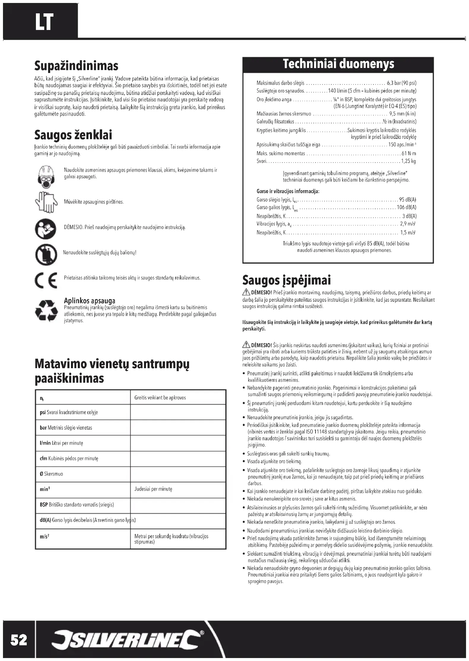 Saugos ženklai Įrankio techninių duomenų plokštelėje gali būti pavaizduoti simboliai. Tai svarbi informacija apie gaminį ar jo naudojimą.Naudokite asmenines apsaugos priemones klausai, akims, kvėpavimo takams ir galvai apsaugoti.Mūvėkite apsaugines pirštines.DĖMESIO. Prieš naudojimą perskaitykite naudojimo instrukciją.Nenaudokite suslėgtųjų dujų balionų!Prietaisas atitinka taikomų teisės aktų ir saugos standartų reikalavimus. Aplinkos apsauga Pneumatinių įrankių (suslėgtojo oro) negalima išmesti kartu su buitinėmis atliekomis, nes juose yra tepalo ir kitų medžiagų. Perdirbkite pagal galiojančius įstatymus. Techniniai duomenys Saugos įspėjimai DĖMESIO! Prieš įrankio montavimą, naudojimą, taisymą, priežiūros darbus, priedų keitimą ar darbą šalia jo perskaitykite pateiktas saugos instrukcijas ir įsitikinkite, kad jas suprantate. Nesilaikant saugos instrukcijų galima rimtai susižeisti.Išsaugokite šią instrukciją ir laikykite ją saugioje vietoje, kad prireikus galėtumėte dar kartą perskaityti. DĖMESIO! Šis įrankis neskirtas naudoti asmenims (įskaitant vaikus), kurių ziniai ar protiniai gebėjimai yra riboti arba kuriems trūksta patirties ir žinių, nebent už jų saugumą atsakingas asmuo juos prižiūrėtų arba parodytų, kaip naudotis prietaisu. Nepalikite šalia įrankio vaikų be priežiūros ir neleiskite vaikams juo žaisti.• Pneumatinį įrankį surinkti, atlikti pakeitimus ir naudoti leidžiama tik išmokytiems arba kvalikuotiems asmenims. • Nebandykite pagerinti pneumatinio įrankio. Pagerinimai ir konstrukcijos pakeitimai gali sumažinti saugos priemonių veiksmingumą ir padidinti pavojų pneumatinio įrankio naudotojui.• Šį pneumatinį įrankį perduodami kitam naudotojui, kartu perduokite ir šią naudojimo instrukciją. • Nenaudokite pneumatinio įrankio, jeigu jis sugadintas. • Periodiškai įsitikinkite, kad pneumatinio įrankio duomenų plokštelėje pateikta informacija (ribinės vertės ir ženklai pagal ISO 11148 standartą) yra įskaitoma. Jeigu reikia, pneumatinio įrankio naudotojas / savininkas turi susisiekti su gamintoju dėl naujos duomenų plokštelės įsigijimo. • Suslėgtasis oras gali sukelti sunkių traumų.• Visada atjunkite oro tiekimą.• Visada atjunkite oro tiekimą, pašalinkite suslėgtojo oro žarnoje likusį spaudimą ir atjunkite pneumatinį įrankį nuo žarnos, kai jo nenaudojate, taip pat prieš priedų keitimą ar priežiūros darbus.• Kai įrankio nenaudojate ir kai keičiate darbinę padėtį, pirštus laikykite atokiau nuo gaiduko.• Niekada nenukreipkite oro srovės į save ar kitus asmenis.• Atsilaisvinusios ar plyšusios žarnos gali sukelti rimtų sužeidimų. Visuomet patikrinkite, ar nėra pažeistų ar atsilaisvinusių žarnų ar jungiamųjų detalių.• Niekada neneškite pneumatinio įrankio, laikydami jį už suslėgtojo oro žarnos.• Naudodami pneumatinius įrankius neviršykite didžiausio leistino darbinio slėgio.• Prieš naudojimą visada patikrinkite žarnos ir sujungimų būklę, kad išvengtumėte nelaimingų atsitikimų. Pastebėję pažeidimų ar pernelyg didelio susidėvėjimo požymių, įrankio nenaudokite.• Siekiant sumažinti triukšmą, vibraciją ir dėvėjimąsi, pneumatiniai įrankiai turėtų būti naudojami nustačius mažiausią slėgį, reikalingą užduočiai atlikti.• Niekada nenaudokite gryno deguonies ar degiųjų dujų kaip pneumatinio įrankio galios šaltinio. Pneumatiniai įrankiai nėra pritaikyti šiems galios šaltiniams, o juos naudojant kyla gaisro ir sprogimo pavojus. Supažindinimas Ačiū, kad įsigijote šį „Silverline“ įrankį. Vadove pateikta būtina informacija, kad prietaisas būtų naudojamas saugiai ir efektyviai. Šio prietaiso savybės yra išskirtinės, todėl net jei esate susipažinę su panašių prietaisų naudojimu, būtina atidžiai perskaityti vadovą, kad visiškai suprastumėte instrukcijas. Įsitikinkite, kad visi šio prietaiso naudotojai yra perskaitę vadovą ir visiškai supratę, kaip naudoti prietaisą. Laikykite šią instrukciją greta įrankio, kad prireikus galėtumėte pasinaudoti.