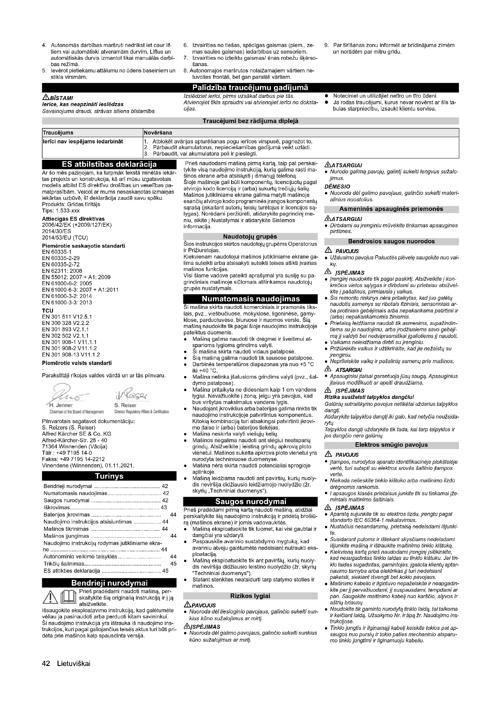 - ES atitikties deklaracija Lietuviškai 43 Eksploatavimas PAVOJUS ● Prieš pradėdami eksploatuoti, patikrinkite mašiną, kaip aprašyta skyriuje „Mašinos tikrinimas“. ● Laikykitės autonominio veikimo taisyklių, aprašytų skyriuje „Autonominio veikimo taisyklės“. ● Jei naudojate aparatą pavojingoje aplinkoje (pvz., de- galinėje), vykdykite atitinkamus saugos nurodymus. ● Draudžiama naudoti prietaisą sprogioje aplinkoje. ● Sprogiuosius skysčius, degiąsias dujas, sprogiąsias dulkes, taip pat neskiestas rūgštis ir tirpiklius purkšti ir siurbti draudžiama. Minėti skysčiai – tai benzinas, da- žų skiedikliai arba skystasis kuras, kurie sumišę su si- urbiamu oru gali sudaryti sprogiuosius ir nuodingus garus arba mišinius, taip pat acetonas, neskiestos rūgštys ir tirpikliai, kurie reaguoja su įrenginyje nau- dojamomis medžiagomis. ● Nesiurbkite degių ar rusenančių daiktų. 몇 ĮSPĖJIMAS ● Agregatu neleidžiama siurbti žmonių dėvimų drabu- žių arba gyvūnų kūno. ● Nenaudokite mašinos ant slidžių grindų. ● Ant nuožulnių paviršių neviršykite eksploatavimo ins- trukcijoje nurodytos nuolydžio kampo į šoną ir važia- vimo krypties vertės. ● Dėvėkite gerai prigludusius drabužius, kad jų nesu- griebtų besisukančios dalys (neryšėkite kaklaraiščio, nesegėkite ilgo, plataus sijono ir pan.). 몇 ATSARGIAI ● Kiekvieną kartą prieš naudodami patikrinkite aparatą ir jo priedus, pvz., maitinimo tinklo jungtį, ilginamąjį kabelį, ar jų būklė ir eksploatavimo saugumas atitinka reikalavimus. Jeigu aptinkamas pažeidimas, ištrauki- te maitinimo tinklo kištuką ir nenaudokite aparato. ● Mašiną palikti be priežiūros draudžiama. ● Su mašina nevežkite keleivių. ● Neatidarinėkite gaubto veikiant varikliui. ● Įrenginys nepritaikytas siurbti sveikatai kenksmingas dulkes. DĖMESIO ● Neeksploatuokite prietaiso žemesnėje temperatūroje kaip 0 °C. ● Įrenginys nėra dulkių siurblys. Nesiurbkite daugiau skysčio, nei purškėte. Įrenginiu neleidžiama siurbti sausų nešvarumų. ● Įrenginys tinka tik tokioms dangoms, kurios nurodytos naudojimo instrukcijose. ● Prietaisas pritaikytas drėgnam ir šlapiam gruntui, virš kurio yra 1 cm storio vandens sluoksnis. Nevažiuokite į tas vietas, kuriose vandens sluoksnis yra storesnis kaip 1 cm. ● Šalindami nešvarų vandenį ir šarmą, laikykitės įstaty- mais numatytų nuostatų. ● Nenaudokite mašinos lauke. Eksploatavimas su valikliu 몇 ATSARGIAI ● Pasirūpinkite, kad valiklis nebūtų prieinamas vaikams. ● Nenaudokite rekomenduojamos valymo priemonės neskiestos. Produktus naudoti sau- gu, nes juose nėra jokių rūgščių, šarmų arba aplinkai žalingų medžiagų. Valymo priemonei susilietus su aki- mis, nedelsdami plaukite jas dideliu kiekiu vandens ir nedelsdami kreipkitės į gydytoją, taip pat ir priemonės prarijus. ● Naudokite tik gamintojo rekomenduotas va- lymo priemones ir laikykitės valymo priemonių gaminto- jų pateiktų naudojimo, šalinimo ir įspėjamųjų nurodymų. Baterija Šioje mašinoje įmontuotos ličio jonų baterijos. Joms tai- komi specialūs kriterijai. Išimti, sumontuoti ir išbandyti defektines baterijas leidžiama tik „Kärcher“ klientų ap- tarnavimo tarnybai arba specialistui. Dėl laikymo ir gabenimo instrukcijų kreipkitės į „Kär- cher“ klientų aptarnavimo tarnybą. PAVOJUS Neleidžiama modifikuoti ir keisti mašinos. Jums neleidžiama atidaryti baterijos, nes kyla trumpojo jungimo pavojus. Be to, gali būti paskleisti dirginantys garai ar ėsdinantys skysčiai. Saugokite bateriją nuo saulės intensyvios spinduliuo- tės, karščio ir ugnies. Kyla sprogimo pavojus. Nenaudokite įkroviklio potencialiai sprogioje aplinkoje. Nenaudokite purvino arba šlapio įkroviklio. Įkraunant užtikrinkite pakankamą vėdinimą. Sprogimo pavojus. Netoli baterijos arba baterijų įkrovi- mo patalpoje neleidžiama naudoti atvirosios liepsnos, sudaryti kibirkščių arba rūkyti. Sprogimo pavojus. Nedėkite jokių įrankių ar pan. ant ba- terijos, t. y. ant galinių polių ir elementų jungčių. 몇 ĮSPĖJIMAS Prieš kiekvieną naudojimą patikrinkite, ar mašina ir mai- tinimo kabelis nepažeisti. Nenaudokite pažeistos maši- nos, o sugadintas dalis remontuokite prašykite tik kvalifikuotų darbuotojų. Užtikrinkite, kad baterija ir įkroviklis nebūtų prieinamas vaikams. Neįkraukite pažeistų baterijų. Pažeistas baterijas pa- veskite pakeisti „Kärcher“ klientų aptarnavimo tarnybai. Nešalinkite sugedusios baterijos kartu su buitinėmis atliekomis. Informuokite „Kärcher“ klientų aptarnavimo tarnybą. Venkite sąlyčio su iš pažeistų baterijų ištekėjusiu skys- čiu. Atsitiktinai prisilietus skystį nuplaukite vandeniu. Patekus į akis taip pat kreipkitės į gydytoją. 몇 ATSARGIAI Būtinai laikykitės šios naudojimo instrukcijos. Laikykitės įstatymų leidėjo rekomendacijų dėl baterijų tvarkymo. Elektros tinklo įtampa turi atitikti mašinos identifikacinė- je plokštelėje nurodytą įtampą. Naudokite bateriją tik su šia mašina. Draudžiama ir pa- vojinga naudoti ją kitiems tikslams. Mašina su besisukančiais šepečiais 몇 ATSARGIAI ● Netinkami šepečiai kelia pavojų jūsų saugumui. Nau- dokite tik šepečius, pristatytus kartu su mašina, arba tuos, kurie rekomenduojami naudojimo instrukcijose. Įprastinė priežiūra ir techninė priežiūra 몇 ĮSPĖJIMAS ● Prieš valymo, techninės priežiūros, dalių keitimo dar- bus ir perjungimą į kitą veikimo vežimą, įrenginį turite išjungti. Ištraukite iš tinklo maitinamų įrenginių kištu- ką. Naudodami akumuliatoriais varomus įrenginius, ištraukite akumuliatoriaus jungtį arba atjunkite aku- muliatorių. 몇 ATSARGIAI ● Remonto darbus, atsarginių dalių montavimo ir elek- trinių dalių tvarkymo darbus turi atlikti įgaliota klientų aptarnavimo tarnyba. ● Remonto darbus atl