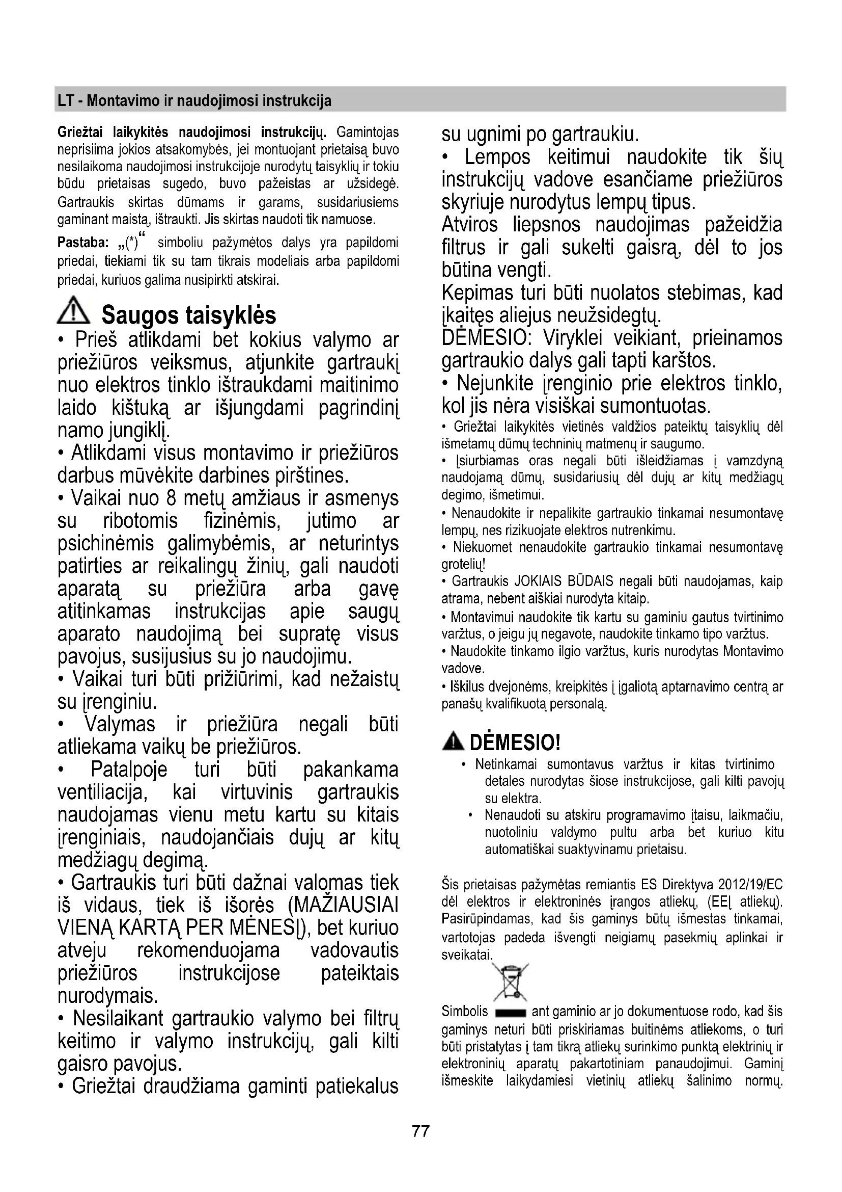 - Patalpoje turi būti pakankama ventiliacija, kai virtuvinis gartraukis naudojamas vienu metu kartu su kitais įrenginiais, naudojančiais dujų ar kitų medžiagų degimą.