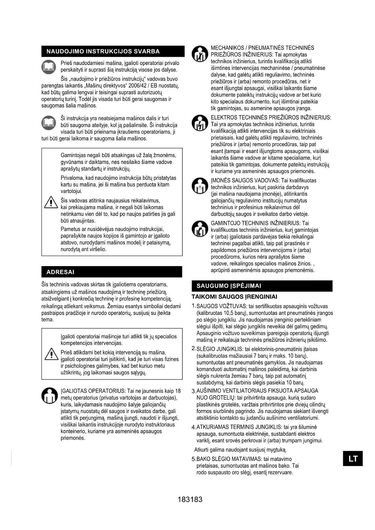 PRIEŽIŪROS INŽINIERIUS: Tai apmokytas technikos inžinierius, turintis kvalikaciją atlikti išimtines intervencijas mechaninėse / pneumatinėse dalyse, kad galėtų atlikti reguliavimo, techninės priežiūros ir (arba) remonto procedūras, net ir esant išjungtai apsaugai, visiškai laikantis šiame dokumente pateiktų instrukcijų vadove ar bet kurio kito specialaus dokumento, kurį išimtinai pateikia tik gamintojas, su asmenine apsaugos įranga. ELEKTROS TECHNINĖS PRIEŽIŪROS INŽINIERIUS: Tai yra apmokytas technikos inžinierius, turintis kvalikaciją atlikti intervencijas tik su elektriniais prietaisais, kad galėtų atlikti reguliavimo, techninės priežiūros ir (arba) remonto procedūras, taip pat esant įtampai ir esant išjungtoms apsaugoms, visiškai laikantis šiame vadove ar kitame specialiame, kurį pateikia tik gamintojas, dokumente pateiktų instrukcijų ir kuriame yra asmeninės apsaugos priemonės. ĮMONĖS SAUGOS VADOVAS: Tai kvalikuotas technikos inžinierius, kurį paskiria darbdavys (jei mašina naudojama įmonėje), atitinkantis galiojančių reguliavimo institucijų numatytus techninius ir profesinius reikalavimus dėl darbuotojų saugos ir sveikatos darbo vietoje. GAMINTOJO TECHNINIS INŽINIERIUS: Tai kvalikuotas techninis inžinierius, kurį gamintojas ir (arba) įgaliotasis pardavėjas tiekia reikalingai techninei pagalbai atlikti, taip pat įprastinės ir papildomos priežiūros intervencijoms ir (arba) procedūroms, kurios nėra aprašytos šiame vadove, reikalingos specialios mašinos žinios. , aprūpinti asmeninėmis apsaugos priemonėmis. Ši instrukcija yra neatsiejama mašinos dalis ir turi būti saugoma ateityje, kol ją pašalinsite. Ši instrukcija visada turi būti prieinama įkrautiems operatoriams, ji turi būti gerai laikoma ir saugoma šalia mašinos. Prieš naudodamiesi mašina, įgalioti operatoriai privalo perskaityti ir suprasti šią instrukciją visose jos dalyse. Šis „naudojimo ir priežiūros instrukcijų“ vadovas buvo parengtas laikantis „Mašinų direktyvos“ 2006/42 / EB nuostatų, kad būtų galima lengvai ir teisingai suprasti autorizuotų operatorių turinį. Todėl jis visada turi būti gerai saugomas ir saugomas šalia mašinos.