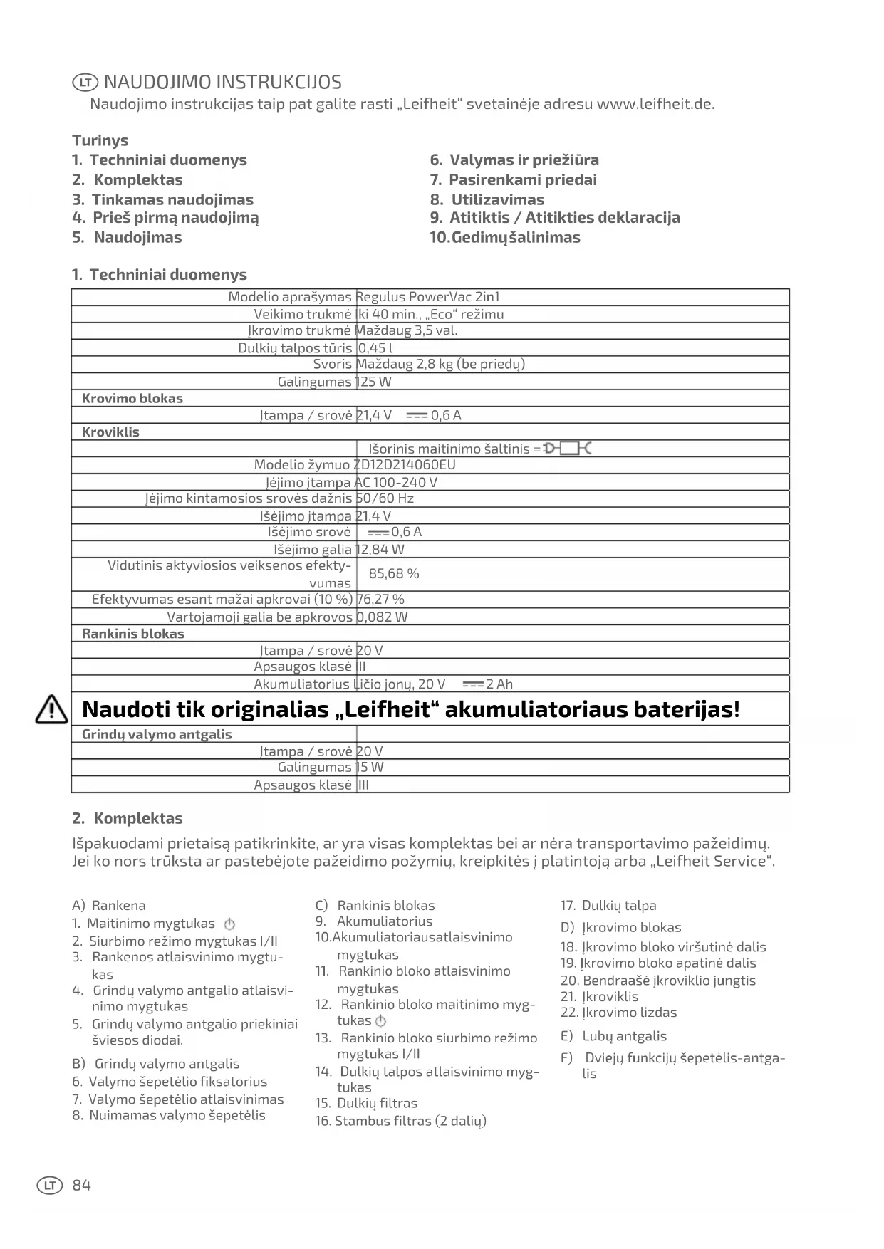 Išpakuodami prietaisą patikrinkite, ar yra visas komplektas bei ar nėra transportavimo pažeidimų. Jei ko nors trūksta ar pastebėjote pažeidimo požymių, kreipkitės į platintoją arba „Leifheit Service“. A) Rankena1. Maitinimo mygtukas 2. Siurbimo režimo mygtukas I/II3. Rankenos atlaisvinimo mygtu- kas 4. Grindų valymo antgalio atlaisvi-nimo mygtukas5. Grindų valymo antgalio priekiniai šviesos diodai.B) Grindų valymo antgalis 6. Valymo šepetėlio fiksatorius7. Valymo šepetėlio atlaisvinimas8. Nuimamas valymo šepetėlisC) Rankinis blokas9. Akumuliatorius10. Akumuliatoriaus atlaisvinimo mygtukas11. Rankinio bloko atlaisvinimo mygtukas12. Rankinio bloko maitinimo myg-tukas 13. Rankinio bloko siurbimo režimo mygtukas I/II14. Dulkių talpos atlaisvinimo myg-tukas 15. Dulkių filtras16. Stambus filtras (2 dalių)17. Dulkių talpaD) Įkrovimo blokas18. Įkrovimo bloko viršutinė dalis19. Įkrovimo bloko apatinė dalis 20. Bendraašė įkroviklio jungtis21. Įkroviklis22. Įkrovimo lizdas E) Lubų antgalis F) Dviejų funkcijų šepetėlis-antga- lis G85