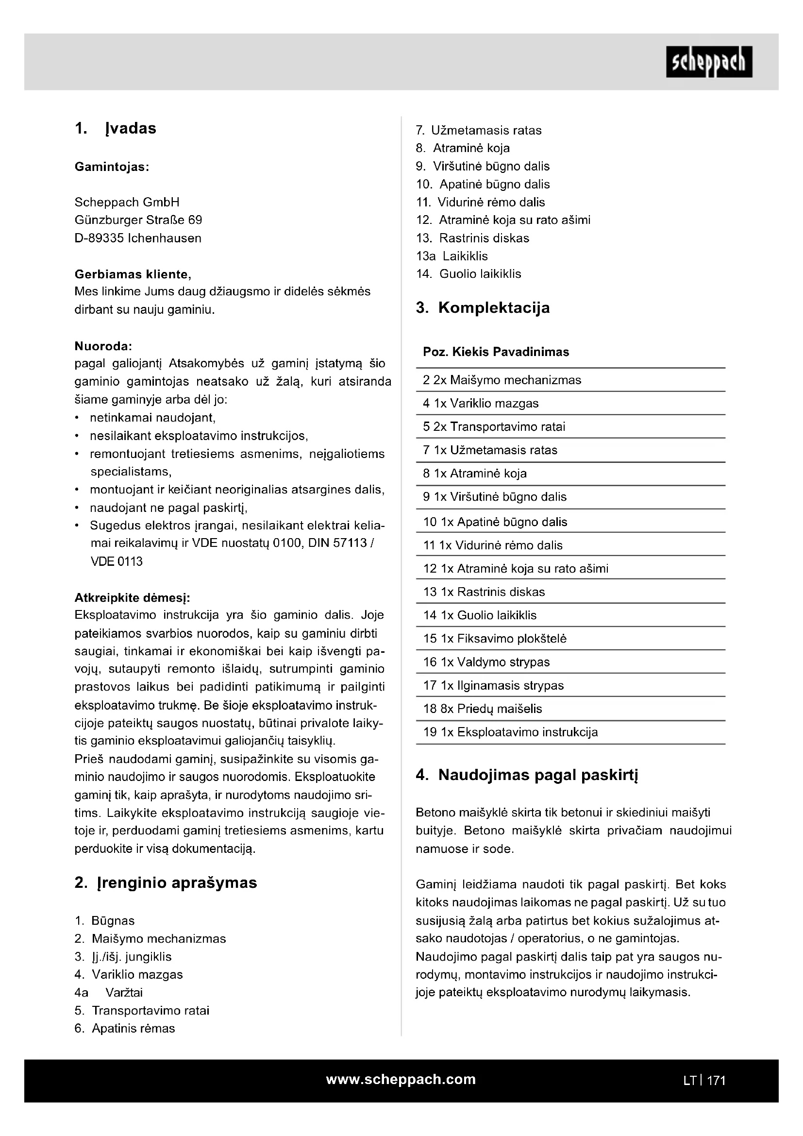 Poz. Kiekis Pavadinimas 2 2x Maišymo mechanizmas 4 1x Variklio mazgas 5 2x Transportavimo ratai 7 1x Užmetamasis ratas 8 1x Atraminė koja 9 1x Viršutinė būgno dalis 10 1x Apatinė būgno dalis 11 1x Vidurinė rėmo dalis 12 1x Atraminė koja su rato ašimi 13 1x Rastrinis diskas 14 1x Guolio laikiklis 15 1x Fiksavimo plokštelė 16 1x Valdymo strypas 17 1x Ilginamasis strypas 18 8x Priedų maišelis 19 1x Eksploatavimo instrukcija