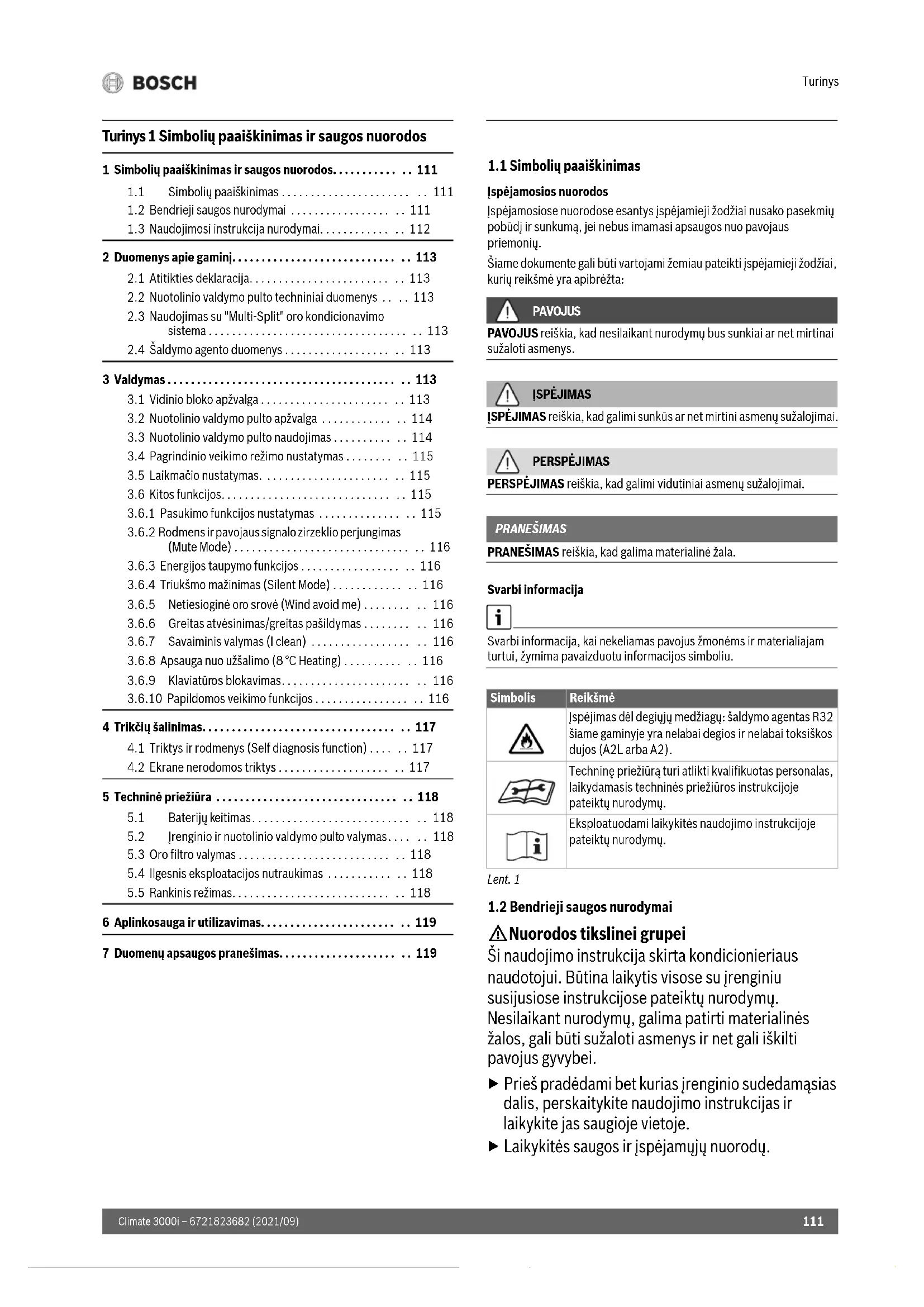 H Nuorodos tikslinei grupei Ši naudojimo instrukcija skirta kondicionieriaus naudotojui. Būtina laikytis visose su įrenginiu susijusiose instrukcijose pateiktų nurodymų. Nesilaikant nurodymų, galima patirti materialinės žalos, gali būti sužaloti asmenys ir net gali iškilti pavojus gyvybei. ▶Prieš pradėdami bet kurias įrenginio sudedamąsias dalis, perskaitykite naudojimo instrukcijas ir laikykite jas saugioje vietoje. ▶ Laikykitės saugos ir įspėjamųjų nuorodų. 1 Simbolių paaiškinimas ir saugos nuorodos. . . . . . . . . . . . . 111