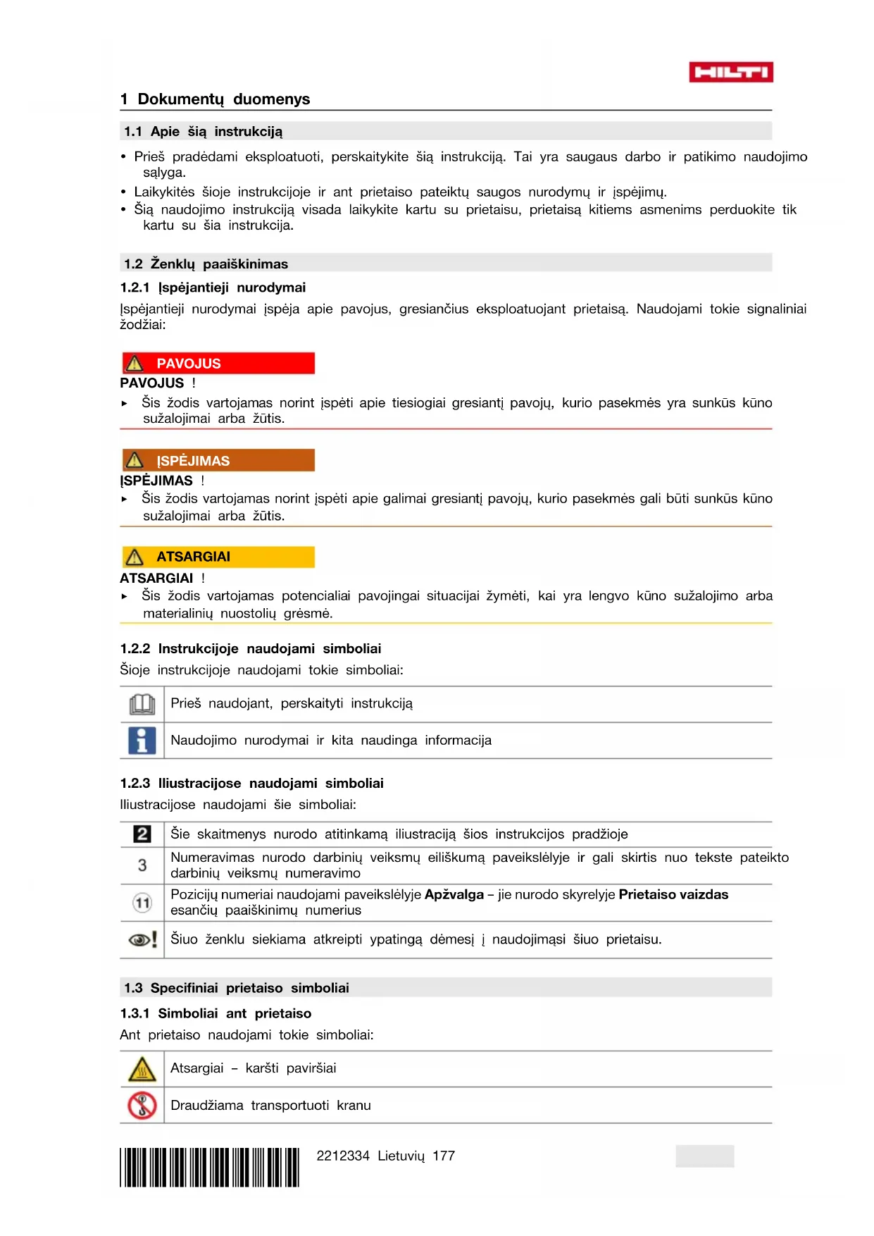 ▶ Prietaiso maitinimo kabelio kištukas turi atitikti elektros lizdo tipą. Kištuko jokiu būdu negalima keisti. Nenaudokite tarpinių kištukų kartu su prietaisais, turinčiais apsauginį įžeminimą. Nepakeisti kištukai ir tinkami elektros lizdai mažina elektros smūgio pavojų. ▶ Kabelio kištuką kiškite į tinkamąįžemintą elektros lizdą, kuris yra patikimai instaliuotas ir suderintas su visomis vietinėmis sąlygomis. Jeigu abejojate, ar elektros lizdas patikimai įžemintas, kreipkitės į kvalifikuotą elektriką, kad patikrintų. ▶ Venkite kūno kontakto su įžemintais paviršiais, pvz., vamzdžiais, šildytuvais, viryklėmis ir šaldytu- vais. Kai žmogaus kūnas yra įžemintas, padidėja elektros smūgio tikimybė. ▶ Saugokite prietaisą nuo lietaus ir drėgmės. Į elektrinį prietaisą patekęs vanduo didina elektros smūgio riziką. ▶ Įsitikinkite, kad elektros maitinimo kabelis neguli baloje. ▶ Prietaiso elektros maitinimo kabelį reguliariai tikrinkite; jeigu jis pažeistas, kreipkitės į Hilti techninės priežiūros centrą, kad pakeistų. Reguliariai tikrinkite ilginimo kabelį, o pažeistą pakeiskite nauju.180 Lietuvių 2212334 *2212334* ▶ Jeigu dirbant elektros maitinimo kabelis ir / arba ilginimo kabelis buvo pažeisti, jų nelieskite. Maitinimo kabelio kištuką ištraukite iš elektros lizdo. Pažeisti elektros maitinimo ir ilginimo kabeliai kelia elektros smūgio pavojų. ▶ Elektros maitinimo kabelį leidžiama keisti tik naudojimo instrukcijoje nurodyto tipo kabeliu. ▶ Nenaudokite maitinimo kabelio ne pagal paskirtį, t. y. neneškite prietaiso paėmę už kabelio, nekabinkite jo ant kabelio, netraukite už kabelio, norėdami ištraukti kištuką iš elektros lizdo. Saugokite kabelį nuo karščio, alyvos, aštrių briaunų ar judančių prietaiso dalių. Pažeisti arba susipynę kabeliai didina elektros smūgio riziką. ▶ Jei su elektriniu prietaisu dirbate lauke, naudokite tik tokius ilginimo kabelius, kurie tinka ir lauko darbams. Naudojant lauko darbams pritaikytus ilginimo kabelius, mažėja elektros smūgio rizika. ▶ Dingus elektros tinklo įtampai, prietaisą išjunkite, o maitinimo kabelio kištuką ištraukite iš elektros lizdo. ▶ Niekada nedirbkite su prietaisu, jeigu jis yra sudrėkęs ar nešvarus. Ant prietaiso korpuso susikaupu- sios dulkes, ypač laidžių medžiagų dulkės, arba drėgmė esant nepalankioms sąlygoms gali kelti elektros smūgio pavojų. Todėl, jeigu dažnai apdirbate laidžias medžiagas, nešvarius prietaisus reguliariai tikrinkite Hilti techninės priežiūros centre.