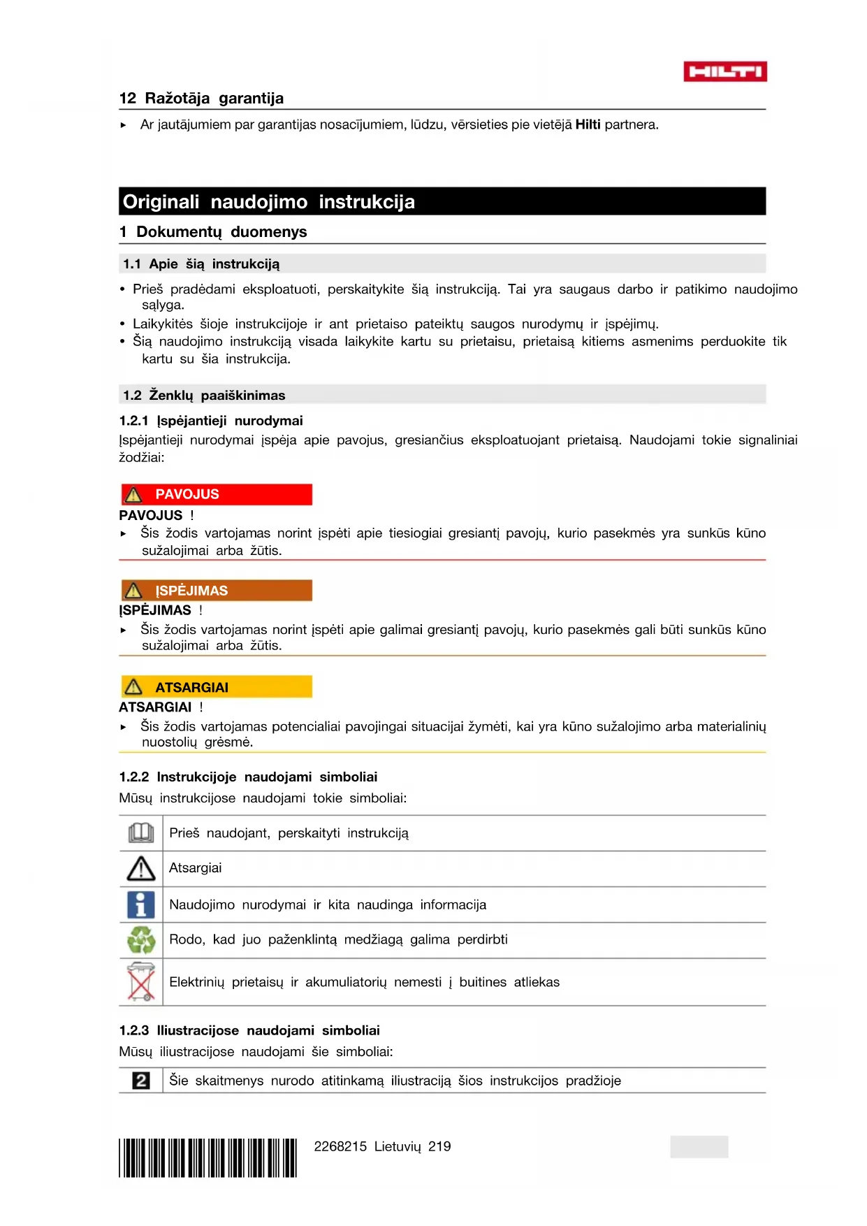 Prisiimdami visą atsakomybę pareiškiame, kad čia aprašytas prietaisas atitinka galiojančias direktyvas ir normas. Atitikties deklaracijos kopiją rasite šios instrukcijos gale. Techninė dokumentacija saugoma čia: Hilti Entwicklungsgesellschaft mbH | Zulassung Geräte | Hiltistraße 6 | 86916 Kaufering, DE 2 Sauga