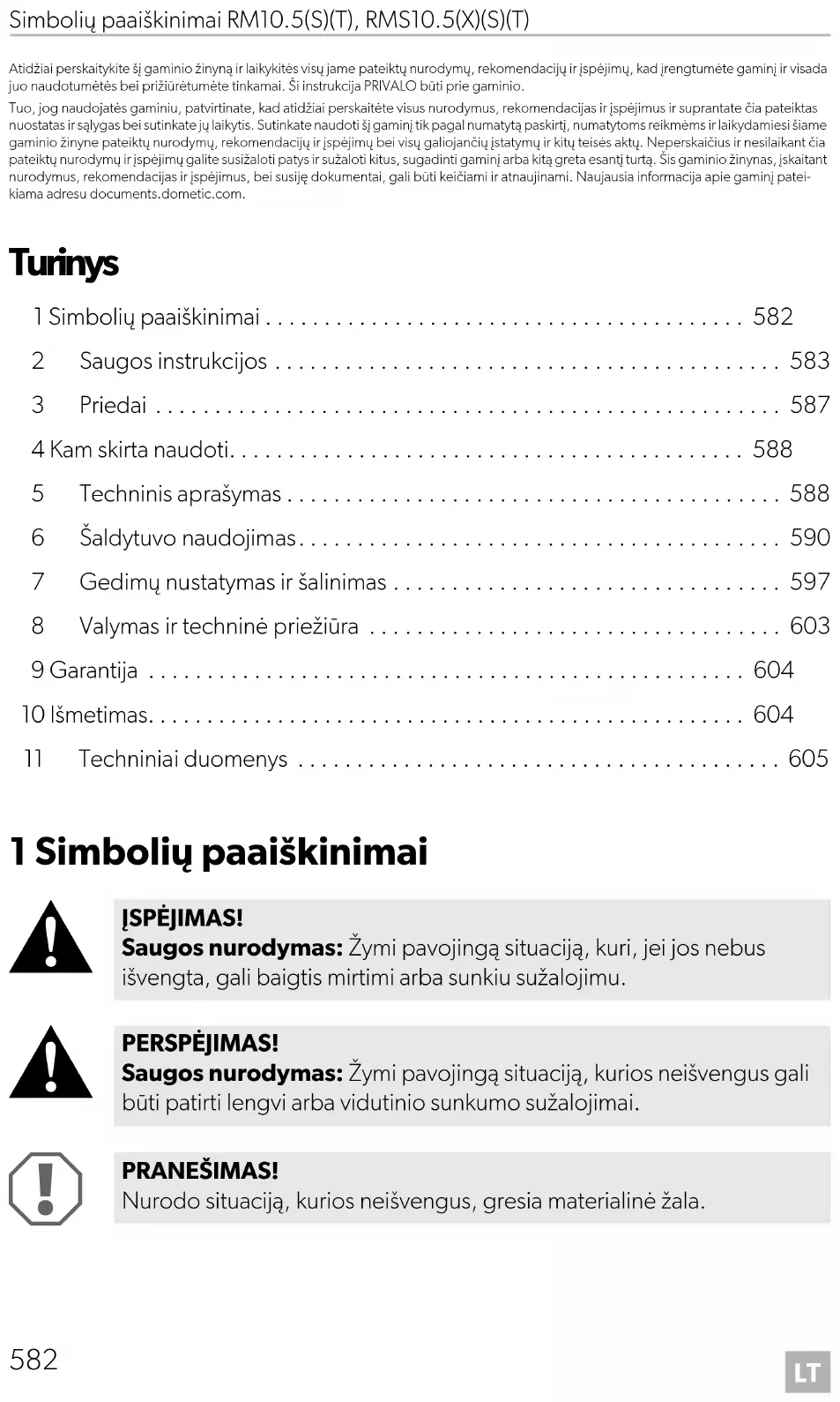 - Atidžiai perskaitykite šį gaminio žinyną ir laikykitės visų jame pateiktų nurodymų, rekomendacijų ir įspėjimų, kad įrengtumėte gaminį ir visada juo naudotumėtės bei prižiūrėtumėte tinkamai. Ši instrukcija PRIVALO būti prie gaminio. Tuo, jog naudojatės gaminiu, patvirtinate, kad atidžiai perskaitėte visus nurodymus, rekomendacijas ir įspėjimus ir suprantate čia pateiktas nuostatas ir sąlygas bei sutinkate jų laikytis. Sutinkate naudoti šį gaminį tik pagal numatytą paskirtį, numatytoms reikmėms ir laikydamiesi šiame gaminio žinyne pateiktų nurodymų, rekomendacijų ir įspėjimų bei visų galiojančių įstatymų ir kitų teisės aktų. Neperskaičius ir nesilaikant čia pateiktų nurodymų ir įspėjimų galite susižaloti patys ir sužaloti kitus, sugadinti gaminį arba kitą greta esantį turtą. Šis gaminio žinynas, įskaitant nurodymus, rekomendacijas ir įspėjimus, bei susiję dokumentai, gali būti keičiami ir atnaujinami. Naujausia informacija apie gaminį patei- kiama adresu documents.dometic.com. Turinys 1 Simbolių paaiškinimai p. 582