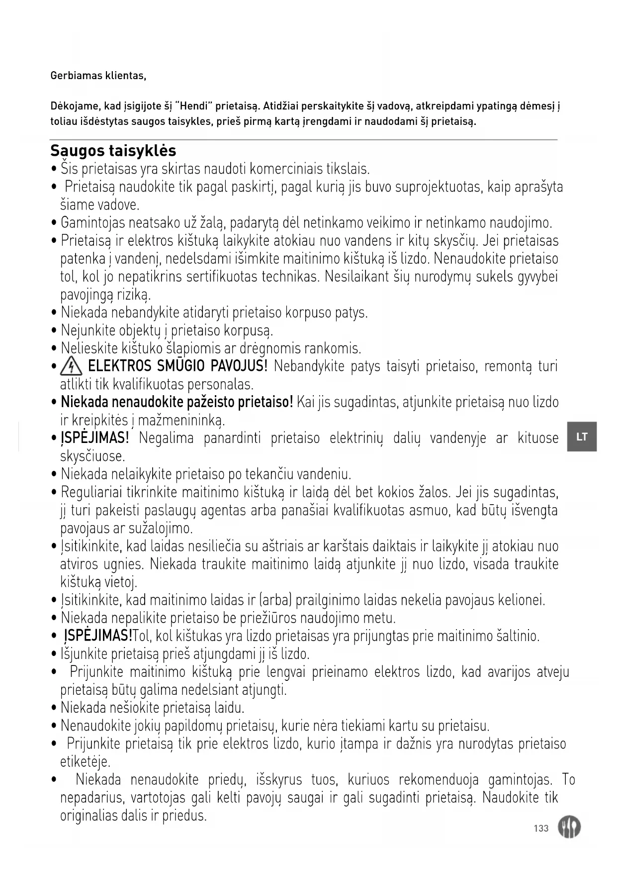 Gerbiamas klientas, Dėkojame, kad įsigijote šį “Hendi” prietaisą. Atidžiai perskaitykite šį vadovą, atkreipdami ypatingą dėmesį į toliau išdėstytas saugos taisykles, prieš pirmą kartą įrengdami ir naudodami šį prietaisą. Saugos taisyklės