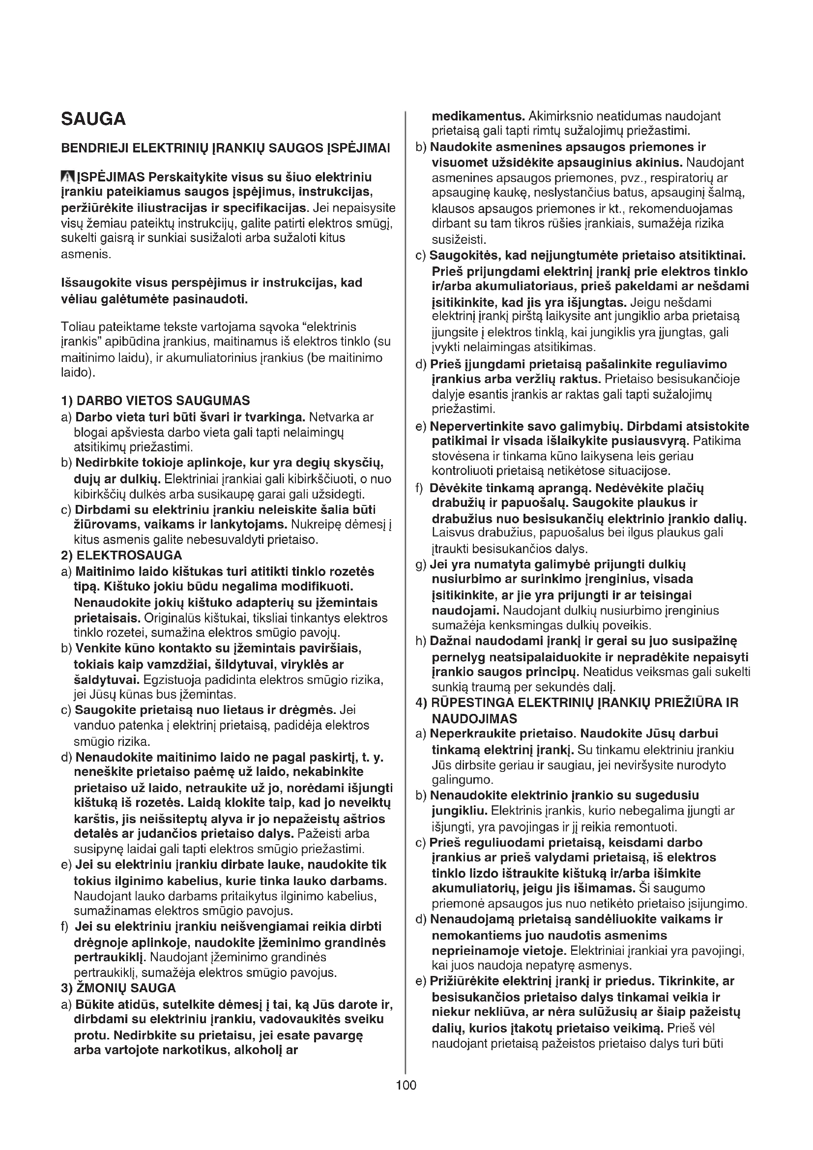 ĮSPĖJIMAS Perskaitykite visus su šiuo elektriniu įrankiu pateikiamus saugos įspėjimus, instrukcijas, peržiūrėkite iliustracijas ir specifikacijas. Jei nepaisysite visų žemiau pateiktų instrukcijų, galite patirti elektros smūgį, sukelti gaisrą ir sunkiai susižaloti arba sužaloti kitus asmenis. Išsaugokite visus perspėjimus ir instrukcijas, kad vėliau galėtumėte pasinaudoti. Toliau pateiktame tekste vartojama sąvoka “elektrinis įrankis” apibūdina įrankius, maitinamus iš elektros tinklo (su maitinimo laidu), ir akumuliatorinius įrankius (be maitinimo laido).