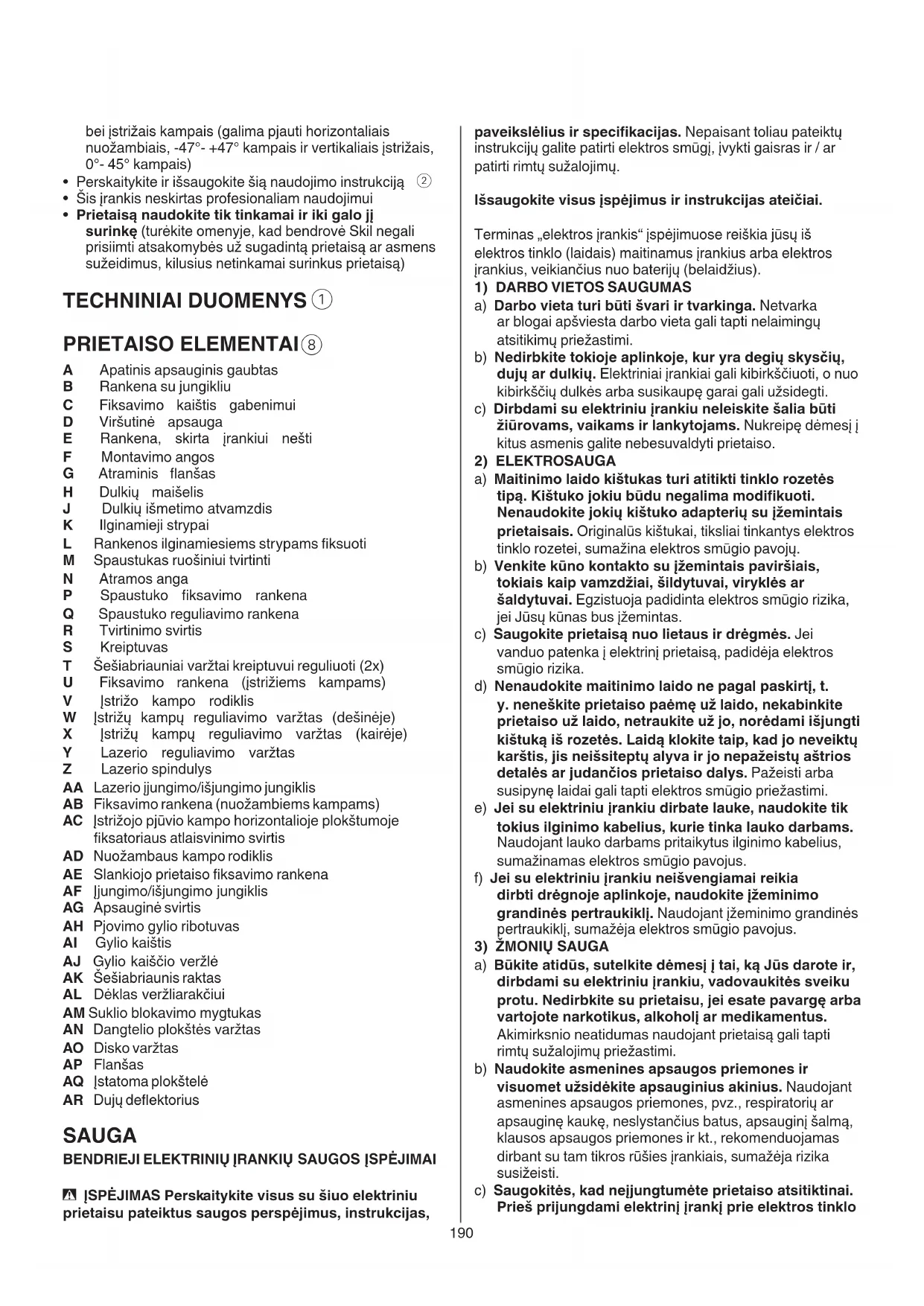 - ĮSPĖJIMAS Perskaitykite visus su šiuo elektriniu prietaisu pateiktus saugos perspėjimus, instrukcijas,191 rankenų ir suėmimo paviršių negalėsite saugiai išlaikyti ir suvaldyti įrankio netikėtose situacijose.