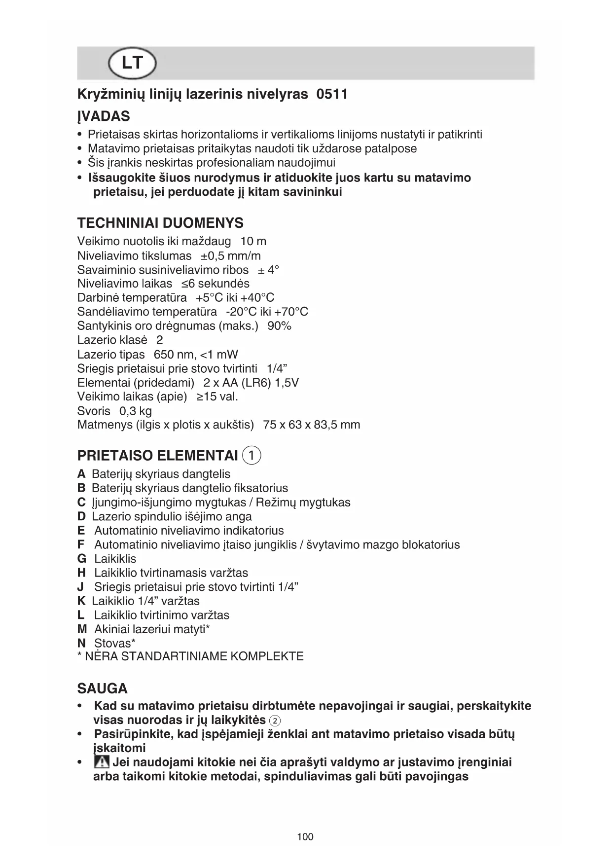 - Išsaugokite šiuos nurodymus ir atiduokite juos kartu su matavimo prietaisu,jeiperduodatejįkitamsavininkui TECHNINIAI DUOMENYS Veikimo nuotolis iki maždaug 10 m Niveliavimo tikslumas ±0,5 mm/m Savaiminio susiniveliavimo ribos ± 4° Niveliavimo laikas ≥6 sekundės Darbinė temperatūra +5°C iki +40°C Sandėliavimo temperatūra -20°C iki +70°C Santykinis oro drėgnumas (maks.) 90% Lazerio klasė 2 Lazerio tipas 650 nm, <1 mW Sriegis prietaisui prie stovo tvirtinti 1/4” Elementai (pridedami) 2 x AA (LR6) 1,5V Veikimo laikas (apie) ≤15 val. Svoris 0,3 kg Matmenys (ilgis x plotis x aukštis) 75 x 63 x 83,5 mm PRIETAISO ELEMENTAI 1 A Baterijų skyriaus dangtelis B Baterijų skyriaus dangtelio fiksatorius C Įjungimo-išjungimo mygtukas / Režimų mygtukas D Lazerio spindulio išėjimo anga E Automatinio niveliavimo indikatorius F Automatinio niveliavimo įtaiso jungiklis / švytavimo mazgo blokatorius G Laikiklis H Laikiklio tvirtinamasis varžtas J Sriegis prietaisui prie stovo tvirtinti 1/4” K Laikiklio 1/4” varžtas L Laikiklio tvirtinimo varžtas M Akiniai lazeriui matyti* N Stovas*