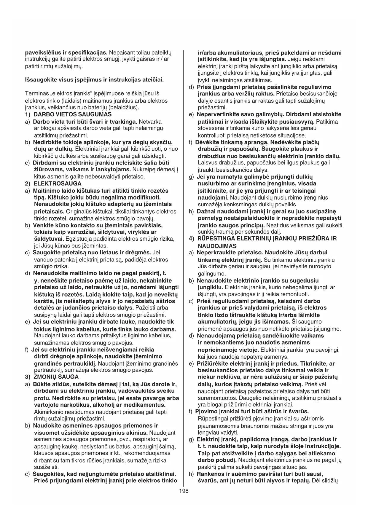 - Šis įrankis neskirtas profesionaliam naudojimui198 ir/arba akumuliatoriaus, prieš pakeldami ar nešdami įsitikinkite, kad jis yra išjungtas. Jeigu nešdami elektrinį įrankį pirštą laikysite ant jungiklio arba prietaisą įjungsite į elektros tinklą, kai jungiklis yra įjungtas, gali įvykti nelaimingas atsitikimas. d) Prieš įjungdami prietaisą pašalinkite reguliavimo įrankius arba veržlių raktus. Prietaiso besisukančioje dalyje esantis įrankis ar raktas gali tapti sužalojimų priežastimi. e) Nepervertinkite savo galimybių. Dirbdami atsistokite patikimai ir visada išlaikykite pusiausvyrą. Patikima stovėsena ir tinkama kūno laikysena leis geriau kontroliuoti prietaisą netikėtose situacijose. f) Dėvėkite tinkamą aprangą. Nedėvėkite plačių drabužių ir papuošalų. Saugokite plaukus ir drabužius nuo besisukančių elektrinio įrankio dalių. Laisvus drabužius, papuošalus bei ilgus plaukus gali įtraukti besisukančios dalys. g) Jei yra numatyta galimybė prijungti dulkių nusiurbimo ar surinkimo įrenginius, visada įsitikinkite, ar jie yra prijungti ir ar teisingai naudojami. Naudojant dulkių nusiurbimo įrenginius sumažėja kenksmingas dulkių poveikis. h) Dažnai naudodami įrankį ir gerai su juo susipažinę pernelyg neatsipalaiduokite ir nepradėkite nepaisyti įrankio saugos principų. Neatidus veiksmas gali sukelti sunkią traumą per sekundės dalį.