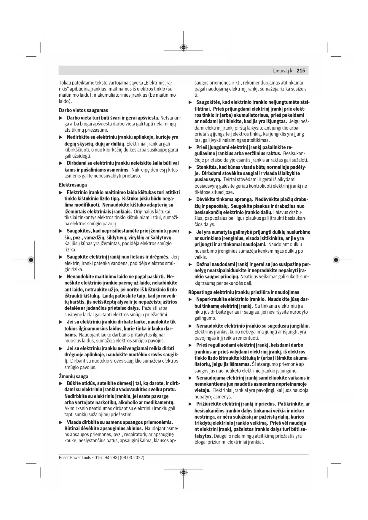 Pažeistas kištukinis lizdas, maitinimo laidas arba kroviklis Patikrinkite maitinimo įtampą, jei reikia, dėl kroviklio patikrinimo kreipkitės į autorizuotas Bosch elektrinių įrankių remonto dirbtuves Priežiūra ir servisas Techninė priežiūra, valymas ir sandėliavimas u Prieš pradėdami bet kokius sodo priežiūros įrankio tvarkymo darbus (pvz., techninės priežiūros, įrankio keitimo ar kt.), o taip pat norėdami transportuoti ar padėti sandėliuoti, iš sodo priežiūros įrankio išimkite akumuliatorių. Netyčia įjungus įjungimo-išjungimo jun- giklį iškyla susižalojimo pavojus. u Kad galėtumėte gerai ir saugiai dirbti, gaminį visada laikykite švarų. Ant sodo priežiūros įrankio nedėkite jokių daiktų. Kad galėtumėte gerai ir saugiai dirbti, pasirūpinkite, kad ga- minys ir jo ventiliacinės angos būtų švarūs. Gaminio niekada neapipurkškite vandeniu. Gaminio niekada nepanardinkite į vandenį. Gaminį laikykite saugioje, sausoje ir vaikams neprieinamoje vietoje. Ant gaminio nedėkite jokių kitų daiktų. Užtikrinkite, kad būtų tinkamai priveržtos visos veržlės, sraigtai ir varžtai, kad gaminys būtų saugus naudoti. Patikrinkite gaminį ir dėl saugumo pakeiskite susidėvėjusias ir pažeistas dalis. Įsitikinkite, kad keičiamos dalys yra Bosch pagamintos ar leistos naudoti. F 016 L94 293 | (08.03.2022) Bosch Power ToolsLietuvių k. | 221 Akumuliatoriaus priežiūra Kad akumuliatorius būtų optimaliai naudojamas, laikykitės šių reikalavimų ir nurodymų: – Saugokite akumuliatorių nuo drėgmės ir vandens. – Sodo priežiūros įrankį laikykite nuo –20 °C ik 50 °C tem- peratūroje. Pvz., vasarą nepalikite akumuliatoriaus auto- mobilyje. – Akumuliatorių laikykite ne sodo priežiūros įrankyje, o iš- imtą atskirai. – Tiesiogiai šviečiant saulei, akumuliatoriaus sodo priežiū- ros įrankyje nepalikite. – Optimali akumuliatoriaus sandėliavimo temperatūra yra 5°C. – Akumuliatoriaus ventiliacines angas valykite minkštu, šva- riu ir sausu teptuku. Jei veikimo laikas po įkrovimo pastebimai sutrumpėja, vadi- nasi akumuliatorius susidėvėjo ir jį reikia pakeisti. Klientų aptarnavimo skyrius ir konsultavimo tarnyba Klientų aptarnavimo skyriuje gausite atsakymus į klausimus, susijusius su jūsų gaminio remontu, technine priežiūra bei at- sarginėmis dalimis. Detalius brėžinius ir informacijos apie at- sargines dalis rasite interneto puslapyje: www.bosch-pt.com Bosch konsultavimo tarnybos specialistai mielai pakonsul- tuos Jus apie gaminius ir jų papildomą įrangą. Ieškant informacijos ir užsakant atsargines dalis prašome bū- tinai nurodyti dešimtženklį gaminio numerį, esantį firminėje lentelėje. Lietuva Bosch įrankių servisas Informacijos tarnyba: (037) 713350 ļrankių remontas: (037) 713352 Faksas: (037) 713354 El. paštas: service-pt@lv.bosch.com Kitus techninės priežiūros skyriaus adresus rasite čia: www.bosch-pt.com/serviceaddresses Transportavimas Rekomenduojamų ličio jonų akumuliatorių gabenimui taiko- mos pavojingų krovinių gabenimą reglamentuojančių įstaty- mų nuostatos. Naudotojui akumuliatorius gabenti keliais lei- džiama be jokių apribojimų. Jei siunčiant pasitelkiami tretieji asmenys (pvz., oro transpo- rtas, ekspedijavimo įmonė), būtina atsižvelgti į pakuotei ir ženklinimui taikomus ypatingus reikalavimus. Būtina, kad rengiant siuntą dalyvautų pavojingų krovinių gabenimo spe- cialistas. Siųskite tik tokius akumuliatorius, kurių nepažeistas kor- pusas. Apklijuokite kontaktus ir supakuokite akumuliatorių taip, kad jis pakuotėje nejudėtų. Taip pat laikykitės ir esamų papildomų nacionalinių taisyklių. Šalinimas Gaminiai, akumuliatoriai, papildoma įranga ir pakuotės turi būti ekologiškai utilizuojami. Gaminių, akumuliatorių / baterijų nemeskite į buitinių atliekų konteinerius! Tik ES šalims: Pagal Europos direktyvą 2012/19/ES, naudoti nebetinkami gaminiai ir, pagal Europos direktyvą 2006/66/EB, pažeisti ir išeikvoti akumuliatoriai / baterijos turi būti surenkami atski- rai ir perdirbami aplinkai nekenksmingu būdu. Netinkamai pašalintos elektros ir elektroninės įrangos atlie- kos dėl galimų pavojingų medžiagų gali turėti žalingą poveikį aplinkai ir žmonių sveikatai. Akumuliatoriai ir baterijos: Ličio jonų: prašome laikytis transportavimo skyriuje pateiktų nuorodų (žr. „Transportavimas“, Puslapis221). Bosch Power Tools F 016 L94 293 | (08.03.2022)222 | يبرع