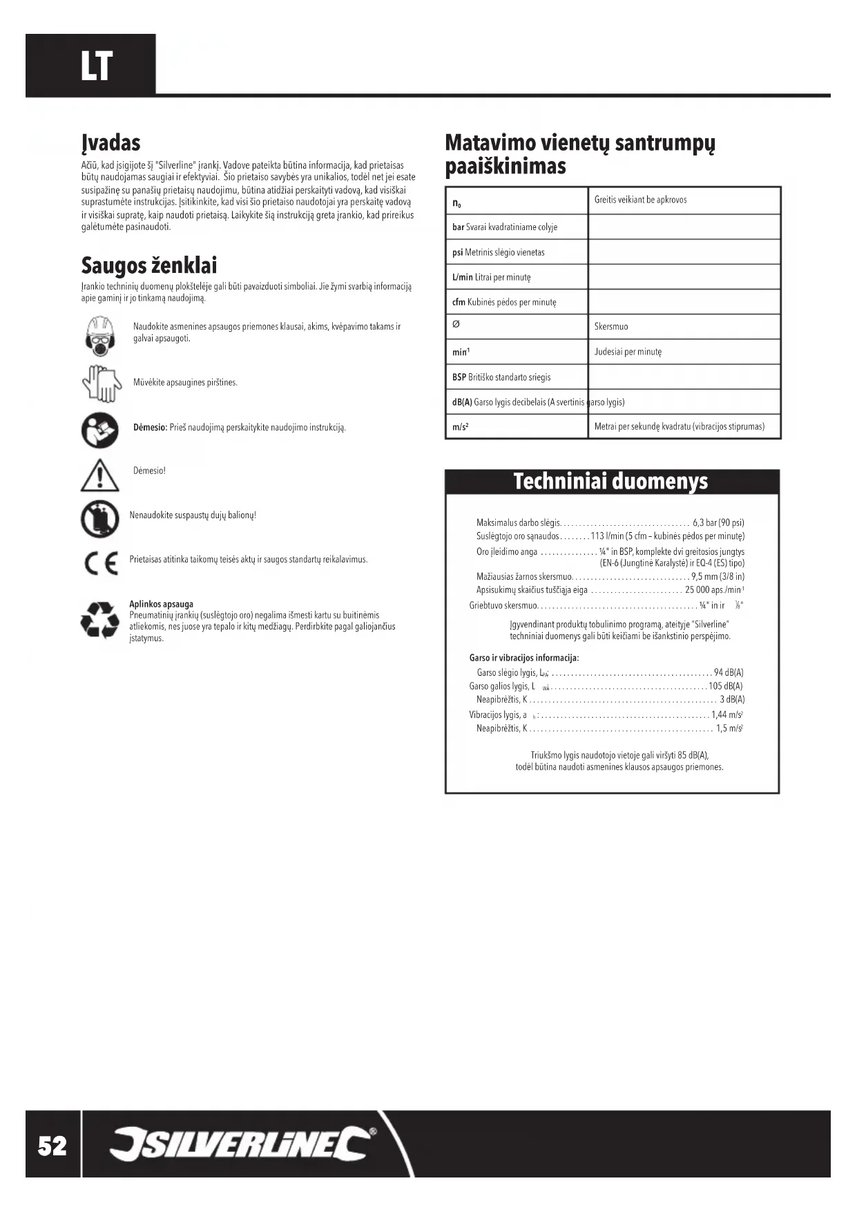 Saugos ženklai Įrankiotechniniųduomenųplokštelėjegalibūtipavaizduotisimboliai.Jiežymisvarbiąinformacijąapiegaminįirjotinkamąnaudojimą.Naudokiteasmeninesapsaugospriemonesklausai,akims,kvėpavimotakamsirgalvai apsaugoti.Mūvėkiteapsauginespirštines.Dėmesio:Priešnaudojimąperskaitykitenaudojimoinstrukciją.Dėmesio!Nenaudokitesuspaustųdujųbalionų!Prietaisasatitinkataikomųteisėsaktųirsaugosstandartųreikalavimus.Aplinkos apsauga Pneumatiniųįrankių(suslėgtojooro)negalimaišmestikartusubuitinėmisatliekomis,nesjuoseyratepaloirkitųmedžiagų.Perdirbkitepagalgaliojančiusįstatymus. Įvadas Ačiū,kadįsigijotešį"Silverline"įrankį.Vadovepateiktabūtinainformacija,kadprietaisasbūtųnaudojamassaugiaiirefektyviai.Šioprietaisosavybėsyraunikalios,todėlnetjeiesatesusipažinęsupanašiųprietaisųnaudojimu,būtinaatidžiaiperskaitytivadovą,kadvisiškaisuprastumėteinstrukcijas.Įsitikinkite,kadvisišioprietaisonaudotojaiyraperskaitęvadovąirvisiškaisupratę,kaipnaudotiprietaisą.Laikykitešiąinstrukcijągretaįrankio,kadprireikusgalėtumėtepasinaudoti.