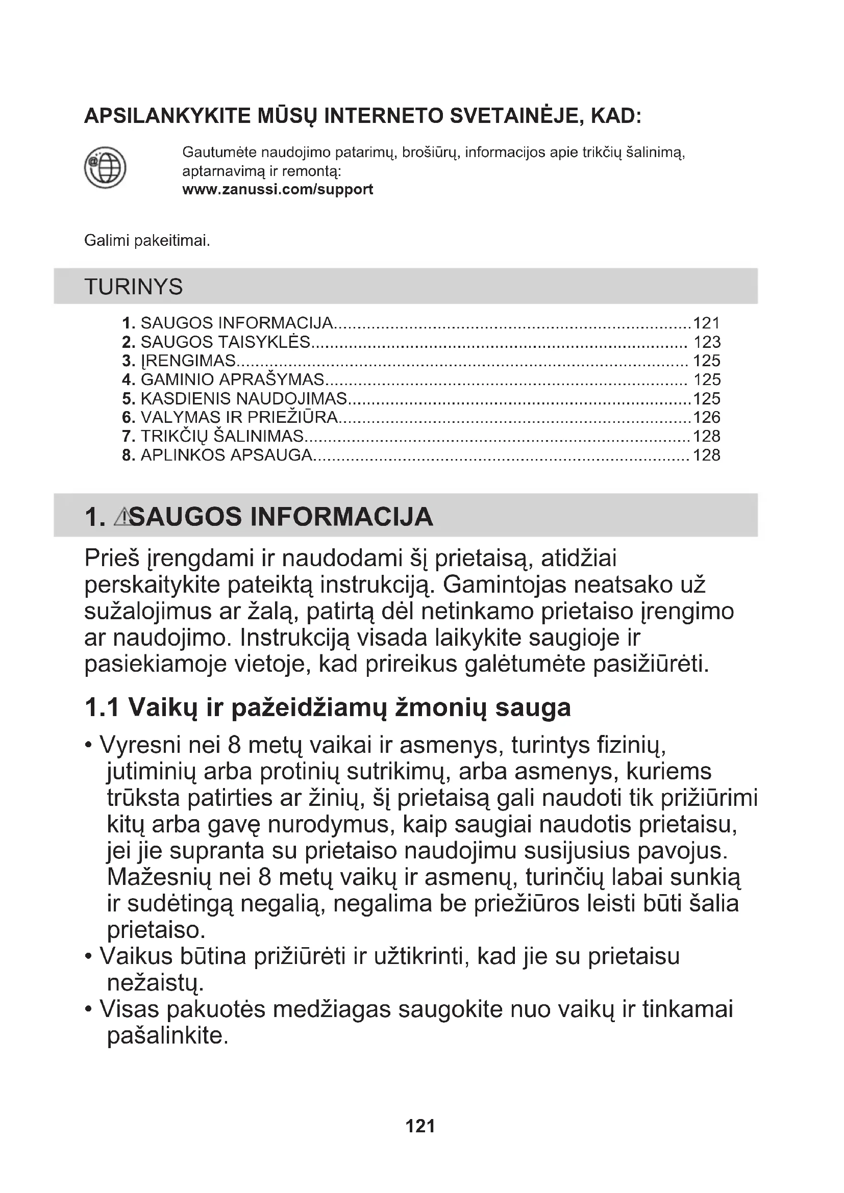 Atiduokite perdirbti medžiagas, pažymėtas šiuo ženklu . Išmeskite pakuotę į atitinkamą atliekų surinkimo konteinerį, kad ji būtų perdirbta. Padėkite saugoti aplinką bei žmonių sveikatą ir surinkti bei perdirbti elektros ir elektronikos prietaisų atliekas. Neišmeskite šiuo ženklu pažymėtų prietaisų kartu su kitomis buitinėmis atliekomis. Atiduokite šį gaminį į vietos atliekų surinkimo punktą arba susisiekite su vietos savivaldybe dėl papildomos informacijos. 128APMEKLĒJIET MŪSU TĪMEKĻA VIETNI, LAI: Saņemtu lietošanas ieteikumus un brošūras, kā arī problēmu novēršanas, servisa unremonta informāciju:www.zanussi.com/supportIzmaiņu tiesības rezervētas. SATURS