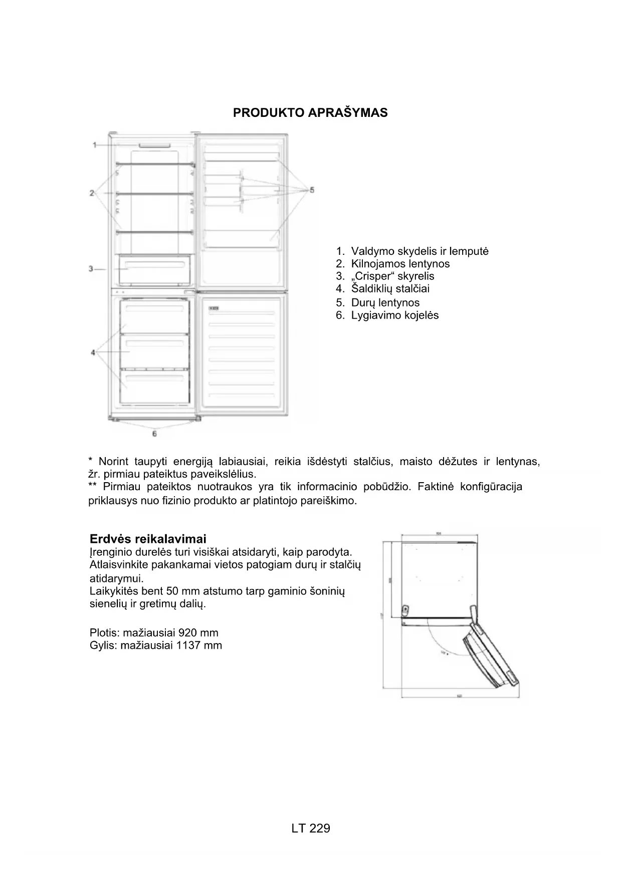 - Vidaus apšvietimo lemputė neįsijungia. ● Nėra elektros tiekimo. Netinkamai prijungtas maitinimo laidas. Patikrinkite, ar prietaisas išjungtas (žr. skyrių „Temperatūros reguliavimas“). Patikrinkite, ar tinkamai veikia maitinimo lizdas (pvz., naudodami kitą elektros prietaisą). ● Aktyvintas „Holiday“ režimas. Išjunkite „Holiday“ režimą. Šaldytuvo ir (arba) šaldiklio vidinė temperatūra nepakankamai žema. ● Neuždarytos durelės. Patikrinkite, ar durelės ir tarpikliai tinkamai užsidaro. ● Durelės dažnai atidarinėjamos. Kurį laiką neatidarinėkite be reikalo durelių. ● Netinkamas temperatūros nustatymas. Patikrinkite temperatūros nustatymą ir, jei įmanoma, nustatykite žemesnę temperatūrą (žr. skyrių „Temperatūros reguliavimas“). ● Šaldytuvas ir (arba) šaldiklis perpildytas. Palaukite, kol stabilizuosis šaldytuvo / šaldiklio temperatūra. Neperpildykite šaldytuvo ir šaldiklio. ● Aplinkos temperatūra per žema. Perkelkite įrenginį į šiltesnę vietą arba pašildykite esamą patalpą. ● Padėta šilto maisto. Prieš padėdami šaldytuve palaukite, kol maistas atvės. Šaldytuve esantis maistas užšąla. ● Netinkamas temperatūros nustatymas. Patikrinkite temperatūros nustatymą ir, jei įmanoma, padidinkite temperatūrą. ● Maisto produktai liečiasi prie galinės sienelės. Laikykite maistą toliau nuo šaldytuvo galinės sienelės. Šaldytuvo skyriaus dugnas yra drėgnas arba ant jo yra vandens lašelių. ● Gali būti užsikimšęs drenažo vamzdelis. Išvalykite drenažo vamzdelį pagaliuku ar panašiu daiktu, kad nutekėtų vanduo. Ant galinės šaldytuvo sienelės yra vandens lašelių arba šerkšno. ● Priklausomai nuo funkcijos, veikimo metu ant šaldytuvo galinės sienelės gali susidaryti vandens lašelių arba šerkšno. Tai nėra defektas. ● Padėta šilto maisto. Prieš padėdami šaldytuve palaukite, kol maistas atvės. ● Padėta atidarytų indų su maistu ar skysčiais. Visuomet uždenkite maistą ir skysčius. ● Neuždarytos durelės. Patikrinkite, ar durelės ir tarpikliai tinkamai užsidaro. ● Durelės dažnai atidarinėjamos. Kurį laiką neatidarinėkite be reikalo durelių. Vanduo daržovių stalčiuje. ● Nepakankama oro cirkuliacija. Patikrinkite, ar prietaisas neperpildytas. ● Sudėtos per daug drėgmės turinčios daržovės ir vaisiai. Vaisius ir daržoves apvyniokite plastikine medžiaga, pvz., vyniojamąja plėvele, sudėkite į maišelius ar talpyklas. Variklis veikia nepertraukiamai. ● Neuždarytos durelės. Įsitikinkite, kad durelės uždarytos ir, patikrinkite, ar tarpikliai tinkamai priglunda. ● Durelės dažnai atidarinėjamos. Kurį laiką neatidarinėkite be reikalo durelių. ● Aplinkos temperatūra yra labai aukšta. Patikrinkite, ar aplinkos temperatūra atitinka prietaiso specifikacijų lentelėje nurodytą diapazoną. Ekrane / termostate nustatykite didesnę temperatūrą. ● Prietaisas kurį laiką buvo išjungtas (be maitinimo). Paprastai užtrunka 8–12 val., kol prietaisas visiškai atvės. Šaldyti maisto produktai atitirpsta. ● Aplinkos temperatūra per žema. Perkelkite įrenginį į šiltesnę vietą arba pašildykite esamą patalpą. ● Šaldiklio durelės neuždarytos. Įsitikinkite, kad durelės uždarytos ir kad tarpiklis tinkamai priglunda. Šaldytuvo durelių signalas. ● Šaldytuvo durelių garsinis signalas (pyptelėjimas) įsijungia, jei durelės paliekamos atidarytos ilgiau nei 3 minutes. Nepalikite durelių atidarytų, kai to nereikia. Garsinis signalas išjungiamas uždarius dureles. Iš prietaiso girdimi garsai, pvz., kliuksėjimas, zvimbimas, traškėjimas ar girgždėjimas. ● Nėra gedimo. Veikia variklis, pvz., šaldymo įrenginio, ventiliatoriaus. Į vamzdžius teka šaltnešio. Įjungiamas arba išjungiamas variklis, jungikliai ir magnetiniai vožtuvai. Nereikia imtis jokių veiksmų. ● Prietaisas pastatytas ant nelygaus paviršiaus. Sureguliuokite kojeles, kad sulygiuotumėte prietaisą. ● Prietaisas liečia šalia jo esantį objektą. Pašalinkite aplink prietaisą esančius objektus. Prietaisas nevėsina, dega temperatūros ir apšvietimo indikatoriai. ● Aktyvintas demonstracinis režimas. Išjunkite demonstracinį režimą. Šaldiklio skyriuje susidaro daug ledo ir šerkšno. ● Netinkamai supakuoti produktai. Visada gerai supakuokite produktus. ● Nesandariai uždarytos prietaiso durelės ir (arba) stalčius. Uždarykite dureles ir (arba) stalčių. ● Durelės ir (arba) stalčius buvo atidaromi per dažnai arba per ilgai. Neatidarinėkite durelių ir (arba) stalčiaus per dažnai. ● Durelių ir (arba) stalčiaus tarpiklis yra nešvarus, susidėvėjęs, įtrūkęs arba nesutampa jo prigludimas. Nuvalykite durelių ir (arba) stalčiaus tarpiklį arba pakeiskite jį nauju. ● Kažkas viduje trukdo tinkamai uždaryti dureles ir (arba) stalčių. Pakeiskite lentynų, durelių lentynėlių ar vidinių talpyklų padėtį, kad būtų galima uždaryti dureles ir (arba) stalčių. Įšyla prietaiso šonai. ● Tai normalu.LV 237 Kopsavilkums PRODUKTA APRAKSTS p. 238