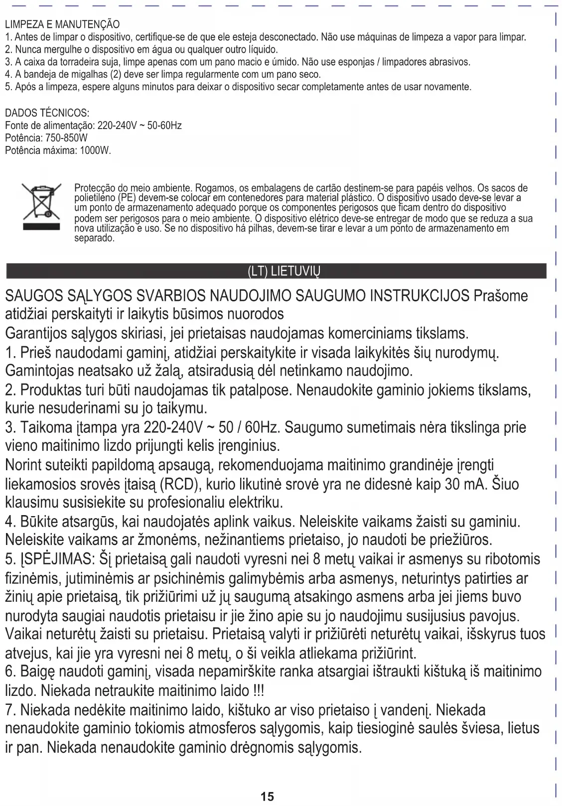 TECHNINIAI DUOMENYS: Maitinimas: 220–240 V ~ 50–60 Hz Galia: 750-850W Maksimali galia: 1000W Rūpinantis aplinka. Kartono pakuotes atiduoti į makulatūrą. Polietileno (PE) maišelius mesti į plastikui skirtą konteinerį. Susidėvėjusį prietaisą atiduoti į atitinkamą atliekų surinkimo vietą, nes prietaise esančios pavojingos medžiagos gali kelti grėsmę aplinkai. Elektrinį prietaisą atiduoti tokį, kad nebūtų galima jo pakartotinai naudoti ir panaudoti. Jeigu prietaise yra baterijos, būtina jas išimti ir atskirai atiduoti į atliekų surinkimo vietą. Nemesti prietaiso į buitinių atliekų konteinerį! DROŠĪBAS NOSACĪJUMI SVARĪGI NORĀDĪJUMI PAR LIETOŠANAS DROŠĪBU LŪDZU, RŪPĪGI LASIET UN UZGLABĀT NĀKOTNES ATSAUCES Garantijas nosacījumi ir atšķirīgi, ja ierīci izmanto komerciāliem mērķiem.