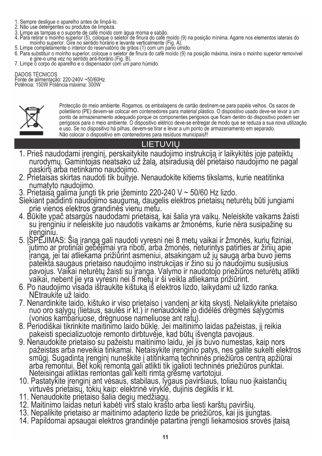 2. Nuimkite dangtelį (2) ir supilkite kavos pupeles į bunkerį (1). Nepildykite virš „maksimalaus“ lygio. Uždėkite pupelių bunkerio dangtį ir įsitikinkite, kad jis yra tinkamoje padėtyje. 1. Įdėkite maltos kavos laikiklį (6) ir maltos kavos laikiklio dangtelį (7) į prietaiso korpusą ir įsitikinkite, kad jie yra tinkamai išdėstyti. Nemesti prietaiso į buitinių atliekų konteinerį! Rūpinantis aplinka. Kartono pakuotes atiduoti į makulatūrą. Polietileno (PE) maišelius mesti į plastikui skirtą konteinerį. Susidėvėjusį prietaisą atiduoti į atitinkamą atliekų surinkimo vietą, nes prietaise esančios pavojingos medžiagos gali kelti grėsmę aplinkai. Elektrinį prietaisą atiduoti tokį, kad nebūtų galima jo pakartotinai naudoti ir panaudoti. Jeigu prietaise yra baterijos, būtina jas išimti ir atskirai atiduoti į atliekų surinkimo vietą. LATVIEŠU