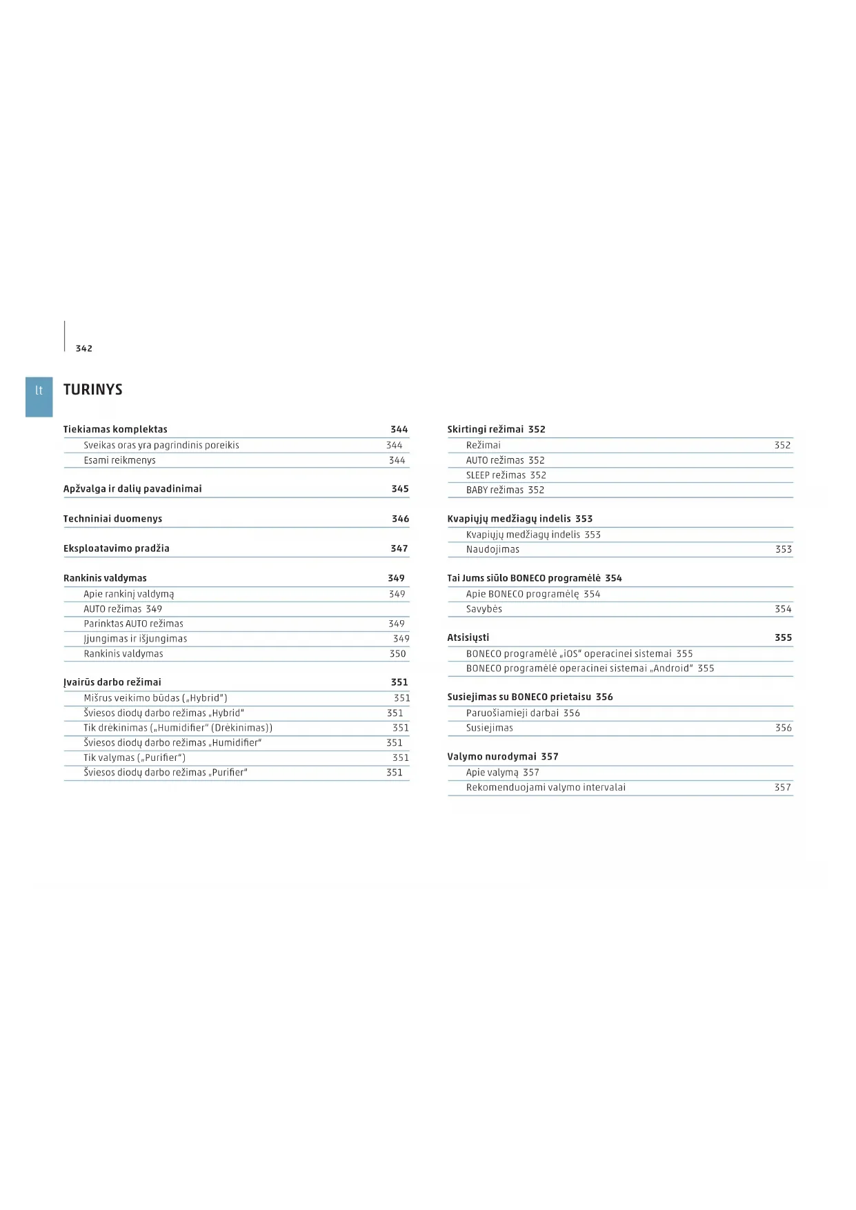 TURINYS Skirtingi režimai 352 Režimai 352 AUTO režimas 352 SLEEP režimas 352 BABY režimas 352 Kvapiųjų medžiagų indelis 353 Kvapiųjų medžiagų indelis 353 Naudojimas 353 Tai Jums siūlo BONECO programėlė 354 Apie BONECO programėlę 354 Savybės 354 Atsisiųsti 355 BONECO programėlė „iOS“ operacinei sistemai 355 BONECO programėlė operacinei sistemai „Android“ 355 Susiejimas su BONECO prietaisu 356 Paruošiamieji darbai 356 Susiejimas 356 Valymo nurodymai 357 Apie valymą 357 Rekomenduojami valymo intervalai 357 Tiekiamas komplektas 344 Sveikas oras yra pagrindinis poreikis 344 Esami reikmenys 344 Apžvalga ir dalių pavadinimai 345 Techniniai duomenys 346 Eksploatavimo pradžia 347 Rankinis valdymas 349 Apie rankinį valdymą 349 AUTO režimas 349 Parinktas AUTO režimas 349 Įjungimas ir išjungimas 349 Rankinis valdymas 350 Įvairūs darbo režimai 351 Mišrus veikimo būdas („Hybrid“) 351 Šviesos diodų darbo režimas „Hybrid“ 351 Tik drėkinimas („Humidifier“ (Drėkinimas)) 351 Šviesos diodų darbo režimas „Humidifier“ 351 Tik valymas („Purifier“) 351 Šviesos diodų darbo režimas „Purifier“ 351343