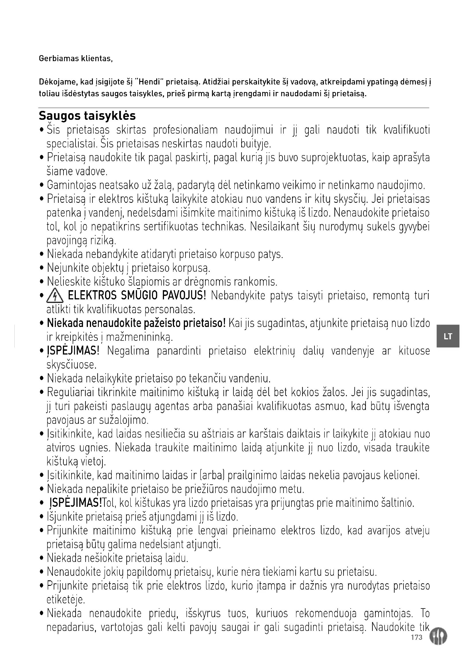Gerbiamas klientas, Dėkojame, kad įsigijote šį “Hendi” prietaisą. Atidžiai perskaitykite šį vadovą, atkreipdami ypatingą dėmesį į toliau išdėstytas saugos taisykles, prieš pirmą kartą įrengdami ir naudodami šį prietaisą. Saugos taisyklės