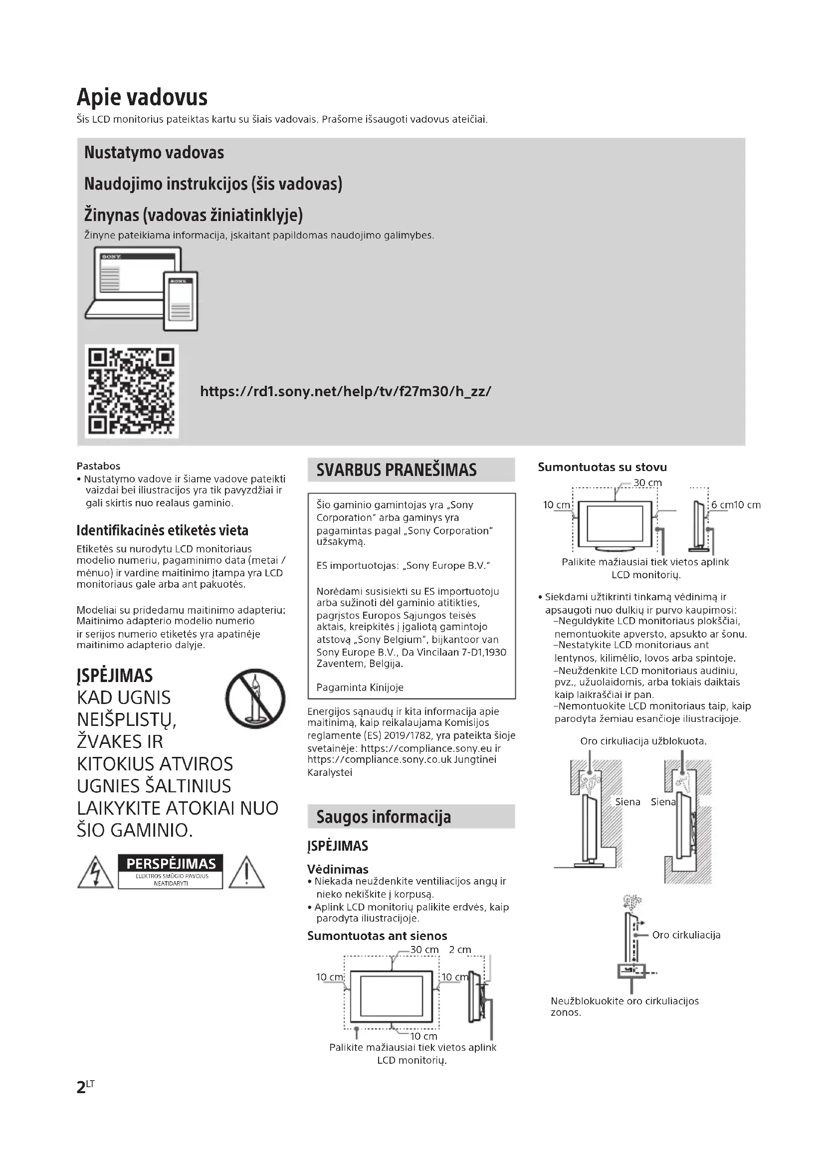 Šiogaminiogamintojasyra„SonyCorporation“arbagaminysyrapagamintaspagal„SonyCorporation“užsakymą.ESimportuotojas:„SonyEuropeB.V.“NorėdamisusisiektisuESimportuotojuarbasužinotidėlgaminioatitikties,pagrįstosEuroposSąjungosteisėsaktais,kreipkitėsįįgaliotągamintojoatstovą„SonyBelgium“,bijkantoorvanSonyEuropeB.V.,DaVincilaan7-D1,1930Zaventem,Belgija.PagamintaKinijojeEnergijossąnaudųirkitainformacijaapiemaitinimą,kaipreikalaujamaKomisijosreglamente(ES)2019/1782,yrapateiktašiojesvetainėje:https://compliance.sony.euirhttps://compliance.sony.co.ukJungtineiKaralystei Saugos informacija ĮSPĖJIMAS Vėdinimas•Niekadaneuždenkiteventiliacijosangųirniekonekiškiteįkorpusą.•AplinkLCDmonitoriųpalikiteerdvės,kaipparodytailiustracijoje.Sumontuotas ant sienosPalikitemažiausiaitiekvietosaplinkLCDmonitorių.10cm30cm 2cm10cm10cmSumontuotas su stovuPalikitemažiausiaitiekvietosaplinkLCDmonitorių.6cm10cm30cm10cm•Siekdamiužtikrintitinkamąvėdinimąirapsaugotinuodulkiųirpurvokaupimosi:– NeguldykiteLCDmonitoriausplokščiai,nemontuokiteapversto,apsuktoaršonu.– NestatykiteLCDmonitoriausantlentynos,kilimėlio,lovosarbaspintoje.– NeuždenkiteLCDmonitoriausaudiniu,pvz.,užuolaidomis,arbatokiaisdaiktaiskaiplaikraščiaiirpan.– NemontuokiteLCDmonitoriaustaip,kaipparodytažemiauesančiojeiliustracijoje.Orocirkuliacijaužblokuota.Siena SienaOrocirkuliacijaNeužblokuokiteorocirkuliacijoszonos. Apie vadovus ŠisLCDmonitoriuspateiktaskartusušiaisvadovais.Prašomeišsaugotivadovusateičiai. Nustatymo vadovas Naudojimo instrukcijos (šis vadovas) Žinynas (vadovas žiniatinklyje) Žinynepateikiamainformacija,įskaitantpapildomasnaudojimogalimybes.https://rd1.sony.net/help/tv/f27m30/h_zz/SDM-F27M30 5-047-045-31(1)