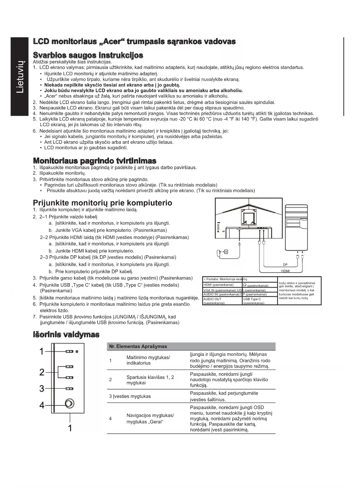(įprastas) Kontrastingumas 100000000:1 maks. (ACM) Žiūrėjimo kampas 178° (H) 178° (V) (CR = 10) Atsako laikas 1 ms (VRB) Plokštės tipas VA H dažnis HDMI: 31,469–192,692 KHz DP: 31,469–192,692 KHz V dažnis HDMI: 48–165 Hz DP: 48–165 Hz Ekrano spalvos 16,7 mln. spalvų Taškų dažnis HDMI: 393,092 MHz DP: 393,092 MHz Maksimali skyra HDMI: 1920 × 1080, esant 165 Hz DP: 1920 × 1080, esant 165 Hz Funkcija „Plug & Play“ VESA DDCCI / DDC2B Energijos sunaudojimas Įjungimo režimas 21 W (įprastos) Miego režimu 0,5 W (įprastos) Išjungimo režimu 0,3 W (įprastos) Įvesties jungtis HDMI (tik HDMI įvesties modelio) (pasirenkamai) DP (tik DP įvesties modelyje) (pasirenkamai) Vaizdo signalų įvesties lizdas HDMI (tik HDMI įvesties modelio) (pasirenkamai) DP (tik DP įvesties modelyje) (pasirenkamai) Garsiakalbiai 2 W x 2 (tik garso įvesties modelis) (pasirenkamai) Didžiausias ekrano dydis Horizontaliai: 527 mm Vertikaliai: 296 mm Maitinimo šaltinis ĮVESTIS: 100–240 V ~ 50 / 60 Hz Aplinkos sąlygos Darbo aplinkos temperatūra: nuo 0 iki 40 °C Laikymo temp.: nuo -20 iki 60 °C Darbo aplinkos oro drėgnumas: nuo 20 % iki 80 % Matmenys 540,3 (P) x 375,0-495,0 (A) x 234,0 (G) mm Svoris (bendrasis) 4,30 Kg (grynasis) Mechanizmo techninės savybės Posvyris: nuo -5° iki +25° Pakreipimas: +/-360° Aukščio reguliavimas: 120 mm Pasukimas: +/-90° Nuimamas pagrindo stovas: taip Išoriniai valdikliai Jungiklis / mygtukai Maitinimo mygtukas 1 spartusis klavišas 2 spartusis klavišas Įvestis Meniu/Navigacija/Gerai Funkcijos Šviesumas Kontrastingumas Silpna mėlyna šviesa Juodos spalvos didinimo režimas ACM HDR Itin didelis ryškumas Gama Spalvų temperatūra Režimai Spalvų Erdvei Pilkumo tono režimas 6 ašių atspalviai 6 ašių spalvinis sodrumas Garsumas Nutildyti Pagreitinimas FreeSync Premium VRB Atnaujinimo sparta Itin maža gaištis Taikymo taškas Kalba OSD delsa Skaidrumas OSD užraktas Įvestis Automatinis šaltinis Plačiaformatis režimas Sparčiųjų klavišų priskyrimas DDC/CI HDMI juodumo lygis Greitojo parengimo režimas Informacija Atstatyti visus nustatymus Specifikacijos priklauso nuo modelio ir (arba) regiono. Naudotojų vadovus ir kitus „Acer“ įrenginių dokumentus rasite oficialioje „Acer“ pagalbos tinklavietėje.Latviski Acer LCD monitora īsā darba sākšanas rokasgrāmata Svarīgas drošības instrukcijas Lūdzu, uzmanīgi izlasiet tālāk sniegtās instrukcijas. 1. LCD displeja ekrāna tīrīšana: vispirms pārliecinieties, ka izmantotais strāvas adapteris atbilst elektrostandartiem jūsu reģionā.