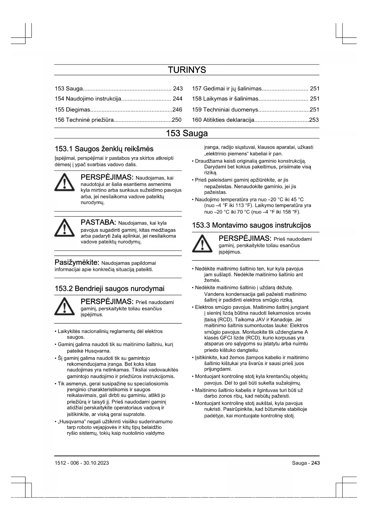 - Montuojant kontrolinę stotį aukštai, kyla pavojus nukristi. Pasirūpinkite, kad būtumėte stabilioje padėtyje, kai montuojate kontrolinę stotį. 1512 - 006 - 30.10.2023 Sauga - 243153.4 Priežiūros saugos instrukcijos PERSPĖJIMAS: Prieš naudodami gaminį, perskaitykite toliau esančius įspėjimus.